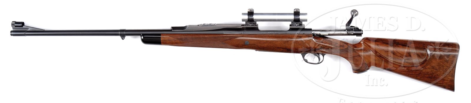 *GRIFFIN & HOWE CUSTOM WINCHESTER MODEL 70.SN 305242. Cal. .243 Winchester. This fine rifle, G & H no. 2541, made in the mid 1960’s, has 24″ medium weight round bbl, fitted with quarter rib, which extends back over receiver ring. Rib is stippled on top, and fitted with two folding leaf express sights with gold lines. Bbl is also fitted with banded-on sling eye, and front ramp with knurled sight protector holding gold bead front sight. Top of bbl is engraved “No 2541 GRIFFIN & HOWE, INC. NY. NY.” Pre 64 Model 70 action has had bolt release expanded and nicely checkered, and has been fitted with G&H type scope bases on tops of receiver ring and bridge. Bolt body, extractor, and right runway have been engine turned. Pear-shaped bolt knob has five teardrops of well cut checkering around outer diameter with engraved floral tip. Bottom metal has had bow machined to accept button floorplate release. A commercial trigger has been installed. Exceptionally fine, smoky marbled, and lightly figured French walnut steel capped pistol grip stock measures 13-1/2″ over Niedner type checkered buttplate. Stock features classic G&H styling with swept shadow line right hand cheekpiece, point pattern checkering with mullered borders, engraved recoil bolt, ebony forend tip, and deeply chamfered cartridge ejection port. Rifle comes with G&H top mount scope rings holding aluminum tube. Drop at heel: approx 2-3/8″, drop at comb: approx 1-5/8″. Weight: 9 lbs 0 oz. LOP: 13-1/2″. CONDITION: Excellent, retaining nearly all of its custom finishes on wood and metal, with a number of light handling marks on wood, and a fairly deep dent in front portion of cheekpiece flare. Bore is excellent. Action is smooth. 49296-4 MGM408 (4,500-6,500) – Lot 2438