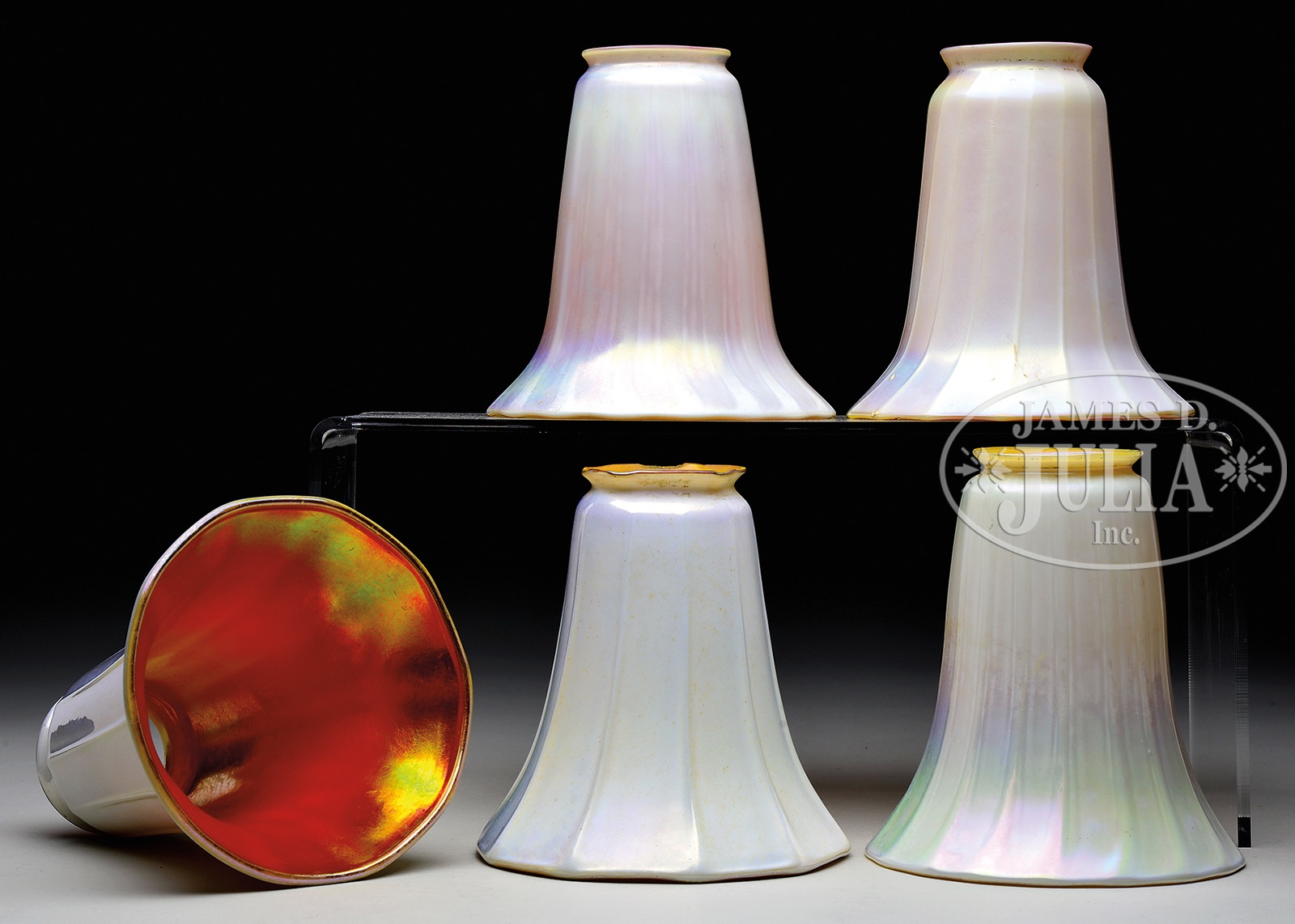 FIVE RIBBED ART GLASS SHADES.Lot consists of one white opalescent shade with opalescent ribbons extending vertically up the shade with bright gold iridescent interior. Lot also includes four miscellaneous shades with white lightly iridescent ribbed bodies and gold iridescent interiors. One of the shades is signed “Lustre Art” while the other three are unsigned. SIZE: Each is approx 5-1/2″ t. CONDITION: Three of the white ribbed shades have chips to fitter. Otherwise very good to excellent. 5-68018 (400-600) – Lot 2439