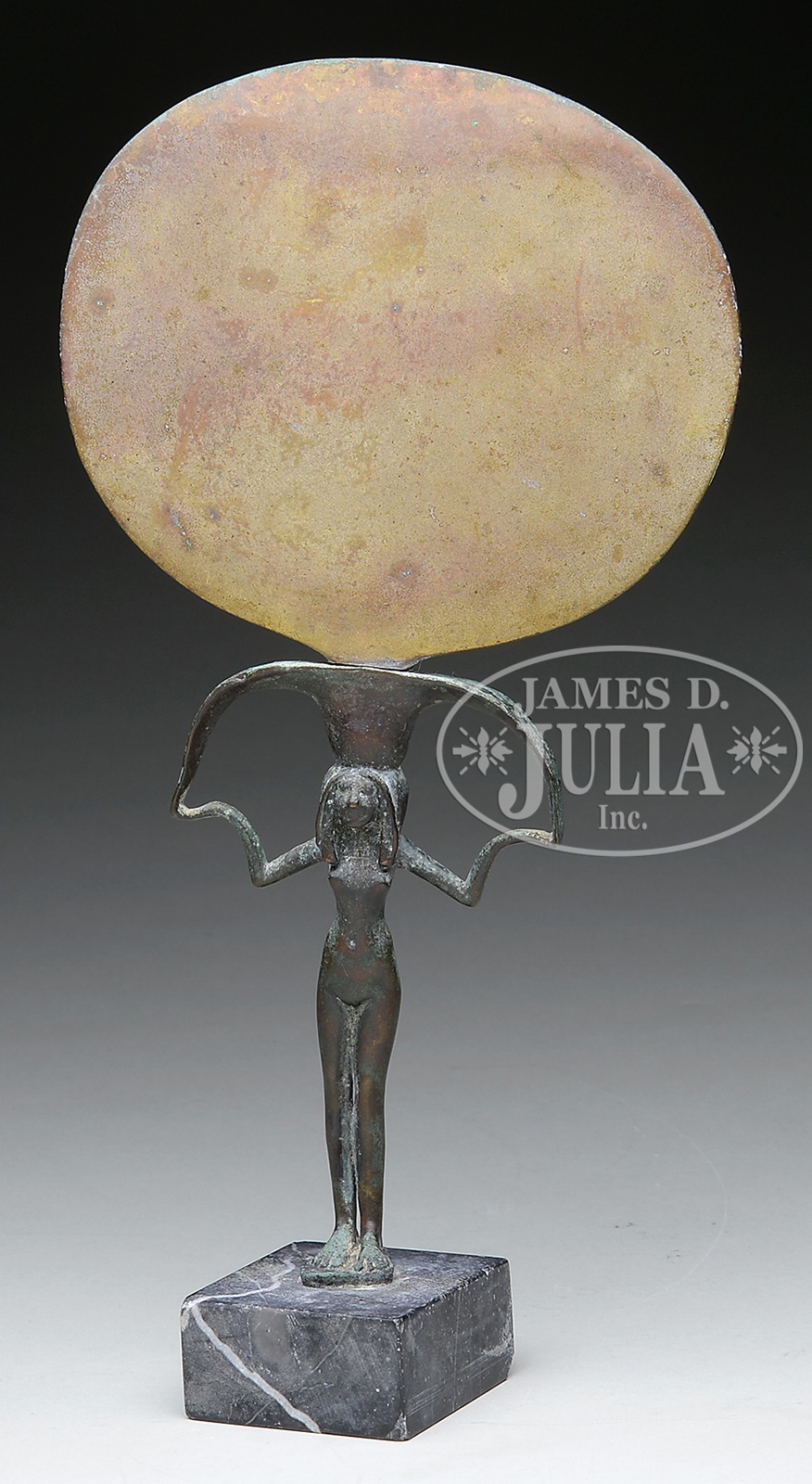 OUTSTANDING BRONZE EGYPTIAN “NEW KINGDOM” MIRROR.Probably between the 16th and 11th Century BC. The bronze nude figure of a woman with arms outstretched holding a yoke which supports an oval 5-1/2″ x 6-1/2″ bronze mirror. The figure mounted to a black marble block. SIZE: Bronze: 11-3/4″; Total 13″. CONDITION: Very good. 50414-3 (2,000-4,000) – Lot 2439