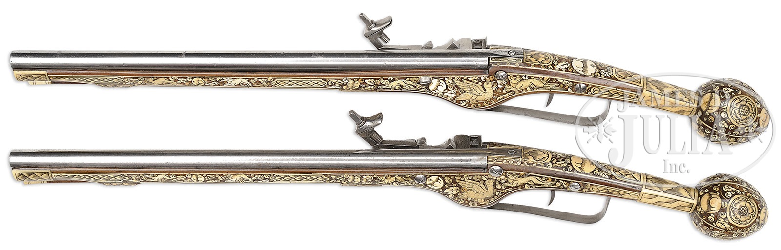 COMPOSITE PAIR OF LONG INLAID GERMAN WHEEL LOCK HOLSTER PISTOLS, PARTLY 17TH CENTURY.SN NSN. Classic pair of long wheel lock holster pistols utilizing period locks and bbls, restocked in the 19th century. Stocks elaborately inlaid with white stag horn featuring dogs, foxes, rabbits, birds, enriched with flowers, hop leaves and horn pellets and scroll work throughout. Plain military style locks with external wheel and wheel retaining bracket. Said to be Dutch, but equally likely Germanic in origin. Engraved trigger guards appear to be of the period as well. A showy and attractive pair of this well known type using original locks and bbls. PROVENANCE: A Los Angeles attorney. Collection of Dr. Douglas Sirkin. CONDITION: Metal polished bright in the European manner. Stocks are crisp throughout with one ramrod pipe replaced. Otherwise inlay substantially intact. 4-49817 (5,000-10,000) – Lot 2440