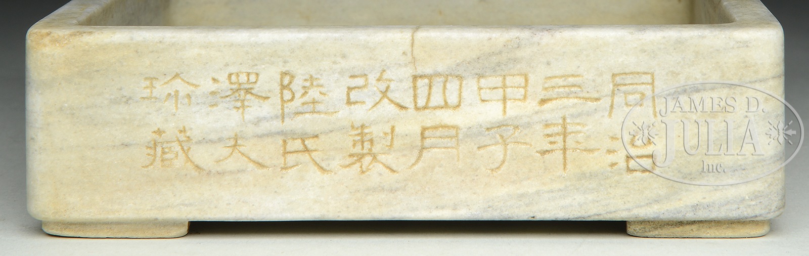 INSCRIBED MARBLE BRUSH WASHER.China. The square brush washer inscribed on the side with poetry and calligraphy, the body supported by four small L shaped stub legs, the stone retains natural texture and color. SIZE: 5-1/2″ l x 1-1/2″ h CONDITION: Good, slight discoloration. 7-75335 (600-800) – Lot 2442