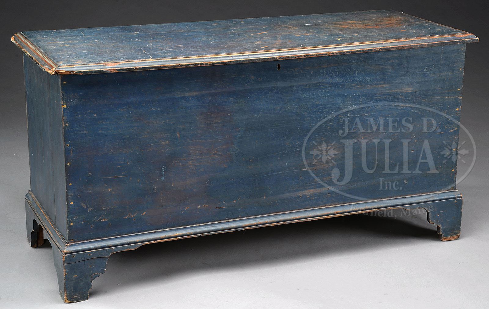 BLUE PAINTED SIX BOARD BLANKET CHEST WITH BRACKET BASE. Early 19th century. Six board blanket chest with overhanging top and bracket feet. SIZE: 49″ l x 19″ d x 25″ h. CONDITION: Appears to be all original. 9-91975 (800-1,200)