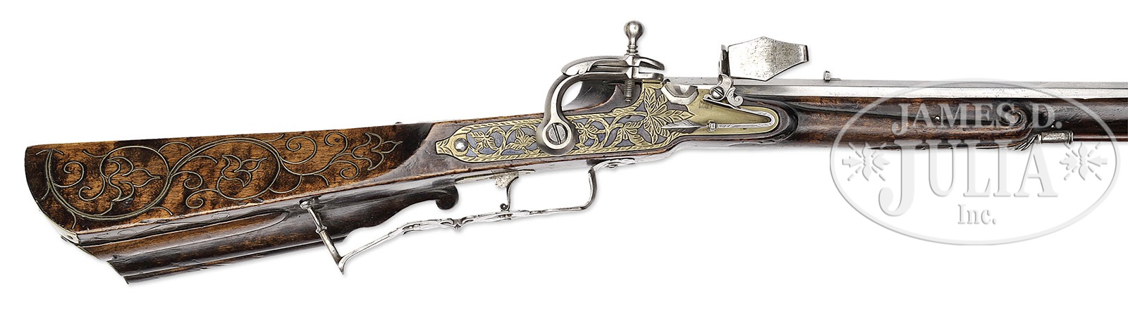 SCANDINAVIAN BALTIC SNAPHAUNCE, CIRCA 1780.SN NSN. Lock of characteristic Baltic form with swiveling frizzen and long serpentine hammer. Lockplate fire blued with pierced brass overlay. Octagonal bbl with tiny rifled bore. Elaborate pierced wide trigger guard. Patchbox mounted on underside of stock. Stock coarsely inlaid with thick brass wire and scrolls and flowers. PROVENANCE: European collection. Collection of Dr. Douglas Sirkin. CONDITION: Steel parts polished bright. Lockplate retains much original fire bluing. Stock is good with no significant defects other than some chipping at tip of forend. Patchbox appears original. 4-49851 (3,000-5,000) – Lot 2444