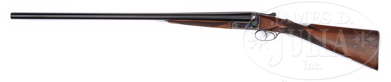 *JOHN DICKSON & SON BOXLOCK GAME GUN WITH CASE.SN 7593. Cal. 12 ga. 2-1/2″ Chambers. 28″ Dovetailed bbls are engraved “John Dickson & Son. (Incorporating Mortimer & Son). Edinburgh.” on narrow, swamped game rib. Bbl flats are stamped with London nitro proofs for 2-1/2″ chambers. Bottoms of bbls are stamped with provisional Birmingham proofs, and “MADE IN ENGLAND”. Case hardened action features automatic safety (SAFE inlaid in silver), and double triggers. Action has geometric border engraving with “John Dickson & Son” on each side. Top lever, floorplate, and trigger guard are blued, and geometric border engraved. SN is at grip. Plain European walnut straight grip buttstock measures 13-3/8″ over grooved wood butt. Point pattern checkering with mullered borders is at grip. A silver oval engraved “W.S.” is on toe line. Matching splinter forend has Anson release. Bore diameter: left -.725, right -.727. Bore restrictions: left -.026 (IMod), right -.005 (IC). Minimum wall thickness: left -.029, right -.026. Drop at heel: 2-1/4″, drop at comb: 1-7/16″. Weight: 6 lbs 8 oz. LOP: 13-3/8″. Green canvas VC case with brown leather trim is embossed “W. S.” on top. Interior is lined in green cloth with Dickson Frederick Street label in lid. Case contains a pair of plastic snap caps and straps. PROVENANCE: Richard Schreiber Collection. CONDITION: Excellent. Bbls retain over 95% of their orig blue with some slight silvering at muzzles and some minor marks. Action retains approx 85 – 90% orig case hardening color, with a couple of spots of oxidation, silvered on sharp edges. Top lever, floorplate, and trigger guard retain nearly all their orig blue, with slight silvering on thumbpiece. Stocks retain nearly all of their rubbed oil finish with some scattered handling marks. Bores are excellent. Action is tight. Bbls are on face. Canvas of case is beginning to bleach and has a number of scuffs. Leather trim is fine with some rubs. Handle is very fine. Interior cloth is very fine with some compressions and soiling from contact with gun. Label is very fine, slightly rubbed by central partition. 4-45951 (2,000-3,000) – Lot 2445