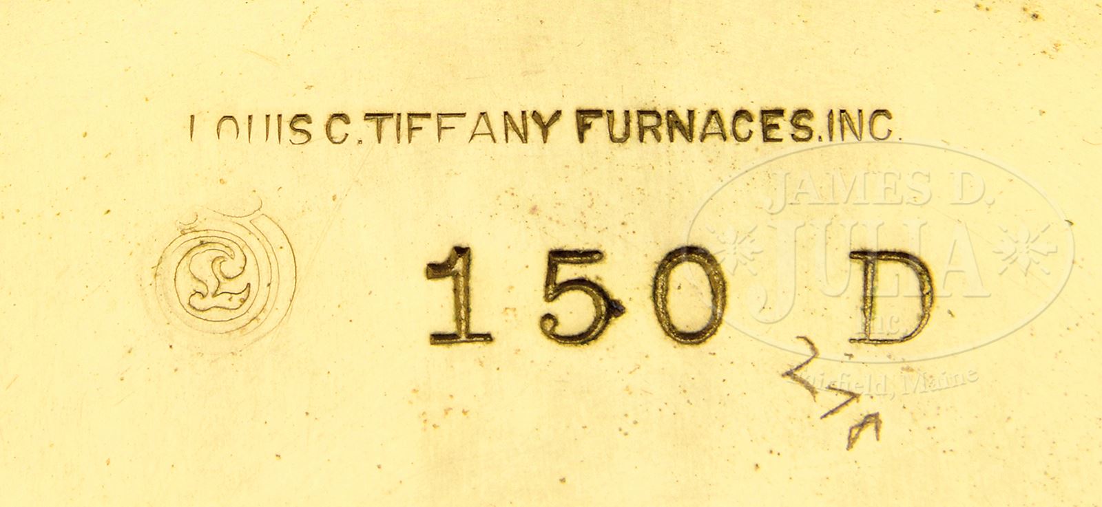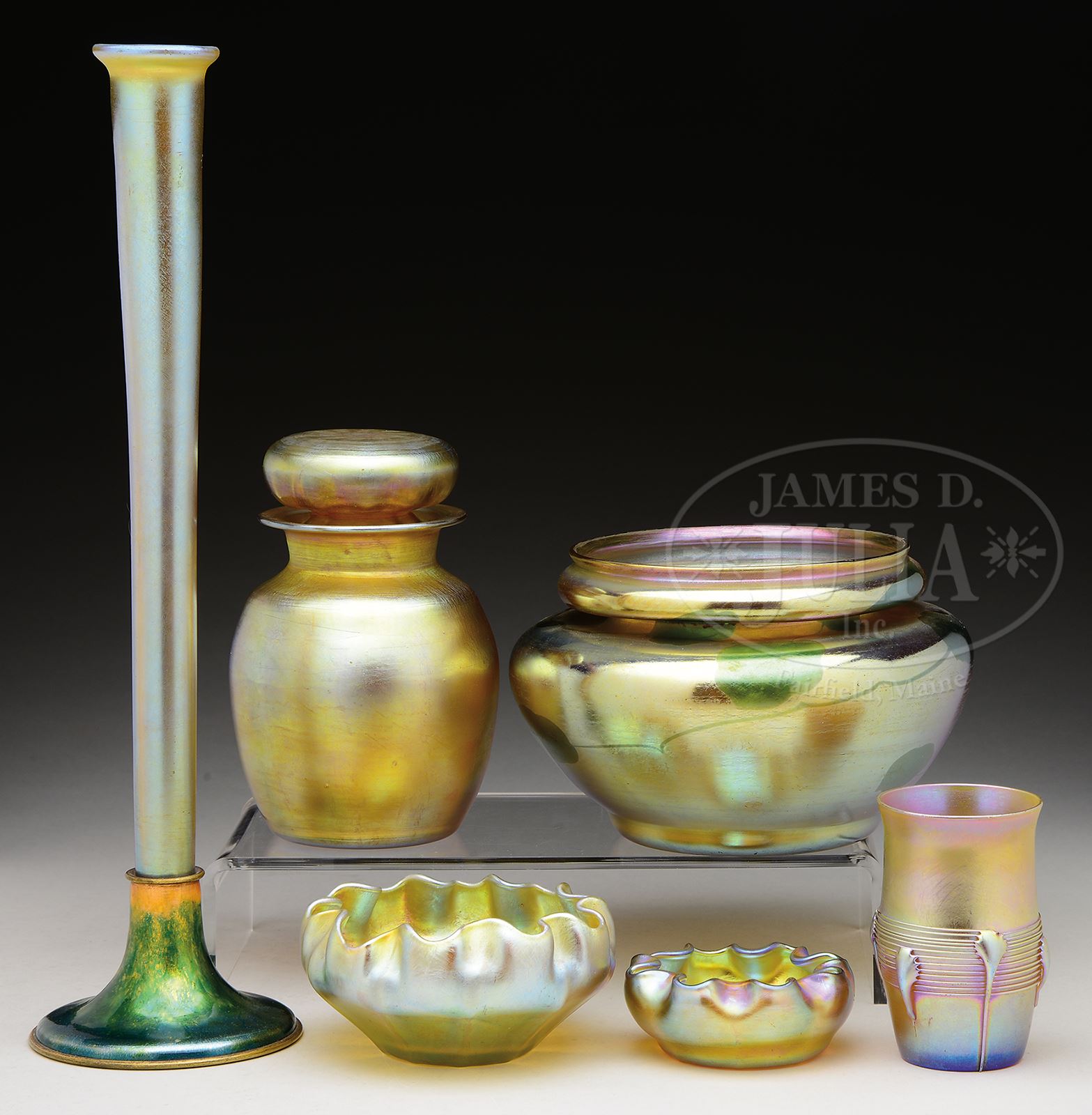 SIX TIFFANY FAVRILE GLASS PIECES.1) Tiffany vase has green leaf and vine decoration surrounding squat bulbous body against bright gold iridescent background with pink highlights. Signed on underside “L.C. Tiffany-Favrile 6026J”. 2) Gold favrile covered jar is finished in bright gold iridescence with platinum and pink highlights. Signed on underside “L.C. Tiffany-Favrile 287”. 3) Tiffany Furnaces bud vase has gold iridescent finish with platinum and blue highlights. Vase is housed in Tiffany Furnaces bronze foot with green and gold enamel. Signed “Louis C. Tiffany Furnaces Inc. 150 D”. 4) Gold favrile master salt has vertically ribbed body and ruffled rim with gold iridescence shading to platinum at lip. Signed on underside “L.C.T. Favrile 1276”. 5) Salt cellar has gold iridescence on exterior with very bright gold interior. Signed on underside “L.C.T.” 6) Cabinet vase is decorated with horizontal band of iridescent threading with applied tendrils around band. All in gold iridescence. Signed on underside “L.C.T N6915”. SIZE: Tallest 12-5/8″ t. PROVENANCE: From the Unreserved Estate of the late David Barnett. CONDITION: Cabinet vase has some missing threading and several flea bites to bottom edge, all others are very good to excellent. 50444-18 (1,500-2,000) – Lot 2445