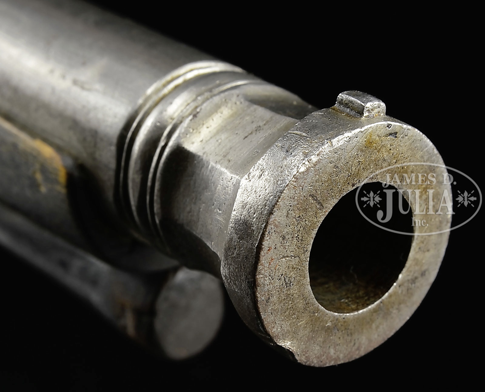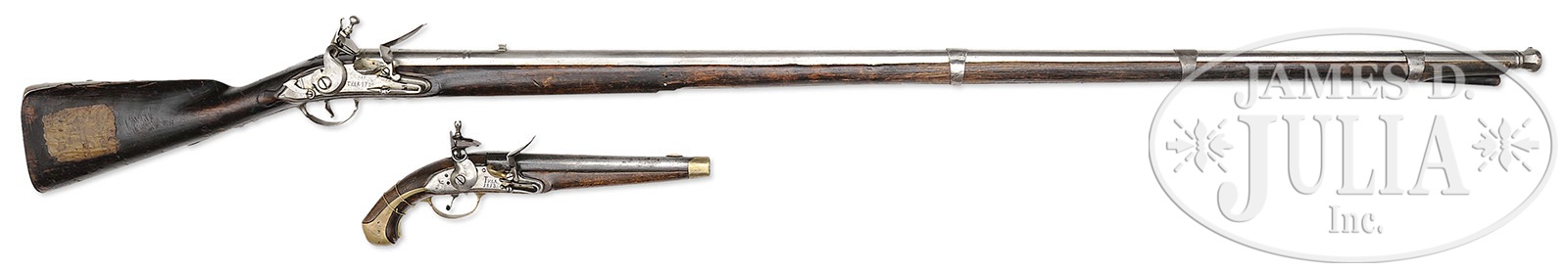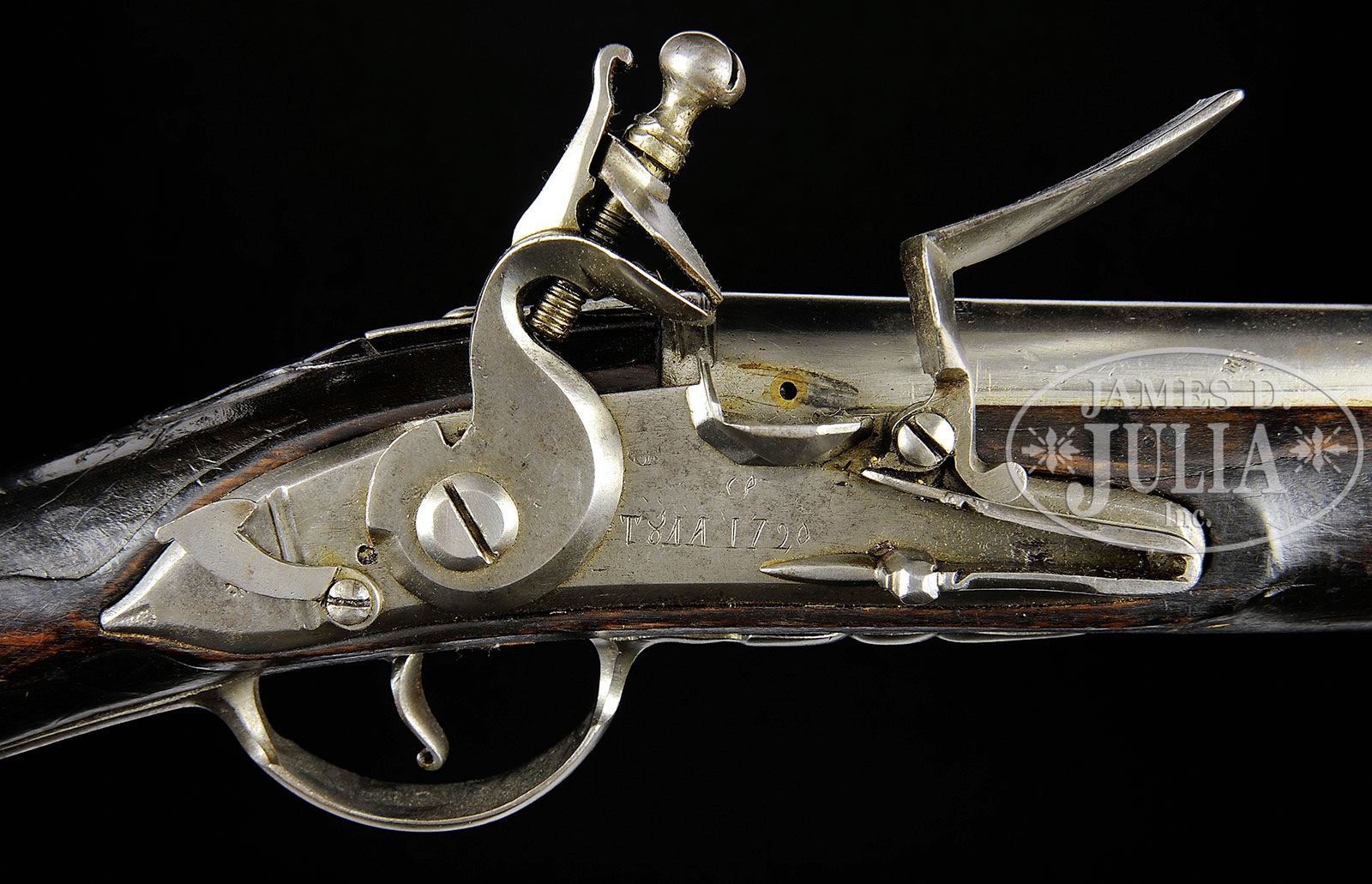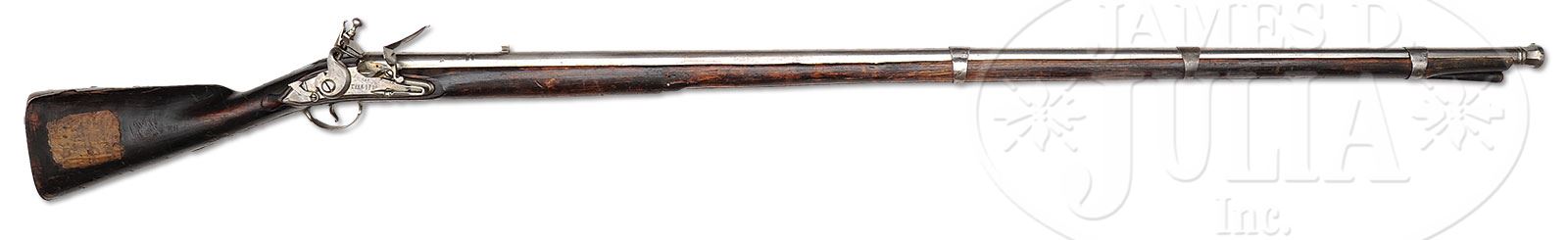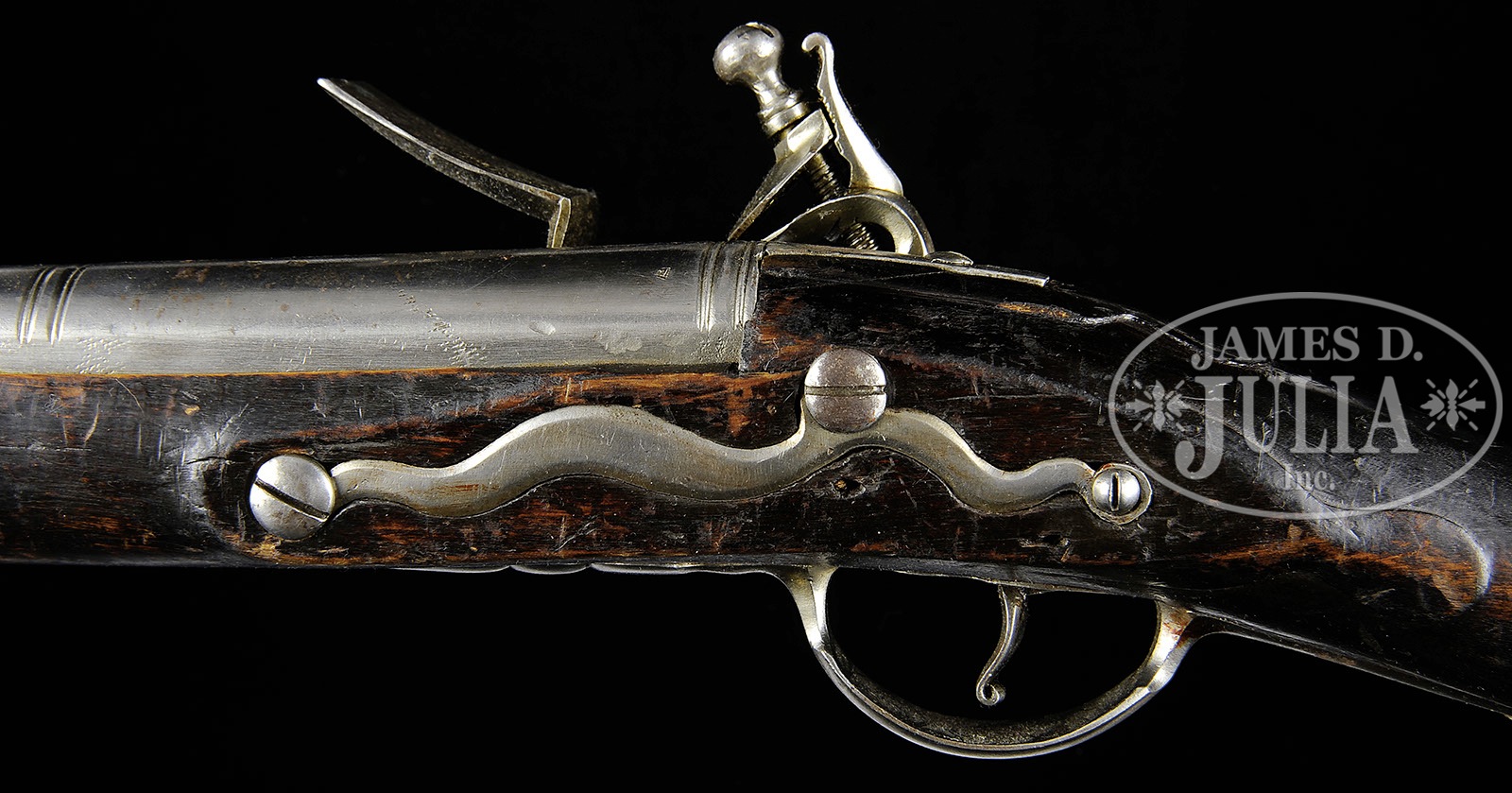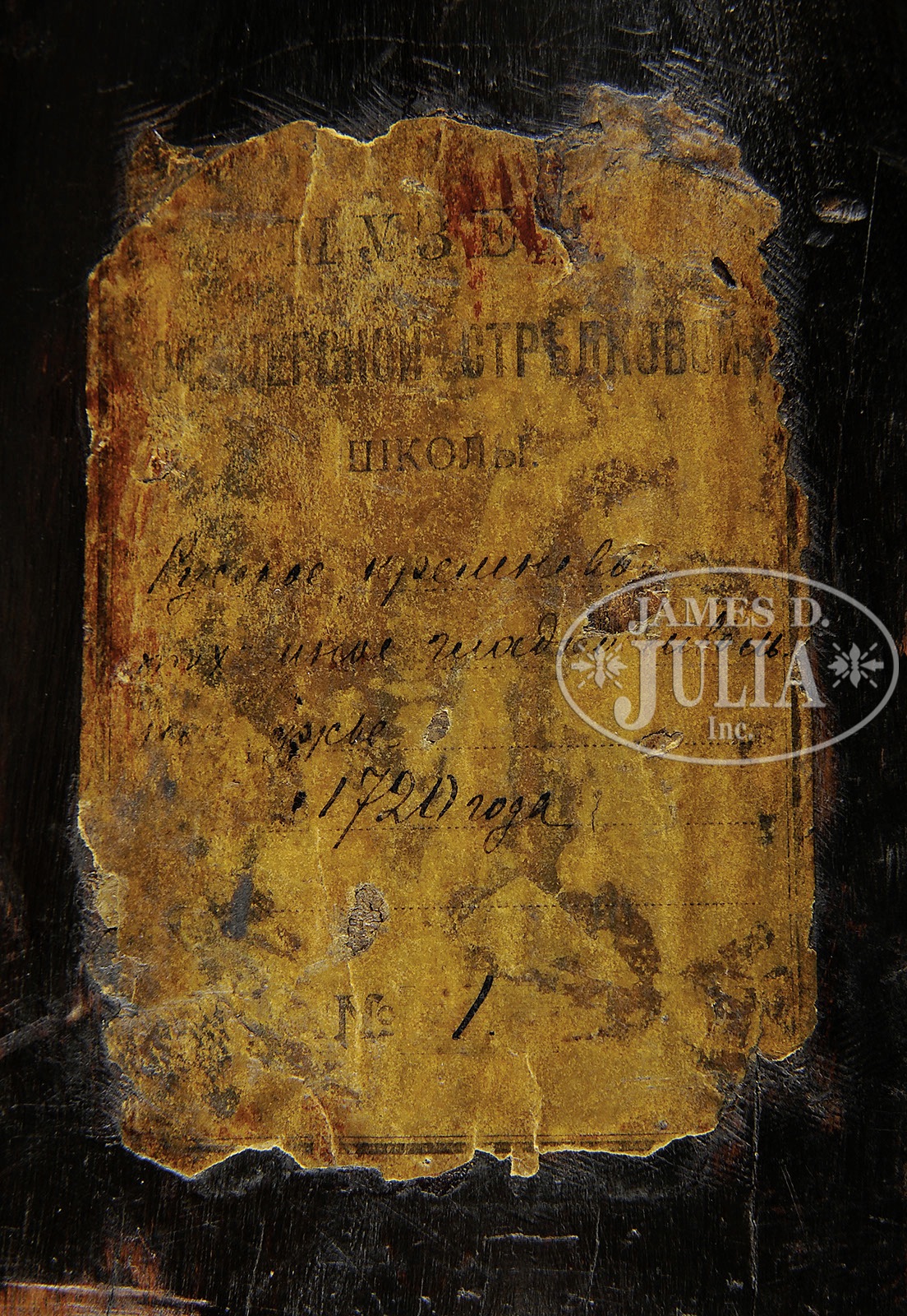 EXTREMELY RARE IF NOT UNIQUE IMPERIAL RUSSIAN TULA ARSENAL MILITARY ISSUE FLINTLOCK DOGLOCK MUSKET OF TSAR PETER THE GREAT CIRCA 1720 WITH PERIOD PAPER TAG FROM THE “MUSEUM OF OFFICER’S SHOOTING SCHOOL”.The rarest and earliest Russian military flintlock doglock musket offered for public sale in years, this example of Tsar Peter the Great’s “tall gun” presents a unique opportunity for collectors or museum’s of Russia arms and armor. This wonderful piece is 73.25 inches in length. The plain lock of doglock type is deeply stamped TULA in Cyrillic and dated 1720 with well faceted pan and plain swan neck cock. The triggerguard is well formed with facets on the bow and shield shaped finial. The approximately .65 caliber long, round barrel ends in a finely molded cannon type muzzle, which can be found on Ottoman firearms of this period. The serpentine sideplate is well sculpted as is the heavy steel buttplate and are as refined as those on costly civilian flintlocks. The walnut fullstock is stained dark. The ancient paper tag reads: “MUSEUM OF OFFICER’S SHOOTING SCHOOL RUSSIAN (FLINTSTONE+++) SMOOTH BARREL RIFLE: 1720 #1. Tula Arsenal was established in 1712 by order of Tsar Peter the Great. At that time Tula was equipped with the very latest technology including water powered boring machines and other sophisticated machinery. Tsar Peter’s “Tall or Big” gun exemplifies the excellence of Tula workmanship in its beauty and utility. Tsar Peter was a very tall man standing 6 feet 8 inches and this very long musket was entirely to his liking and taste. PROVENANCE: Museum of Officer’s Shooting School, Russia. CONDITION: Condition of the metal is polished, arsenal bright with all small lock parts original. The wood is excellent with no visible replacements and a lovely mellow 300 year-old patina. The paper label from the museum is still legible. 4-50986 (12,500-22,500) – Lot 2446