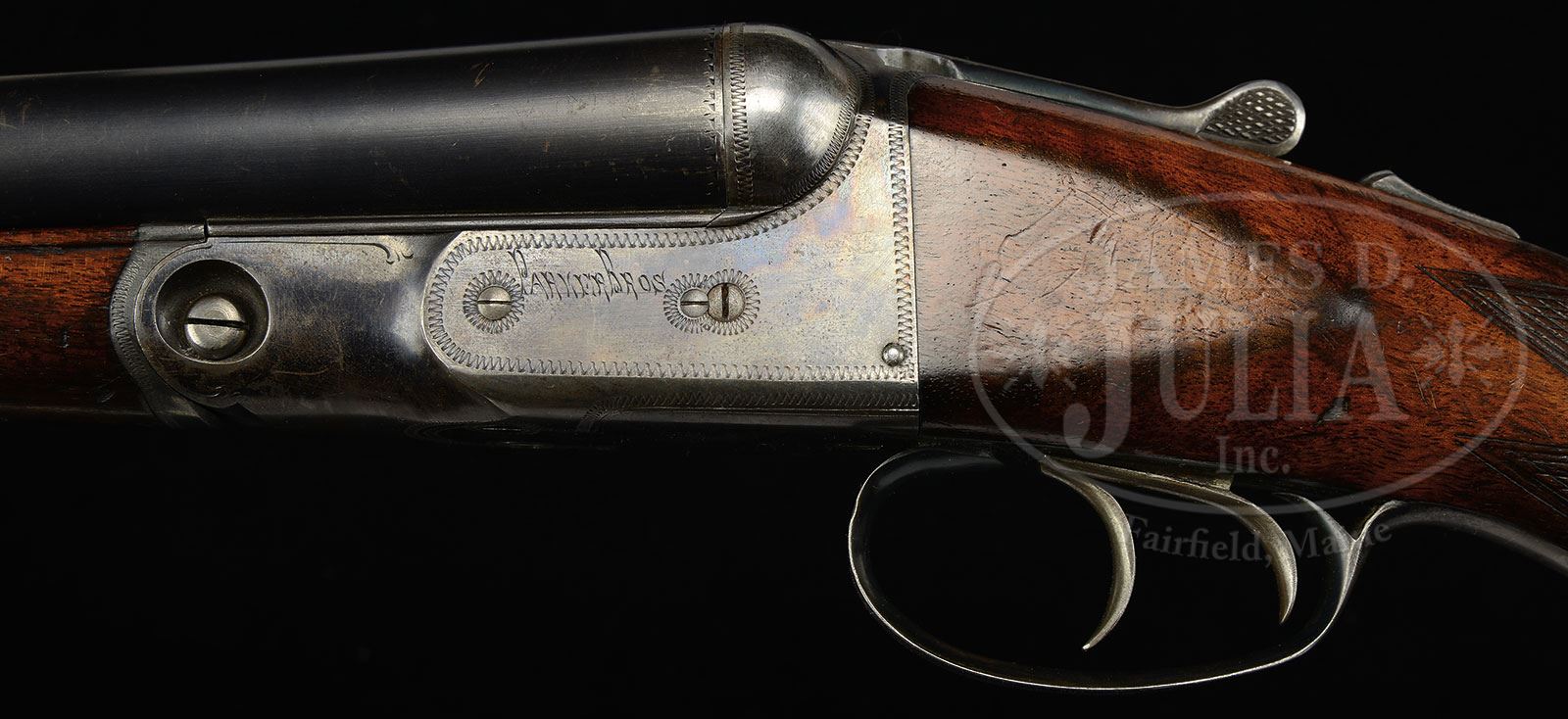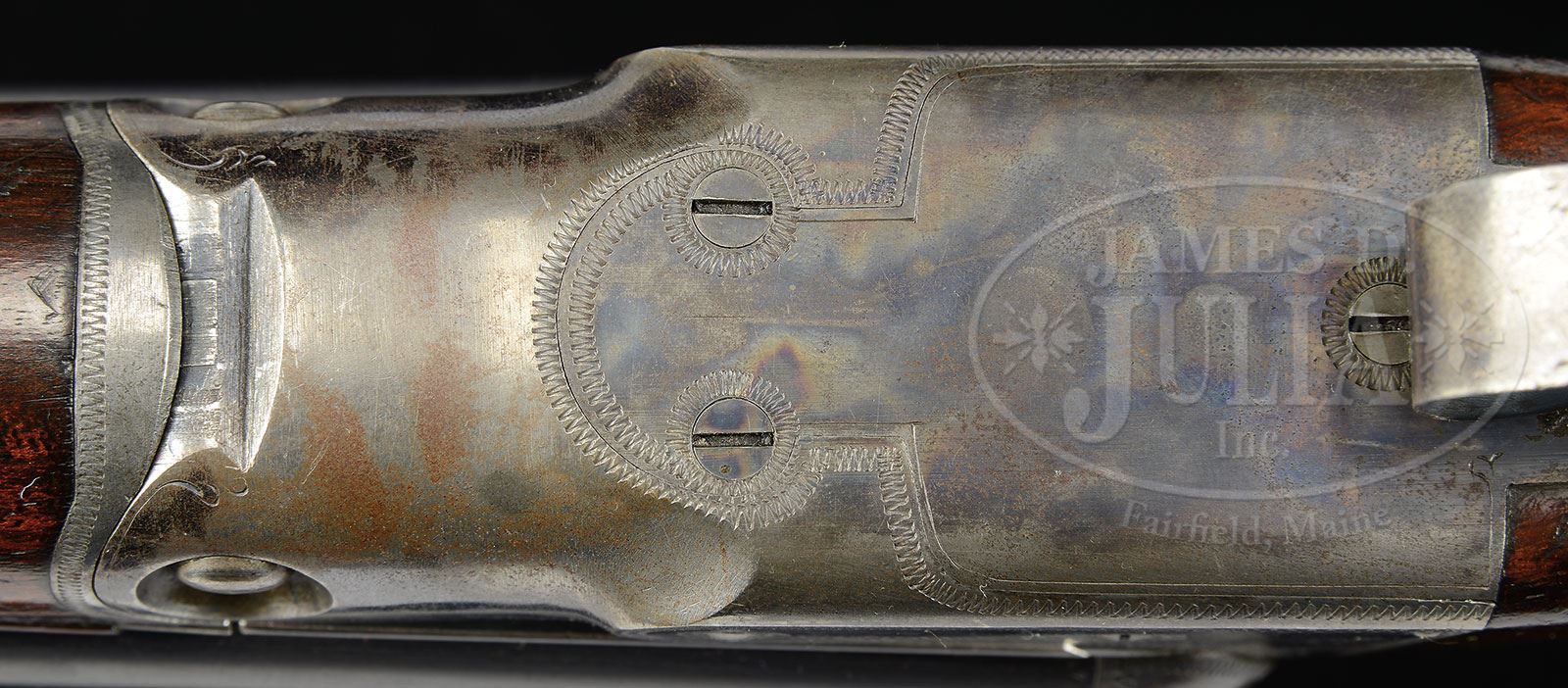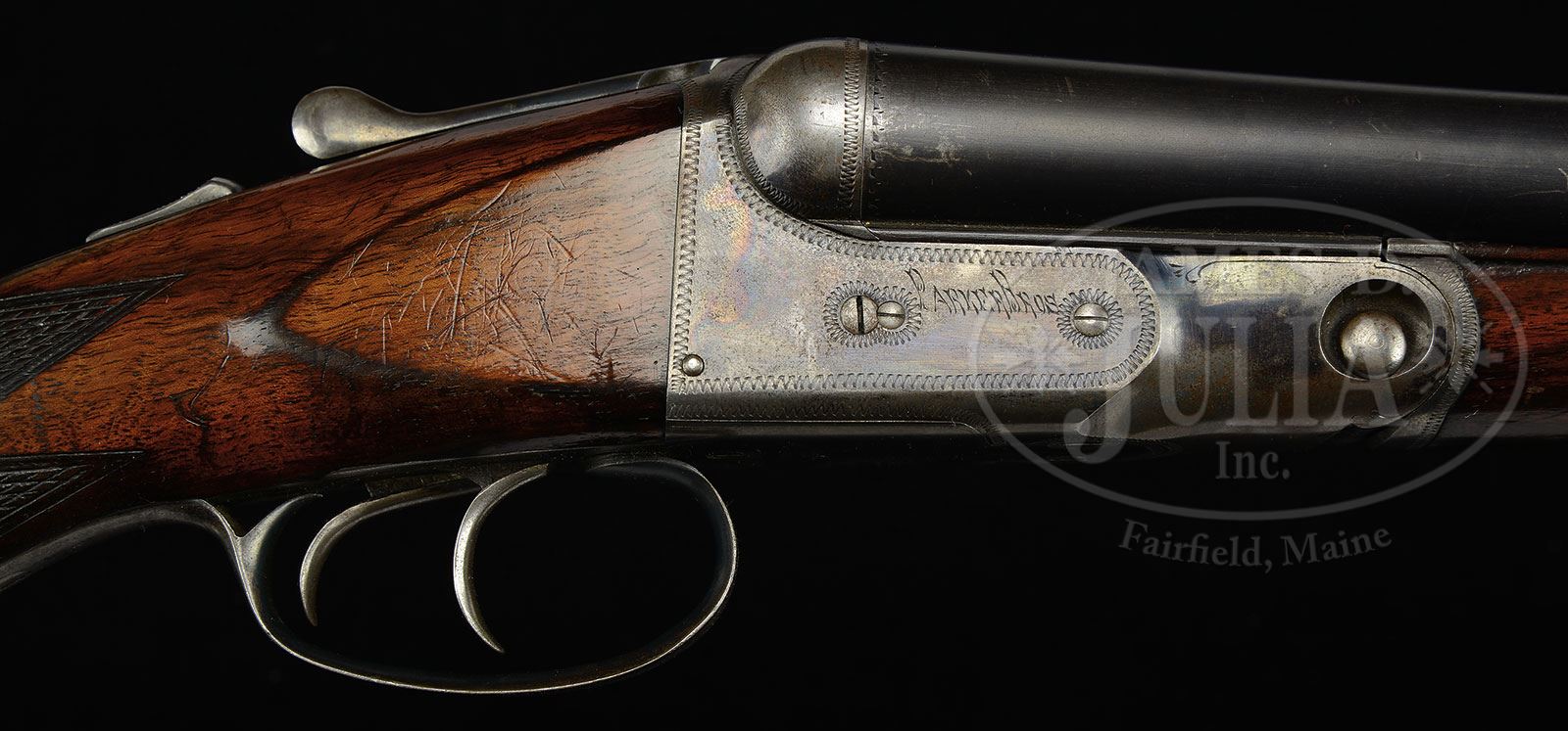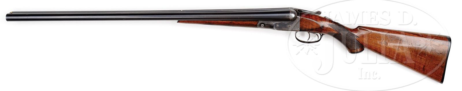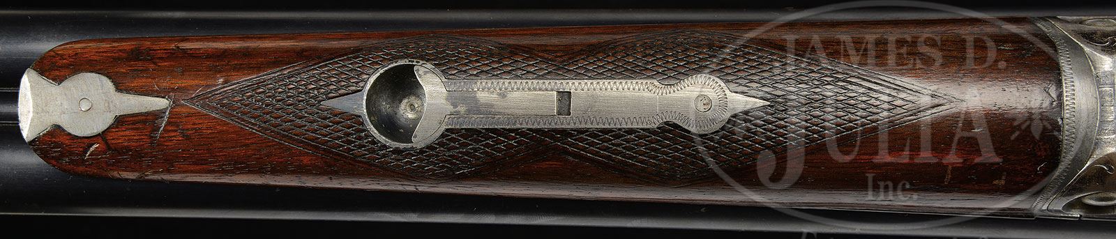 *PARKER VHE.SN 204343. Cal. 12 ga. 2-5/8″ Chambers. 1 Frame. 28″ Bbls are marked with Parker address and “VULCAN STEEL” on top rib. All correct marks are on water table and bbl flats. All specifications match those listed in The Parker Gun Identification and Serialization ledger. Case hardened action features automatic safety and double triggers. Action is engraved with wiggle borders in “V” style. “PARKER BROS” is on each side of action. SN is on tang of border engraved and blued trigger guard. Fiddle figured American walnut capped pistol grip buttstock measures 14″ over dogs-head buttplate with spur. Stock is checkered in point pattern. A German silver shield is on toe line. Matching splinter ejector forend has SN and 1901 patent date on iron. Bore diameter: left -.729, right -.729. Bore restrictions: left -.034 (full), right -.023 (mod). Wall thickness: left -.036, right -.036. Drop at heel: 3″, drop at comb: 1-7/8″. Weight: 6 lbs 14 oz. LOP: 14″. PROVENANCE: Ed Johnston Estate Collection. CONDITION: Very fine. Bbls retain approx 90% orig blue, with numerous light marks, thinned at normal carry point. Action retains 60 – 70% orig case hardening color, with some splotches of browning and light freckling. Trigger guard retains traces of blue, most loss due to flaking. Stocks retain most of their orig finish, with numerous heavy and light marks, rubs and scratches, checkering somewhat worn. Bores are excellent, bright and shiny. Action is tight. Ejectors are slightly out of time. Screw slots show some use. 4-51394 MGM39 (2,000-3,000) – Lot 2446