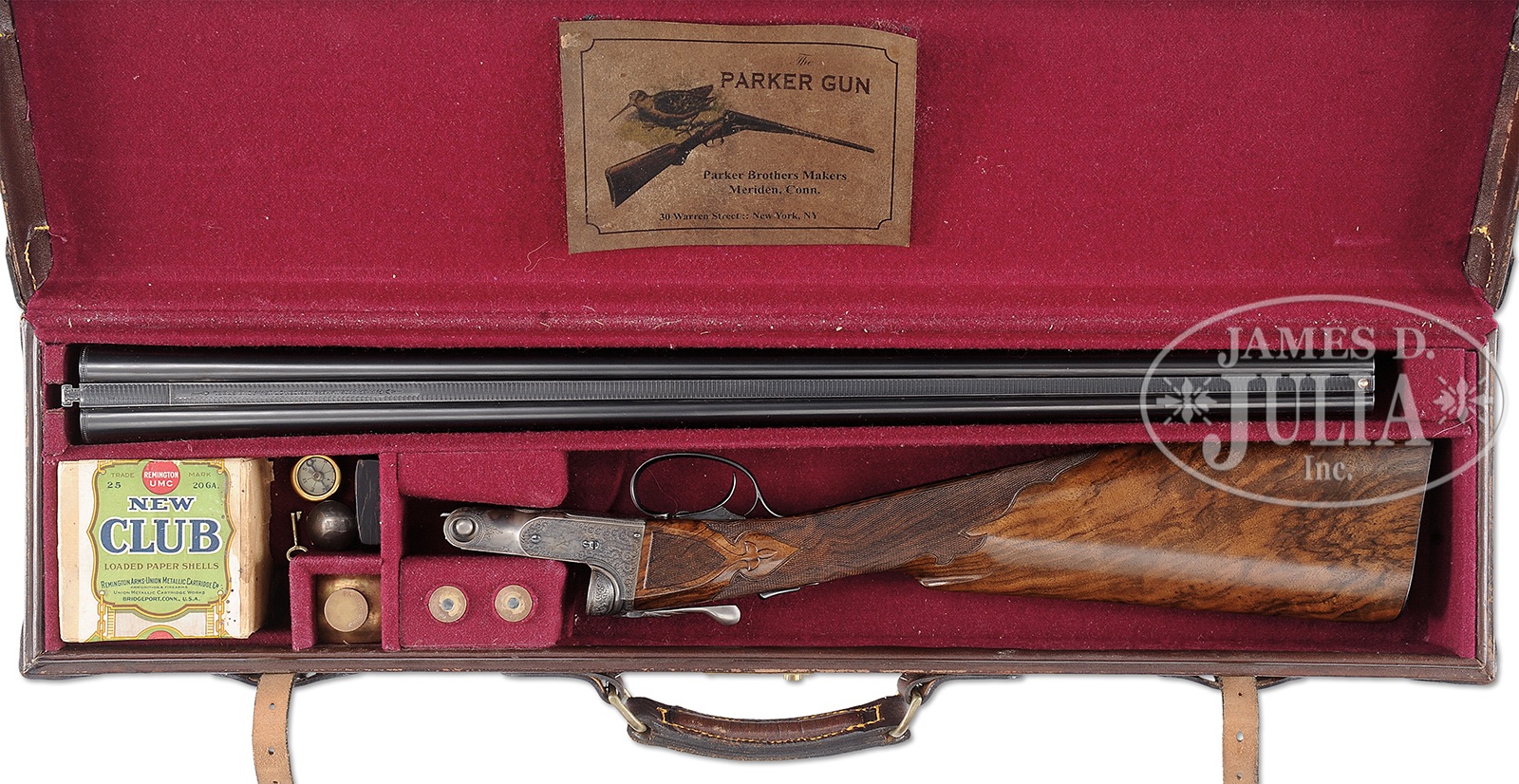 *FINELY RESTORED 20 GAUGE PARKER “BHE” WITH CASE AND ORIGINAL ADVERTISING.SN 236165. Cal. 20 ga. 2-1/2″ Chambers. 0 Frame. This exceptionally rare little gun, one of only 28 made in 20 ga. with Acme 26″ bbls, is marked with Parker Meriden address and Acme steel, on concave matted rib. Bbl flats are re-stamped with “A” (steel type) and have Parker overload proofs, along with Remington date code “CG3” (April 1938, with the “3” indicating “repair shop”). Case hardened action with single well filed bead around fences, is fitted with automatic safety and Parker single selective trigger. It is engraved in classic “B” style, with varying sized scroll surrounding vignettes of double dogs on side; pointers on left, setters on right. A ruffed grouse, perched on branch, is on trigger plate. “PARKER BROS” is on scrolled riband on each side of action. This engraving, especially the scroll, is exceptionally well done, most likely re-cut. Newly fashioned, correctly shaped European walnut straight grip buttstock has fine smoky marbling and light fiddle figure. It measures 14-1/4″ over skeleton steel buttplate and features checkered side panels, with fleur-di-lis drop points, and checkering in “AA” or “A1 Special” style, with fancy mullered borders. A gold oval on toe line is engraved “INDIAN SUMMER”. Matching splinter ejector forend has steel tip, typical release, and patent date on iron. Bore diameter: left – .617, right -.617. Bore restrictions: left -.009 (lt mod), right -.005 (IC). Wall thickness: left -.022, right -.022. Drop at heel: 2-1/8″, drop at comb: 1-7/16″. Weight: 6 lbs. 4 oz. LOP: 14-1/4″. Specifications match those listed in the PARKER GUN IDENTIFICATION & SERIALIZATION ledger. Dark leather VC case with stitched leather corners, is marked “CASECRAFT”, and is lined in burgundy cloth with dark Parker Reproduction label in lid. Case contains Parker marked brass square oil bottle and snap caps, unmarked 2-pc cocobolo and brass cleaning rod with jag, Marbles compass, silver (?) pill case, horn striker block, and a Remington “NEW CLUB” 20 ga. 2-pc cartridge box with green highlights and blue lettering. PROVENANCE: Factory letter with orig specifications, indicating it orig came with 26″ bbls, straight grip, and single trigger. Orig pamphlet Remington and Parker skeet guns. Advertising broadside “Parker Skeet Guns”. List of component parts. Orig hang tag with directions. Remington envelope postmarked Bridgeport, Jan. 1936. Leaflet “Congratulations on your Choice of a Parker Gun”. CONDITION: Excellent, near new, as expertly restored. This gun appears in Doug Turnbull’s records, and retains nearly all fine custom finishes, with only a few very light marks, and a hint of silvering on sharp edges. Bores are excellent. Action is tight. Bbls are on face. Ejectors are in time. Trigger works. Case leather has some spotting and rubs on edges. Straps and handle are good. Interior cloth is fine. Label detached. Accessories are good, brass tarnished. 50115-2 (20,000-30,000) – Lot 2447 Click here to view provenance