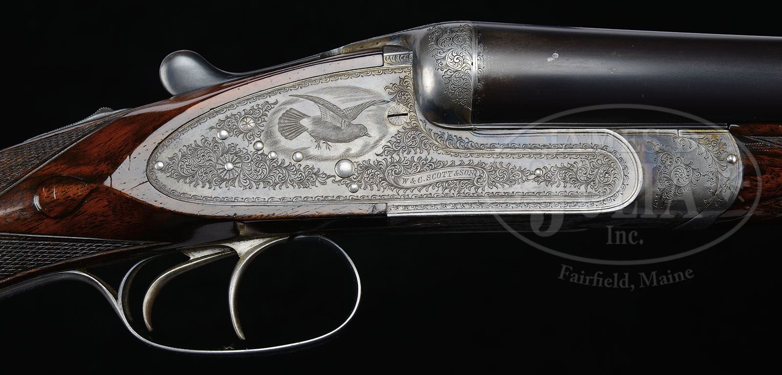 *W & C SCOTT MONTE CARLO “B” SIDELOCK EJECTOR GAME GUN.SN 75700. (ca 1906) Cal. 12 ga. 2-3/4″ Chambers. 28″ Dovetailed bbls with flat matted game rib are engraved “W & C. Scott & Son. THE MONTE CARLO. B.” and “78 Shaftesbury Avenue. London. England.” on tops. Bbl flats are stamped with Birmingham nitro proofs for 2-1/2″ chambers. SN is on bottom of both bbls, along with “Special Steel. B”. Case hardened square backed sidelock action features automatic safety (SAFE relief engraved), Scott’s square cross bolt third fastener, patent gas checks, and double triggers. Action and lockplates are engraved with 60% coverage well cut scroll, surrounding vignettes of pigeons in flight on each lockplate, which are also engraved “W & C Scott & Son” in scrolled ribands. Blued top lever and trigger guard are also scroll engraved. SN is at grip, which also has castle logo. Finely streaked and lightly figured European walnut round knob pistol grip buttstock measures 14-3/8″ over brown leather covered pad. Stock features flat top point pattern checkering with mullered borders, drop points, and a silver oval on toe line engraved with pigeon perched on top of initials “GJB”. Matching splinter ejector forend has Anson release. Bore diameter: left -.733, right -.731. Bore restrictions: left -.030 (Full), right -.008 (IC). Minimum wall thickness: left -.033, right -.032. Drop at heel: 2-5/16″, drop at comb: 1-1/2″. Weight: 6 lbs 11 oz. LOP: 14-3/8″. PROVENANCE: Thomas W. Connally Estate Collection. CONDITION: Very fine as partially refinished. Bbls retain approx 95% of a well done rust blue, with a number of light marks and scratches. Action retains a considerable amount, perhaps 30%, of its orig case hardening color. Right lockplate retains about the same, left has perhaps 70 – 80% color, balance of action with silver highlights. Stocks retain most of an old glossy oil finish with numerous marks and scratches. Checkering partially re-cut. Newer pad has some scuffs. Bores are excellent. Action is tight. Bbls are on face. Ejectors are strong and in time. A good solid sidelock. 4-55636 (3,000-5,000) – Lot 2449