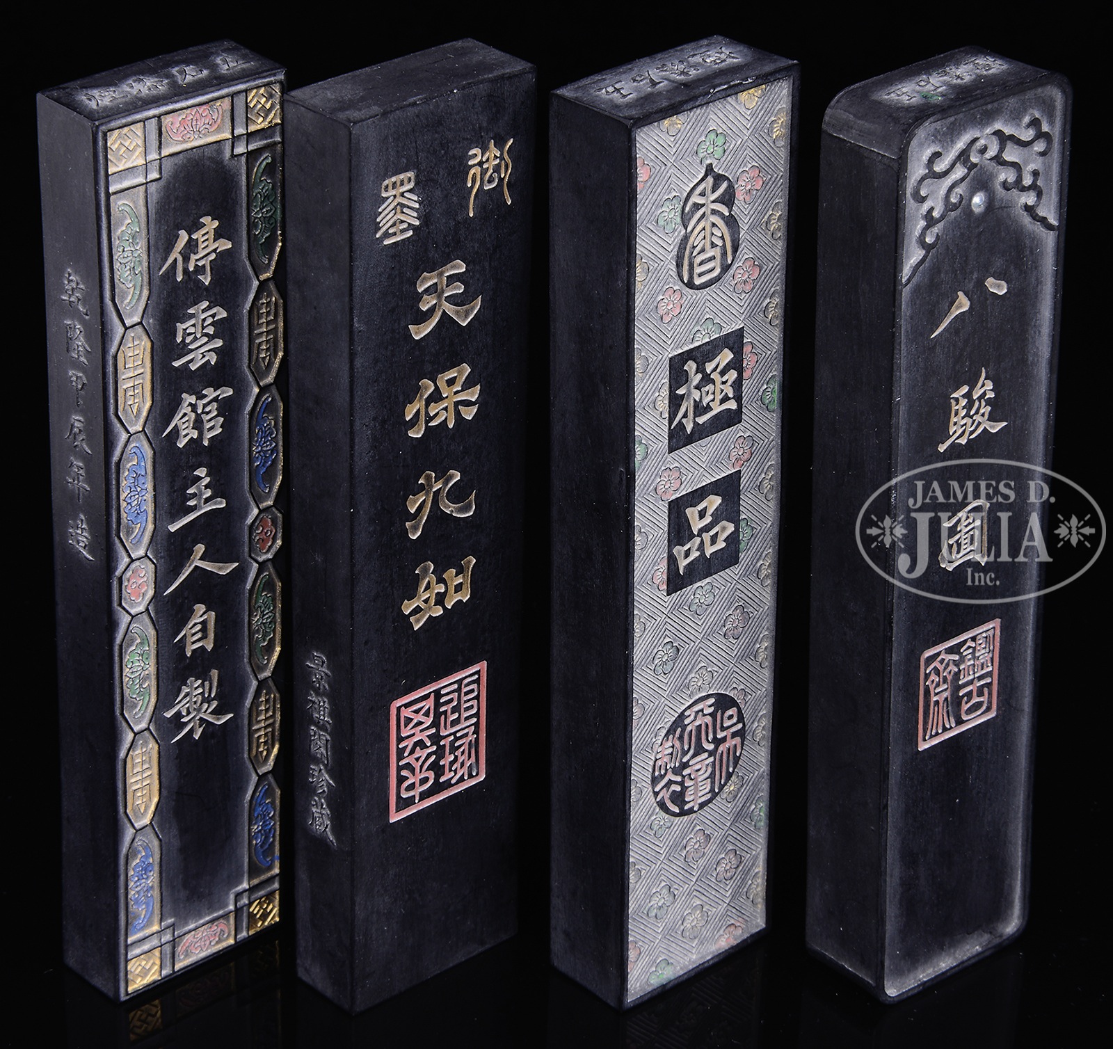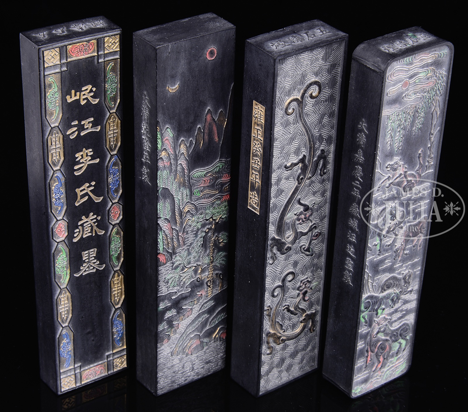 FOUR RECTANGULAR INKSTICKS.China. The four inksticks each with scenery, inscriptions, or animals, all with artist marks. SIZE: 4-3/4″ h. CONDITION: Good. 7-75334 (250-350) – Lot 2449