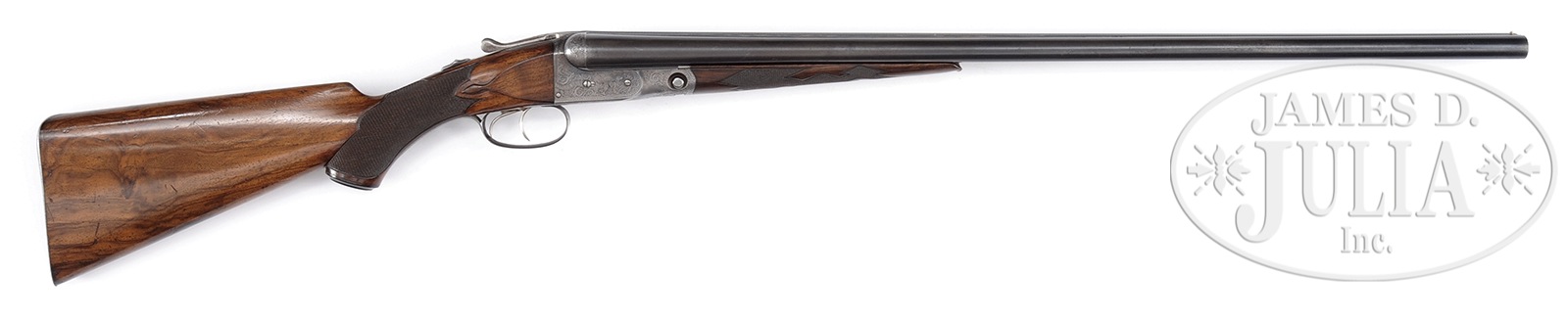 *SCARCE 16 GAUGE PARKER CHE ON 0 FRAME.SN 173700. Cal. 16 ga. 2-1/2″ Chambers. 0 Frame. 28″ Bbls are marked with Parker Bros name and Meriden, CT address, along with “ACME STEEL” on broad, matted, concave rib. Bbl flats and lumps are stamped with all correct markings. Case hardened action with all correct markings on water table, features non-automatic safety and nickel-plated dbl triggers. Action is engraved in typical “C” style, with approx 80% coverage of well cut scroll within geometric borders surrounding vignettes of setters on sides, and a goose flying across trigger plate, with mountains in background. Scroll engraved trigger guard has SN on tang. Nicely veined and lightly figured European walnut Parker capped pistol grip buttstock measures 14-1/8″ over skeleton steel buttplate. Typical “C” grade checkering in fancy pattern wraps over top of grip, and side panels terminate in lozenge shaped drop points. Matching splinter ejector forend has well filed steel tip, typical release, and patent date on iron. All specifications match those listed in PARKER GUN IDENTIFICATION & SERIALIZATION ledger. Bore diameter: left – .668, right -.667. Bore restrictions: left -.018 (mod), right -.006 (IC). Wall thickness: left -.016 (A small area near bottom rib, about 12″ back from muzzle), right -.023. Drop at heel: 2-1/2″, drop at comb: 1-1/2″. Weight: 6 lbs. 6 oz. LOP: 14-1/8″. CONDITION: Very fine. Bbls retain approx 70% orig blue, thinning overall, with some scuffs and light freckling. Action retains a considerable amount, perhaps 25%, orig case hardening color, where protected, the balance a smooth silver to pewter gray. Stocks retain most of their orig finish with numerous marks, and scratches, some heavy. Checkering lightly worn. Bores are excellent. Action is tight. Bbls are on face. Ejectors are strong and in time. A fine, as found, small frame Parker. 49708-11 MGM8 (10,000-15,000) – Lot 2450