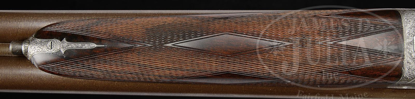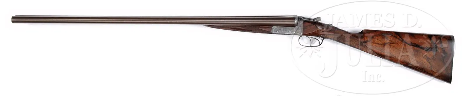 *J. HARKOM & SON BEST BOXLOCK EJECTOR GAME GUN WITH CASE.SN 2392. Cal. 12 ga. 2-3/4″ Chambers. 30″ Fine Damascus bbls are engraved “Joseph Harkom & Son 30 George Street Edinburgh” on narrow game rib. Bbl flats are stamped with London nitro proofs for 2-1/2″ chambers. Bottoms of bbls are stamped with SNs. Case hardened boxlock action features automatic safety (SAFE in black enamel on gold rectangle dovetailed through tang) and double triggers. Action is beautifully filed with serpentine fillet, around fences, connecting over top. It is engraved with 90% coverage exceptionally well cut small scroll. “J. Harkom & Son” is in scrolled pennant on each side. Blued top lever, floorplate, and trigger guard are also scroll engraved. SN is on long trigger guard tang. Beautifully marbled and stump figured circassian walnut straight grip buttstock measures 15-1/4″ over serrated horn buttplate. Stock features drop points, point pattern checkering with mullered borders at grip, and a vacant silver oval on toe line. Matching splinter forend has Anson release and is fitted with Deeley ejectors. Bore diameter: left -.730, right -.730. Bore restrictions: left -.034 (full), right -.012 (Mod). Minimum wall thickness: left -.025, right -.026. Drop at heel: 2-3/16″, drop at comb: 1-1/2″. Weight: 6 lbs 6 oz. LOP: 15-1/4″. What is likely orig makers tapered leather case is lined in blue baize, and has paper Harkom label in lid. CONDITION: Fine, as partially refinished. Bbls retain essentially all of a fine re-brown, with good definition to pattern, rib engraving considerably softened. Action retains a considerable amount of its orig case hardening color where protected, but is mostly silver gray to brown. Top lever, floorplate, and trigger guard have been re-blued, and retain essentially all of that blue. Stocks retain essentially all of a fine hand rubbed oil finish, with some subsequent light marks, checkering nicely re-cut. Bores are very fine to excellent, light frosting at breech ends. Action is tight. Left bbl is slightly off face. Ejectors are strong and in time. Case leather is dark with numerous rubs and scuffs. Newly restored straps and handle are fine. New lining is excellent with a few light compressions. Orig label is very fine, slightly foxed and soiled, with a dime sized rub at bottom. This gun, like all Harkom guns is of exceptional quality. 4-55386 (5,500-9,500) – Lot 2451