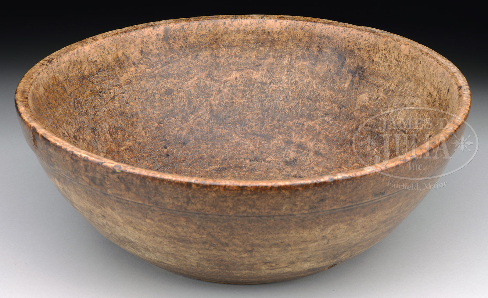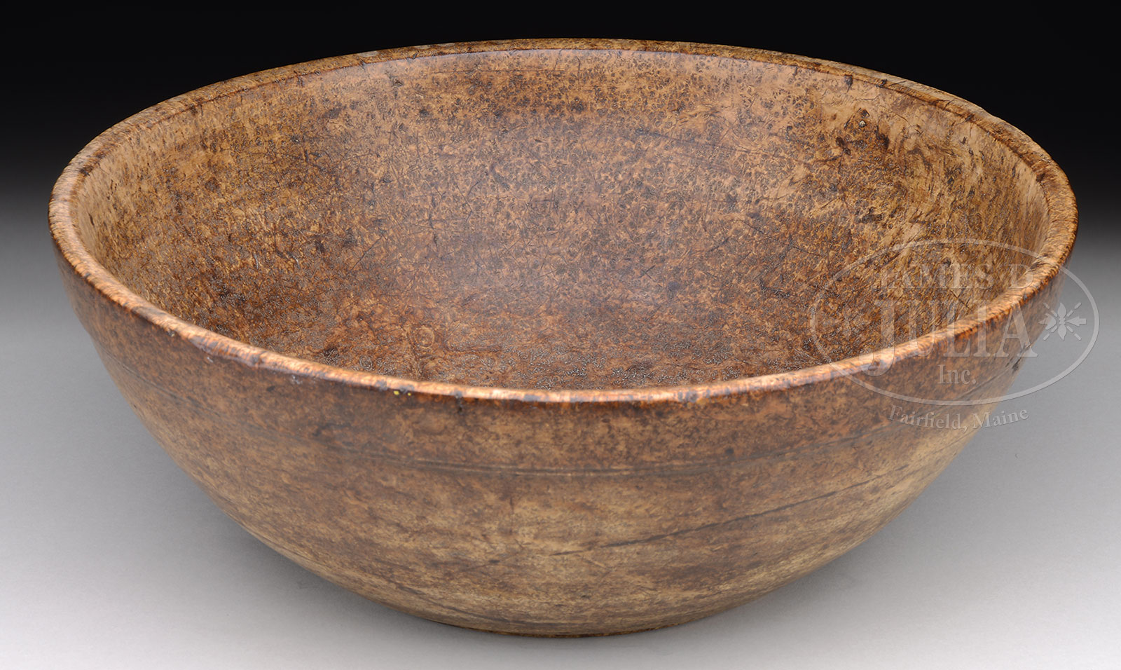 HIGHLY FIGURED BURL BOWL.Late 18th century, New England. This exceptional ash bowl of beehive form with concave foot beneath a scribe line. The rim with bold out-set band above a finely beaded conforming line beneath. SIZE: 4-3/4″ h x 12-3/4 dia. CONDITION: Untouched original “attic”, surface with rich patina, in excellent original condition. 51859-43 (1,500-3,000) – Lot 2451