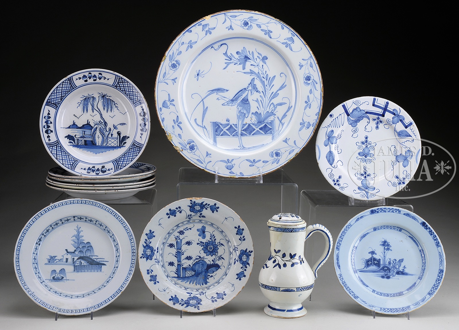 LOT OF 11 BLUE AND WHITE DELFT PIECES INCLUDING: TEN PLATES AND COVERED PITCHER.18th century. 1) 8″ covered pitcher with blue flower decoration, small dome top cover. 2-7) Set of six 9″ plates, with same decoration, landscape with tree and top of building. 8-11) Four 9″ plates with different scenes. SIZE: As noted above. PROVENANCE: Estate of Siro R. Toffolon, of Old Lyme, CT. CONDITION: 1) Cover and pitcher have repairs and restorations which are visible. 2-7) Minor rim glaze chips, craquelure to glaze surface, 1 has rim repair, otherwise good. 8-11) 1 with chipping to rim, others only minor chipping. 50335-2 (800-1,200) – Lot 2452