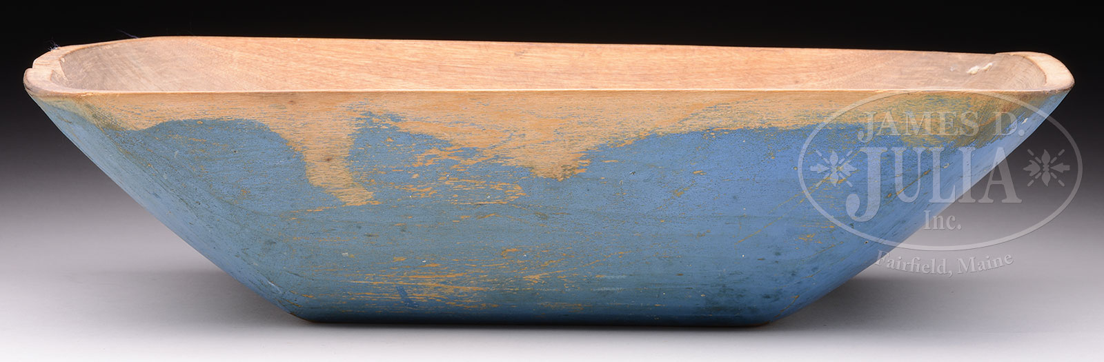 NEW ENGLAND MAPLE TRENCHER IN BLUE PAINT.19th century. Rectangular trencher with rounded ends deeply carved from the solid with old if not original robin’s egg blue painted exterior. SIZE: 5″ h x 20″ l x 11-1/4″ w. CONDITION: One end with old shrinkage crack and remnants of staple repair, now stable. The opposing end with old notched chip at edge. The interior with in use wear commensurate with age. Painted surface appears original with appropriate in use wear. Retaining vibrant color. Very good overall. 52279-6 (600-900) – Lot 2452