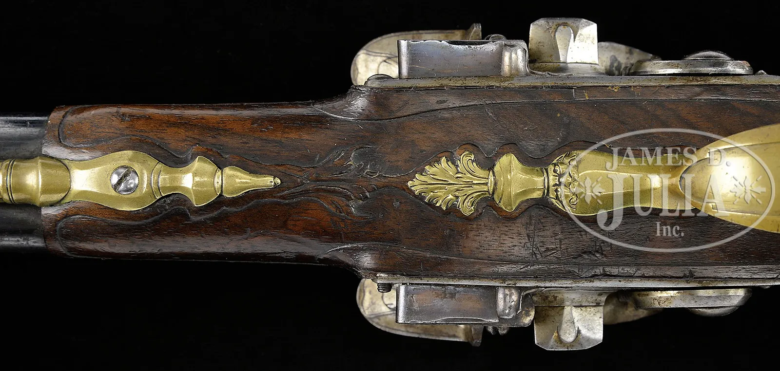 VERY FINE PAIR OF DOUBLE BARREL FLINTLOCK PISTOLS BY SIMON JOURJON OF ST. ETIENNE (1672 – 1752).SN NSN. Cal. .545. 13″ Double round barrels with geometric and scrolled gold damascening at breech ends, mount walnut ramrods with steel caps through beaded steel tailpipes, and octagonal end heavily chamfered thimbles. Locks with integral faceted pans, have unbridled friction frizzens. Frizzen springs are nicely file decorated and have foliate tips. Lockplates are deeply chamfered, slightly cambered, and have long rebated pointed tails. Serpentine cocks have chamfers matching lockplates. Lock parts are engraved with geometric borders, some scroll, and with arrow, quiver, and boar’s head motifs on tails. “Simon Iovrjon” is in front of each cock. Dense European walnut stocks have fine acanthus carving on tops behind bbls, and with nicely shaped moldings around brass furniture, which consists of heavy brass caps to knobbed butts, both marked “10” and deeply chamfered trigger guards with acanthus finials. Stocks attach to bbls with screws through thimbles into bosses on bbls. CONDITION: Excellent. Bbls retain most of what appears to be their orig bright blue under a layer of grime and light surface oxidation. Locks retain nearly all of their orig bright polish, with grime and light discoloration. Stocks are very fine retaining nearly all of what appears to be their orig finish, with considerable chipping around butt caps, some old, most relatively recent. Locks are crisp. A great pair of French pistols in need of a judicious cleaning. 4-49545 MGM118 (10,000-20,000) – Lot 2453