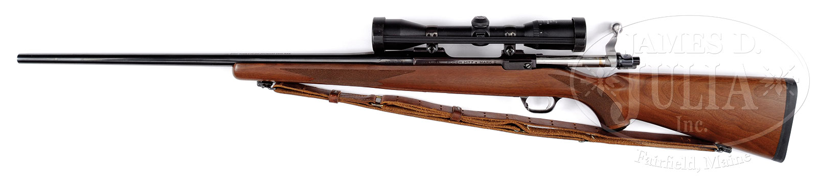 *RUGER M77 MARK II RIFLE IN .338 WIN MAG WITH SCOPE AND BOX.SN 783-84969. Cal. .338. 24″ tapered bbl mounted with Zeiss Diavari 3-9 X36 scope. Checkered stocks with thin black Ruger brand pad and Ruger embossed grip cap. Leather sling with sling swivels. Housed in its orig Ruger box. CONDITION: Extraordinarily fine, near new. Likely test fired only. Mechanics are excellent. Brilliant shiny bore. Leather sling with crazing and crackling, leather drying. Box is very good with scuff marks and discoloration. 51658-9 JSL (800-1,200) – Lot 2453