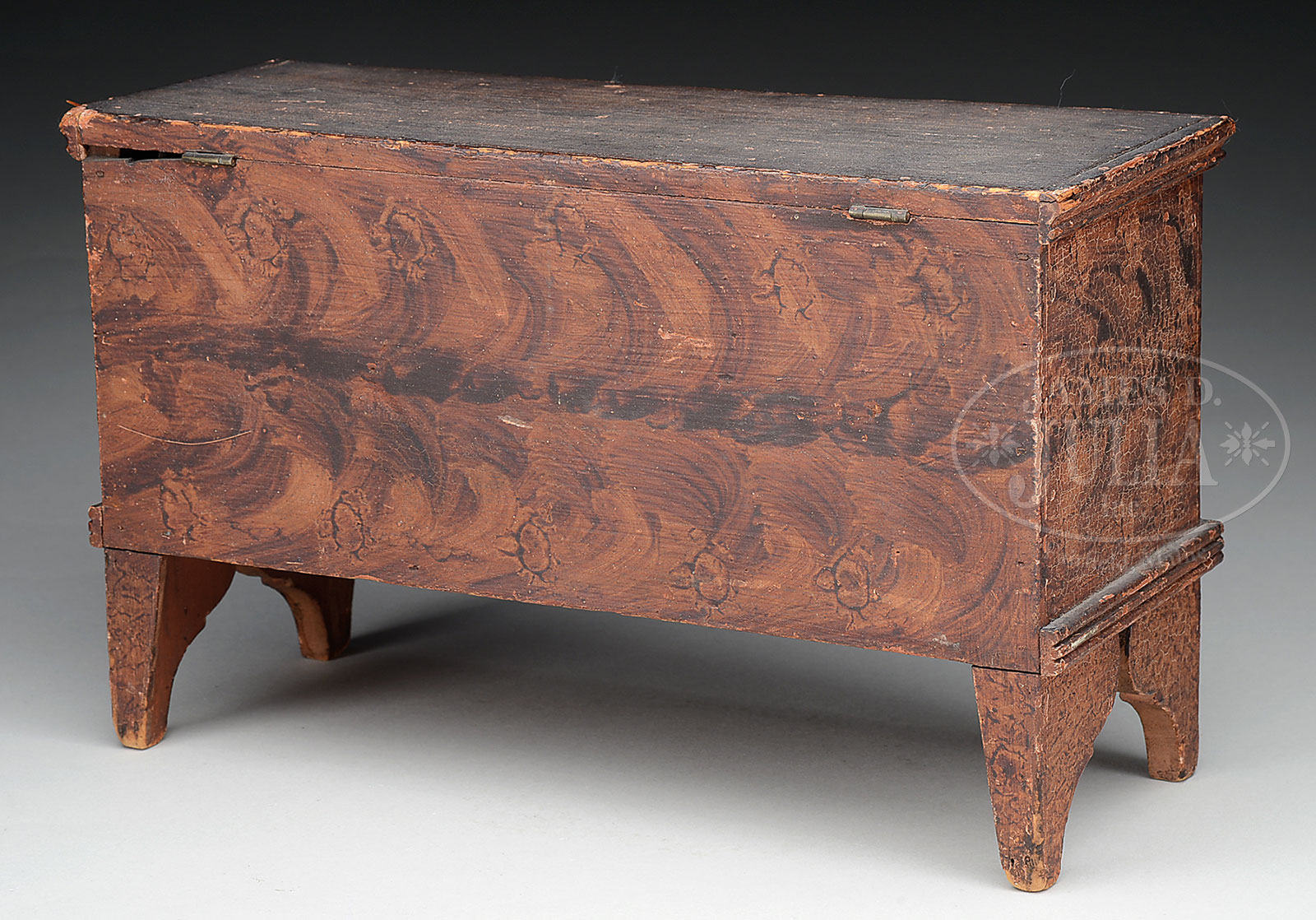 EARLY AMERICAN GRAIN PAINTED MINIATURE PINE BLANKET CHEST.1st half 19th century, New England. The rectangular hinged lid with applied molded edge opening to an interior fitted with an open till. The case with reeded lower molding raised on tapered supports with deeply scalloped returns. The blanket chest with simulated mahogany graining in original red paint with dark highlights. SIZE: 7-1/2″ h x 12-1/2″ l x 4-3/4″ d. CONDITION: Lid with normal soiling, structurally very good, the original painted surfaces with normal and expected in-use wear and abrasion. Very good overall. 51970-6 (1,000-1,500) – Lot 2453