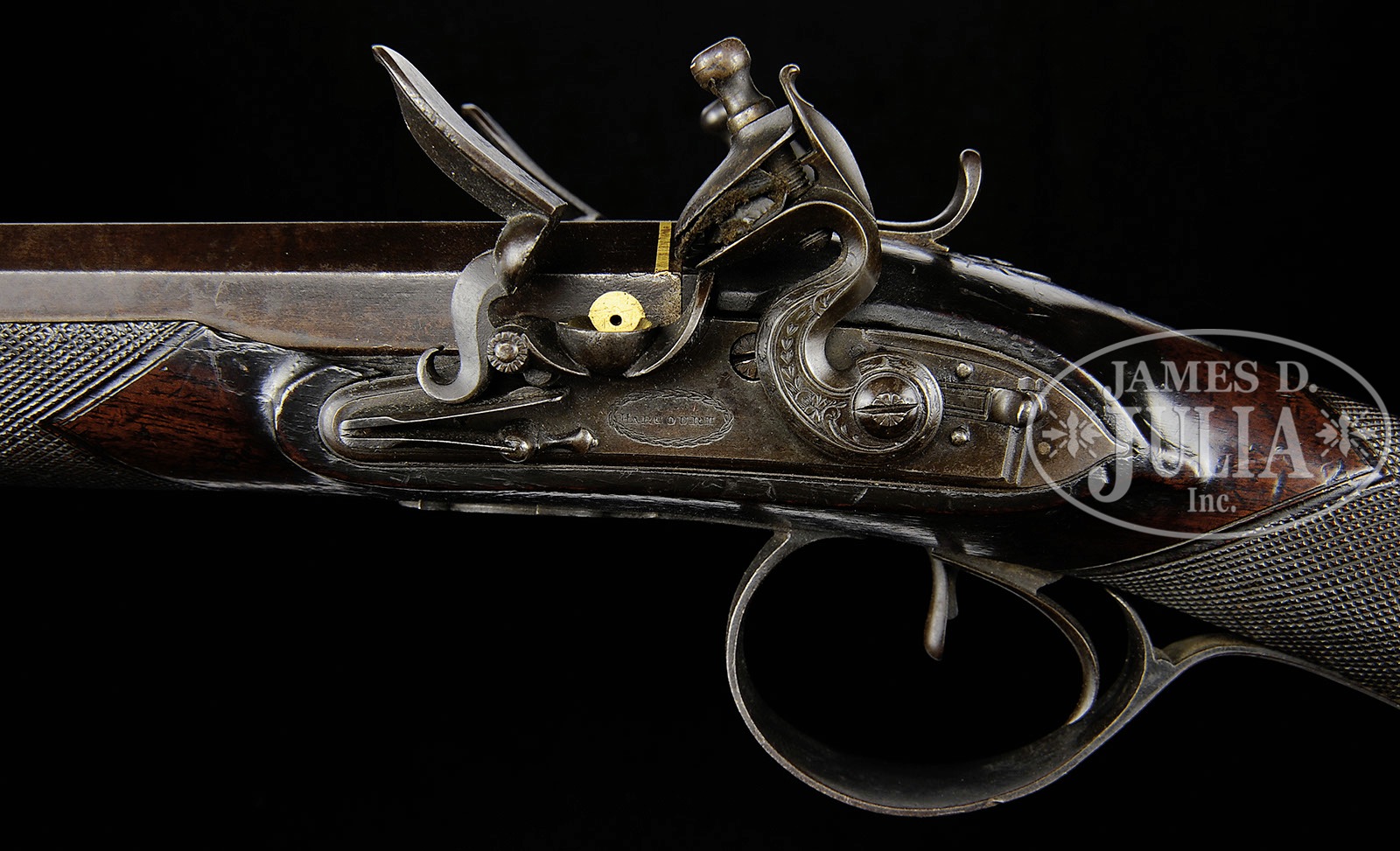 JOHN HARCOURT (IPSWICH) DOUBLE BARREL FLINTLOCK COACH GUN WITH SPRING BAYONET.SN NSN. Cal. .725. Fine quality double flint with 18″ octagon bbls fitted with hinged spring triangular bayonet has locking boss at top of muzzles. Rear portion of bbls has inlaid gold bands and oval gold poincons marked “Harcourt Ipswich”. Touch holes are gold. Feather engraved breech iron has sliding retainer for bayonet tip. Locks with semi-waterproof pans, and bridled roller frizzens have lockplates with nicely molded chamfers, rebated tails, sliding safeties, and flat faced serpentine cocks which have feather engraved flat chamfers and scroll engraved faces. Each lockplate is engraved “Harcourt” within an oval wreath. Relatively plain, but dense, European walnut stock is iron mounted with steel buttplate having long top tang engraved with hunting dog. Double beaded trigger guard with pineapple finial has birds engraved on bow. Point pattern square checkering with mullered borders is at grip and forend. A vacant silver rectangle is at top of grip. Stock attaches to bbl with captive side nail through oval steel escutcheons. Wooden ramrod with brass tip mounts through single beaded pipe and thimble with pineapple finial, matching trigger guard. CONDITION: Very good. Bbl and locks are an even brown patina. There is slight Damascus or twist pattern visible on bbls. Stock retains a considerable amount of what is most likely its orig finish with numerous marks, knocks, and scratches. A 1-1/2″ x 1/2″ piece of wood is missing at top front of left lockplate, and a long sliver from bbl channel on right side. Locks and frizzens are crisp. Bayonet spring is strong, and catches are operable. Cool. 4-51014 MGM119 (6,000-9,000) – Lot 2454