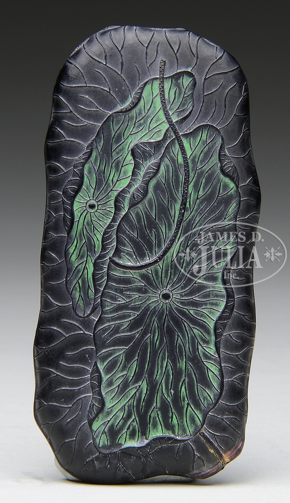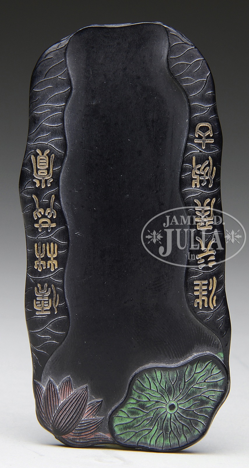 SMALL LOTUS INK STICK.China, 20th c. The small ink stick with lotus leaves and inscriptions on the body. SIZE: 3-1/2″ l x 1-3/4″ w CONDITION: Generally good. 7-75332 (400-600) – Lot 2456