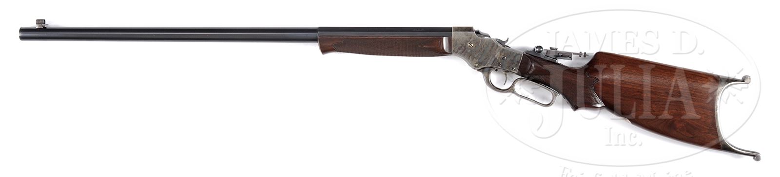 *SCARCE STEVENS MODEL 47 IDEAL “MODERN RANGE” SINGLE SHOT TARGET RIFLE.SN 11241. Cal. 22 Fine target rifle on a 44-1/2 action with 28″ oct to rnd about #3 weight bbl that has globe front sight, no rear seat & a windgauge Vernier tang sight with 3″ staff. Bottom front of receiver has a takedown screw. Trigger is custom checkered with an adjustment screw added into the trigger plate and it has full loop lever. Mounted with replacement, very nicely figured American walnut with checkered Schnable tip forearm, serpentine grip, perch belly, Schuetzen style buttstock that has Swiss-style buttplate. Bottom of stock is inlaid with a small, silver oval. Bbl & buttplate are matching numbered to the rifle; wood is unnumbered. Bottom flat of bbl, under the forearm is stamped “BDL LTD. EDGEFIELD. SC”. This is a prime example of an early shooter reconfiguring his rifle to suit his tastes. CONDITION: Very fine. Bbl retains about 98% strong orig blue with only very faint sharp edge wear. Receiver retains about all of its orig case colors, lightly to moderately faded. Breechblock retains about 90% bright orig blue. Hammer has a bobbed spur. Lever retains bright case colors in sheltered areas, turned silver on outer faces. Buttplate retains most of its orig case colors, moderately to heavily faded, turning silver. The custom, replacement wood is sound and retains most of its fine hand-rubbed oil finish. Mechanics are fine. Bright shiny bore. 49033-13 JR C&R (3,500-5,000) – Lot 2456
