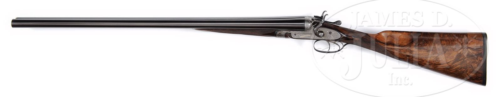 SN 388. (ca 1890) Cal. 12 ga. 2-3/4″ Chambers. 26″ Sleeved bbls are gold inlaid “Henry Atkin (From Purdeys) 18 Oxendon Street Haymarket London” on narrow game rib, which is also engraved “Made of Sir Joseph Whitworths Fluid Pressed Steel”. Gun is no. “2” of a pair with gold inlaid numeral “2” on rear portion of rib and top lever, with no mark on forend. Coin finished bar-in-wood top lever action is fitted with bar locks, sporting tall round bodied serpentine rebounding hammers, which are blued. Action is engraved with full coverage exceptionally well cut, medium scroll. “Henry Atkin” is gold inlaid on banner at the front of each lockplate. Top lever, trigger plate, and trigger guard are blued and scroll engraved. SN is at grip. Finely marbled circassian walnut straight grip buttstock measures 14-1/8″ over composition ribbed buttplate over 1-3/8″ wood extension, which appears to be fitted to orig curve. Stock features attenuated drop points, semi-diamond hand, point pattern checkering with mullered borders, and a silver oval on toe line engraved with indecipherable monogram. Matching splinter Baker ejector forend has Anson release. Bore diameter: left -.725, right -.725. Bore restrictions: left -.010 (IC), right -.006 (IC). Minimum wall thickness: left -.039, right -.039. Drop at heel: 1-9/16″, drop at comb: 1-1/4″. Weight: 6 lbs 0 oz. LOP: 14-1/8″. Leather case with stitched leather corners is lined in scarlet cloth, and has Atkin, Grant, & Lang label in lid. Case contains a 2-pc walnut and aluminum cleaning rod, mop, Turks head, pair of snap caps, and case straps. The key is affixed to replacement handle. PROVENANCE: Consignors information regarding previous ownership of gun including Mrs. Sloan Stancey, and Lady Gleena Winkham. Richard Schreiber Collection. CONDITION: Fine, as refinished. Bbls retain nearly all of a fine re-black done at time of sleeving. Gold inlay on rib has some gaps, engraving considerably washed. Action has been coin finished and is a pleasing silver to gray, engraving still good. Top lever, hammers, trigger plate and trigger guard have been re-blued, and retain nearly all of that blue, engraving somewhat washed, especially on grip. Stock retains a considerable amount of an old French polish finish, which is quite pleasing, with a number of subsequent marks and scratches, checkering competently re-cut. Front portion of bar-in-wood stock is warped slightly downward from action, showing about 1/16″ gap. Bores are excellent. Action is slightly loose. Bbls are slightly off face. Locks are crisp. Ejectors are in time. Case leather is fairly dark, slightly warped, and with considerable scuffing and rubs. Replacement handle is good, but beginning to detach. Replacement straps are good. Interior cloth is good, with rubs and soiling. Label is considerably foxed, and has a number of compressions. Accessories are good. All hammer ejector guns are rare, as are guns by Henry Atkin. 4-45954 (2,000-3,000) – Lot 2457