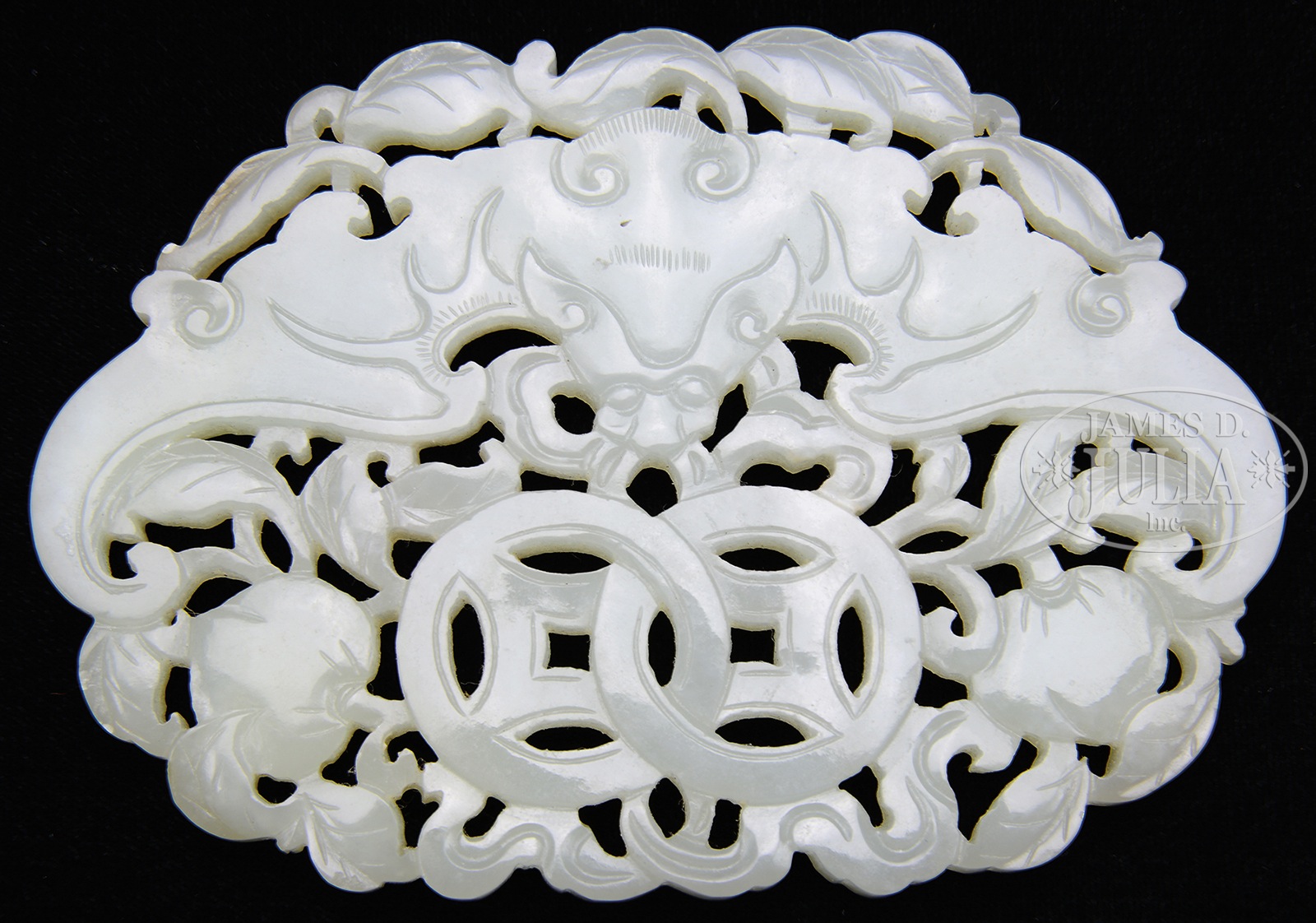 CARVED JADE PLAQUE.China. Of flattened ovoid form, the plaque pierce carved with flying bat, coins, peaches, and other auspicious items, the stone of greyish white. SIZE: 3-7/8″ l x 2-3/4″ w CONDITION: Good. 7-75457 (300-500) – Lot 2457