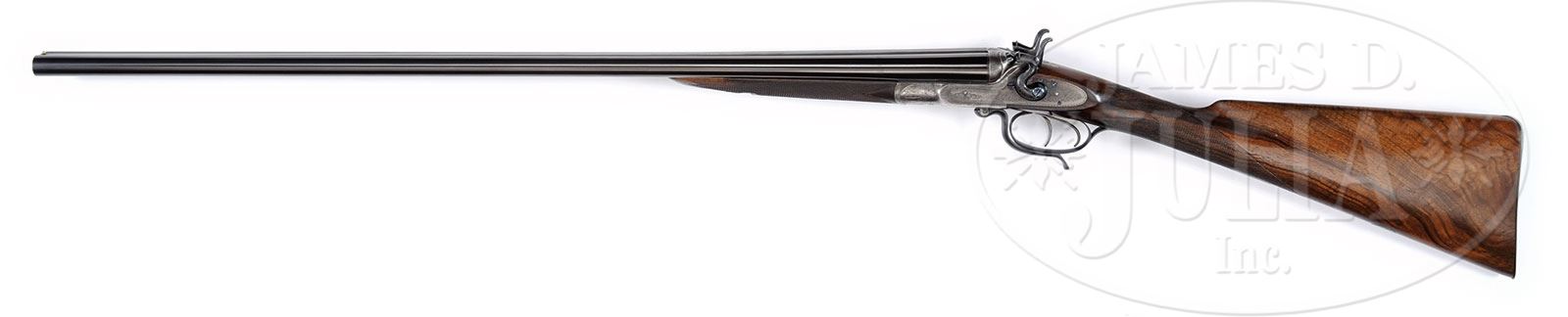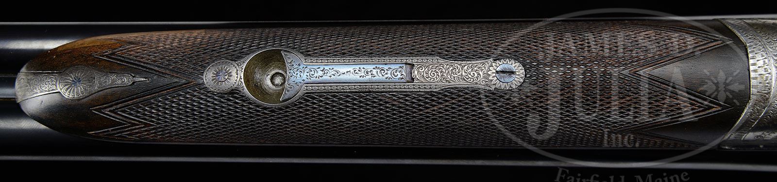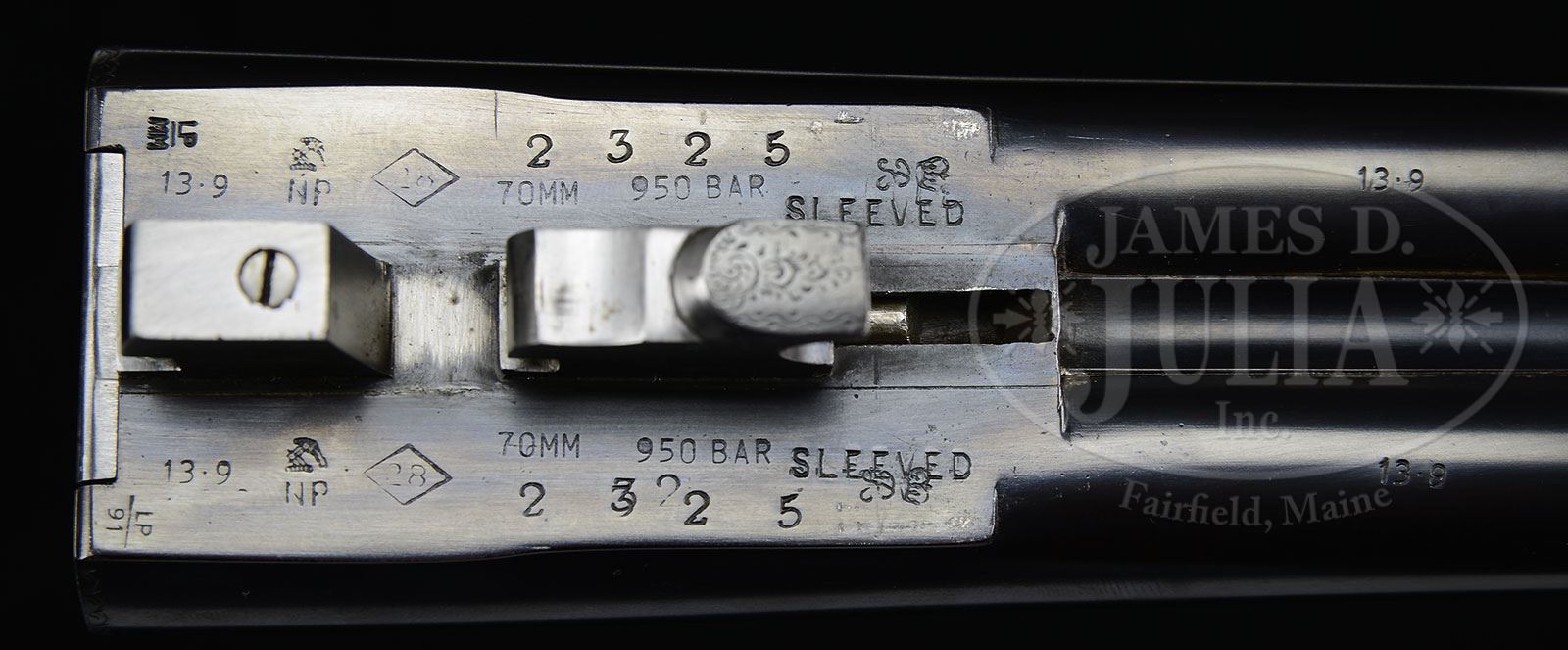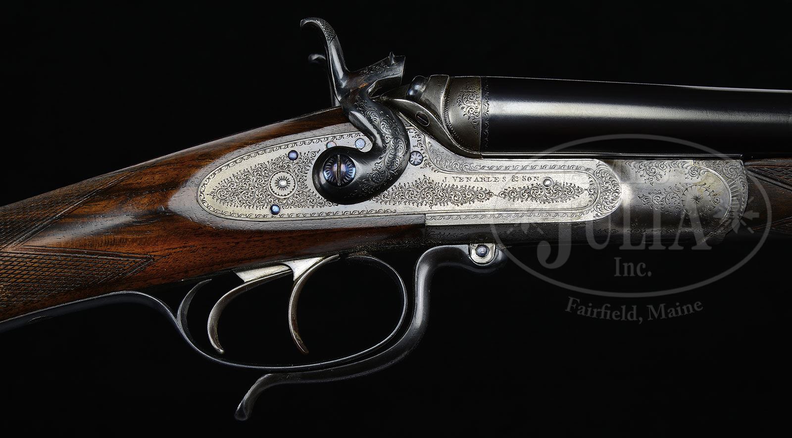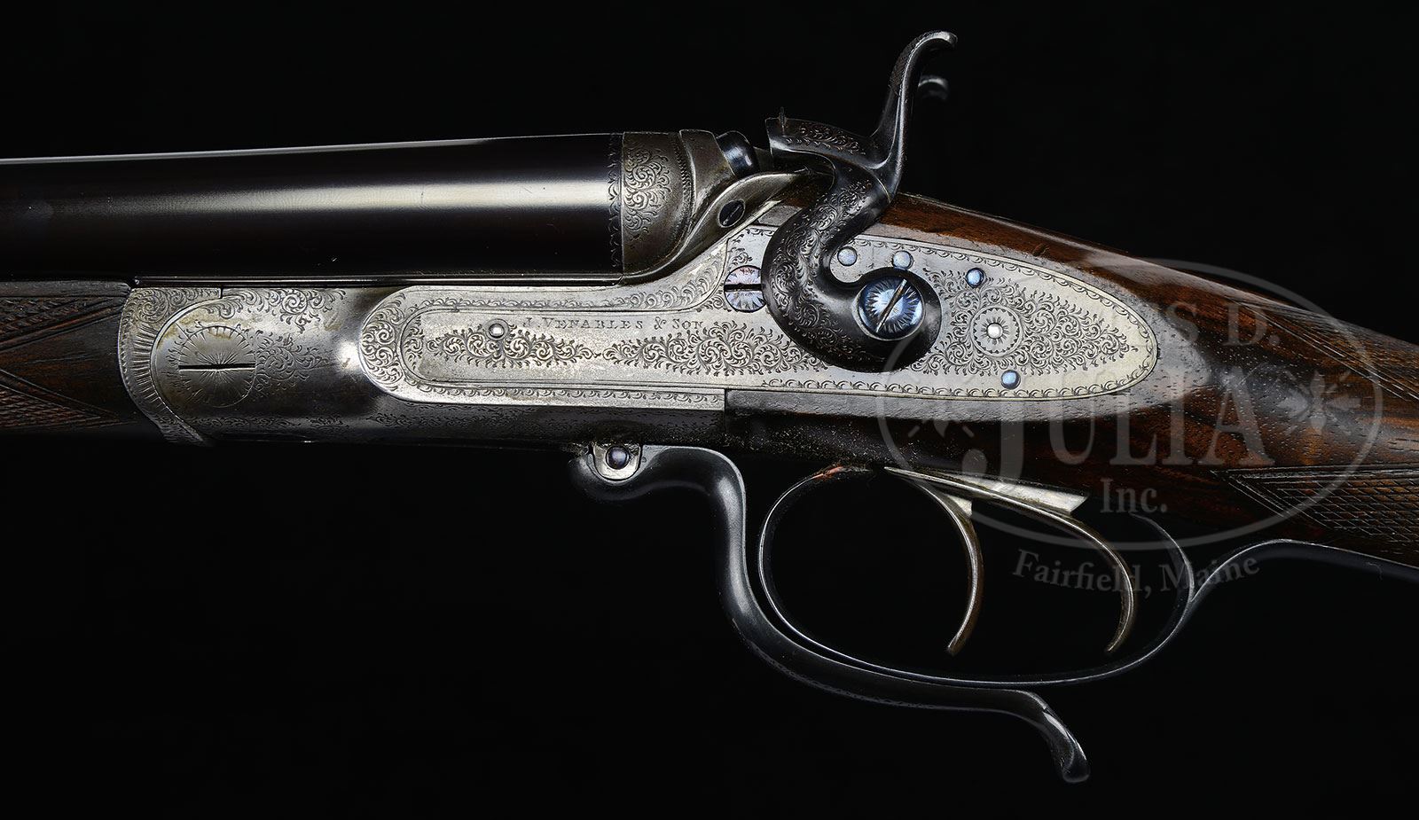 UNUSUAL 28 BORE GAME GUN BY J. VENABLES.SN 2325. Cal. 28 ga. 2-3/4″ Chambers. 28-1/4″ Sleeved bbls are engraved “John Venables 21 St Aldates St Oxford.” on narrow game rib. Bbl flats are stamped with SNs, 1991 London nitro proofs, 2000 re-proofs for 2-3/4″ chambers at 950 BAR and “Sleeved”. Small case hardened lever over guard snap action is fitted with bar action rebounding sidelocks with round bodied serpentine hammers. Action and locks are engraved with 80% coverage well cut scroll. “J. Venables & Son” is on each lockplate. Hammers, opening lever, and trigger guard are blued. SN is on grip. Nicely streaked and finely fiddle figured European walnut straight grip buttstock measures 13-3/4″ over steel buttplate. Flat top point pattern checkering with mullered borders is at grip. Vacant silver oval is on toe line. Matching splinter forend has inlet steel tip and Deeley release. Bore diameter: left -.548, right -.546. Bore restrictions: left -.011 (Mod), right -.008 (IC). Minimum wall thickness: left -.035, right -.038. Drop at heel: 2-1/16″, drop at comb: 1-1/2″. Weight: 5 lbs 1 oz. LOP: 13-3/4″. PROVENANCE: Richard Schreiber Collection. CONDITION: Fine, as refinished. Bbls retain nearly all of a fine rust blue applied at time of invisible sleeving. Action retains traces of case color where protected, but is mostly pewter gray. Hammers, opening lever and trigger guard re-blued, and retain nearly all of that blue. Stocks retain most of an old oil refinish, worn through at grip and forend. Checkering of forend has been re-cut. Bores are excellent. Action is a tad loose. Locks are crisp. A dainty little small bore hammer gun. 4-45929 (2,000-3,000) – Lot 2458 Click here to view provenance