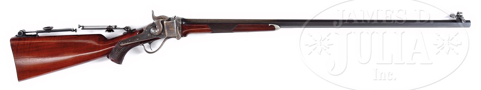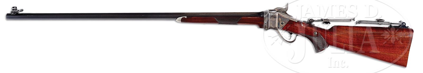 RARE EARLY SHARPS NO 1 CREEDMOOR LONG-RANGE SINGLE SHOT TARGET RIFLE.SN C54159. Cal. 40-90. SHARPS BOTTLENECK Fine early rifle produced before the “1874” model designation was applied to the Sharps. This rifle has 32″ oct bbl, windgage spirit level front sight, no provision for a rear sight and has a matching numbered Sharps Vernier tang sight with 5′ staff. Top flat of bbl is marked with the Hartford address and Cal. marking over the chamber area. Mounted with very nicely figured American walnut with checkered Sharps forearm that has engraved, rnd pewter tip & pistol grip stock with checkered steel Sharps buttplate. Stock has a flat grip cap. Heel of buttstock is aftermarket mounted with a Winchester-style, thick base Vernier sight with 5-1/2″ staff. Matching SN was observed on top tang, under tang sight, bottom of bbl, inside forearm on the lockplate & trigger plate. Buttstock is numbered “54364” on front face and buttplate & grip cap is matching numbered to the buttstock. Accompanied by a Sharps factory records letter which identifies this rifle as having been found in order book no. 1 and that it is a No. 1 Creedmoor Rifle invoiced at Hartford on April 12, 1875 to Schuyler, Hartley & Graham, NY, NY. The record states that this rifle was in Cal. 44 2-5/8″ with 32″ oct bbl. Dr. Richard Labowskie is the current owner of the Sharps records and he states that this rifle has been in his personal collection since 1976 when it was purchased from Capt Avery Young, USN, Dir. of the Service Life Extension Program for Nautilus Class Submarines, of Crystal City, VA. He states that this rifle had descendent in the Wright and Young families of Norwalk, CT. At the time of purchase, it had been in a bank vault storage for 37 years and was unknown until Capt. Young’s father passed away when the bank called him following his father’s death. Also accompanied by a beautiful, extremely well made, red felt lined walnut case, custom fitted to this rifle. Case has brass hinges and English style swinging latches and a mortised lock with functioning key. Case orig had leather carrying handles which have deteriorated and broken. Case also contains an orig wooden, brass-tip cleaning rod. Weight 10lbs 4oz. According to Sharps Firearms, Sellers, there were 134 No. 1 Creedmoor rifles produced Mar 1874 to Dec 1875. PROVENANCE: Dr. Richard Labowskie Collection. CONDITION: Very fine, numbered parts as noted above. Bbl retains about 70% strong orig blue with a cleaned area over the forearm. It appears that a previous owner may have attempted to dull the finish in that area to prevent glare. Receiver, lockplate, hammer & lever retain most of their orig case colors, strong & bright in sheltered areas; moderately faded elsewhere. Buttplate is grey metal patina & grip cap shows strong, bright case colors. Stock has several drilled holes under the buttplate, apparently to lighten the weight for Creedmoor shooting which allows a maximum of 10lbs for an official rifle. Wood is sound with a few, scattered, very minor nicks & scratches and retains virtually all of its orig factory finish, slightly crazed. Mechanics are crisp. Very bright, shiny bore. Case is very fine with a few light nicks & scratches. Lining is moderately to heavily faded with moderate mothing. 49395-1 JR (25,000-35,000) – Lot 2458 Click here to view provenance