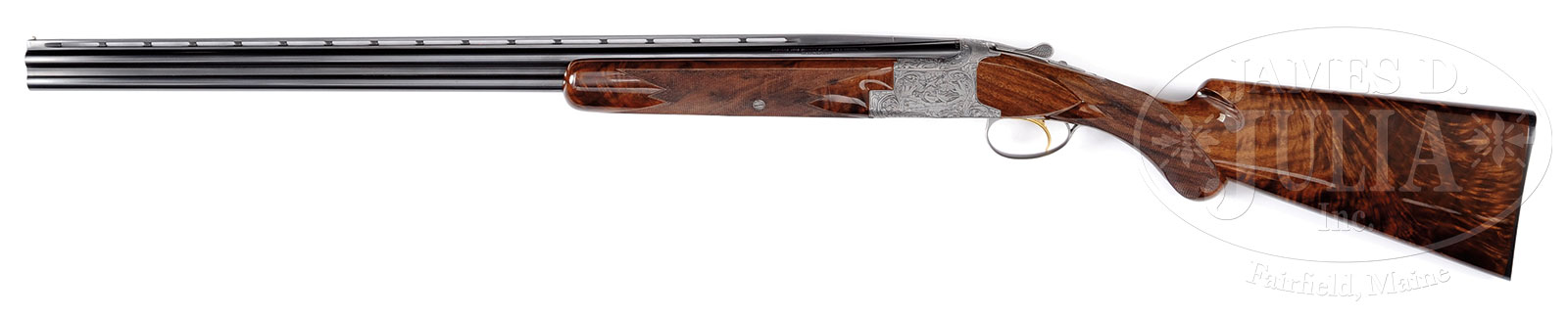 *RARE BROWNING SUPERPOSED 28 GA DIANA GRADE FIELD STYLE SKEET GUN.SN 1418F6. Cal 28 ga. 28″ special steel bbls. 2-3/4″ chambers. Chokes marked “Skeet/Skeet”. Full length matted low profile ventilated top rib with steel front bead. Gold plated sgl selective trigger, auto ejectors, non-auto safety. Expertly crafted flame grain American Walnut buttstock is RKLT configuration. 14-1/4″ LOP over Browning HRBP. Round nose forearm checkered in five-point pattern. Receiver is beautifully engraved in typical Diana pattern and signed “L. Lambert” on both sides. Weight: 6 lbs. 14 oz. CONDITION: Excellent as partially refurbished. Bbls retain nearly all of blue finish. Buttstock and forearm are outstanding expert replacements and retain virtually all of their custom finish. Receiver retains nearly all of its gray coin finish. Mechanics are crisp. Bores are bright and shiny. A very rare high grade small bore Browning for the field. 51500-7 JSL (7,000-10,000) C&R – Lot 2458