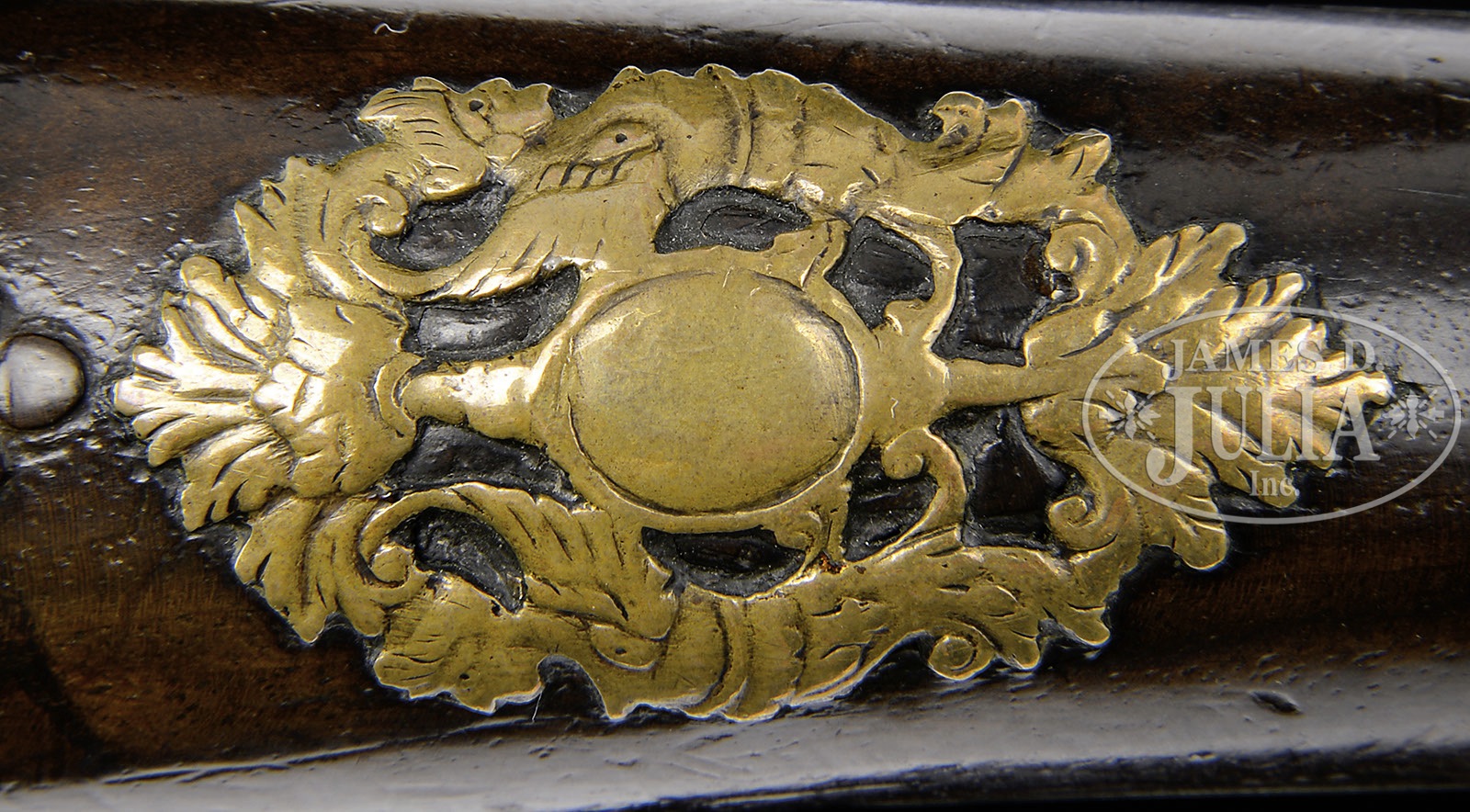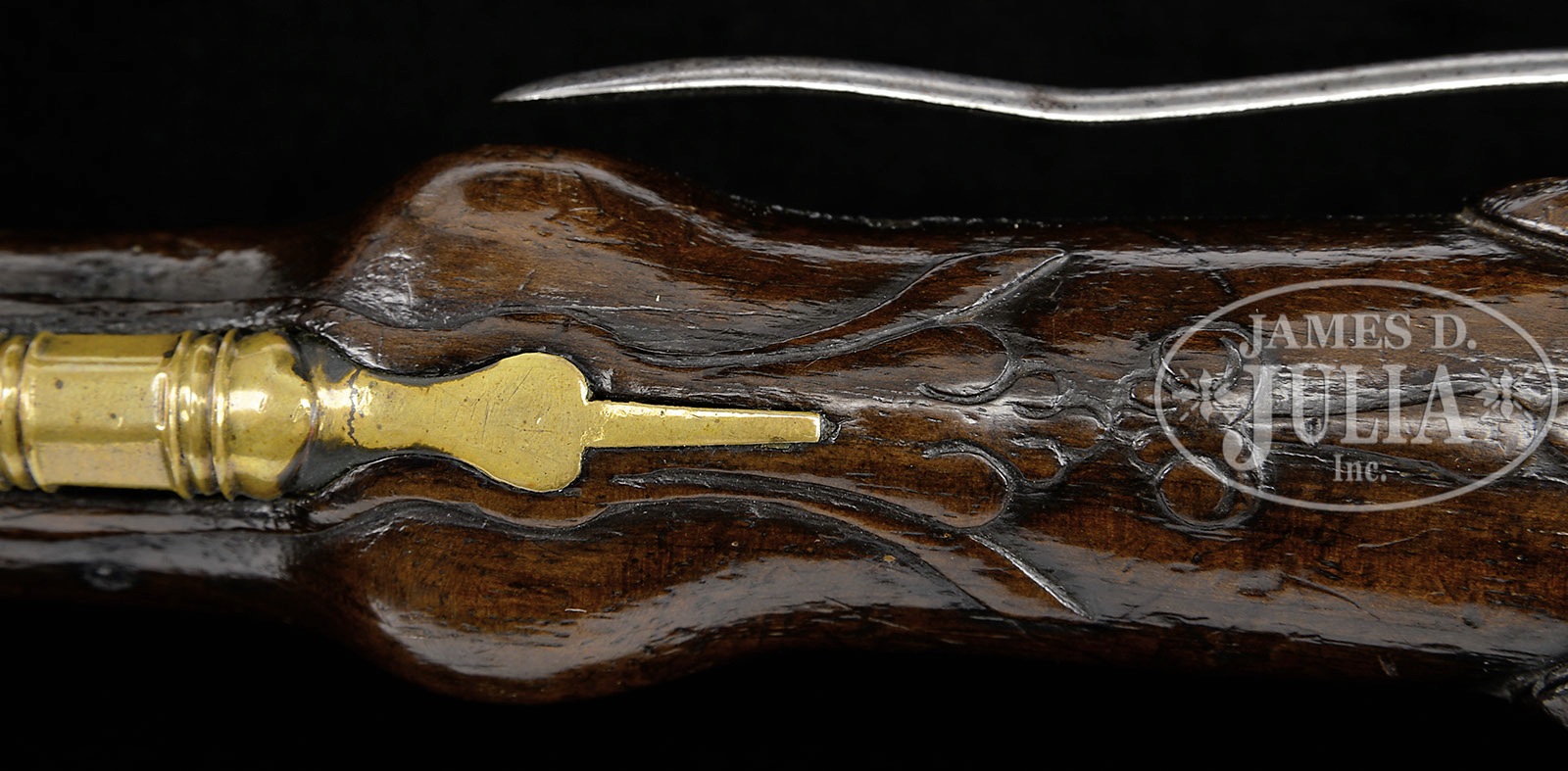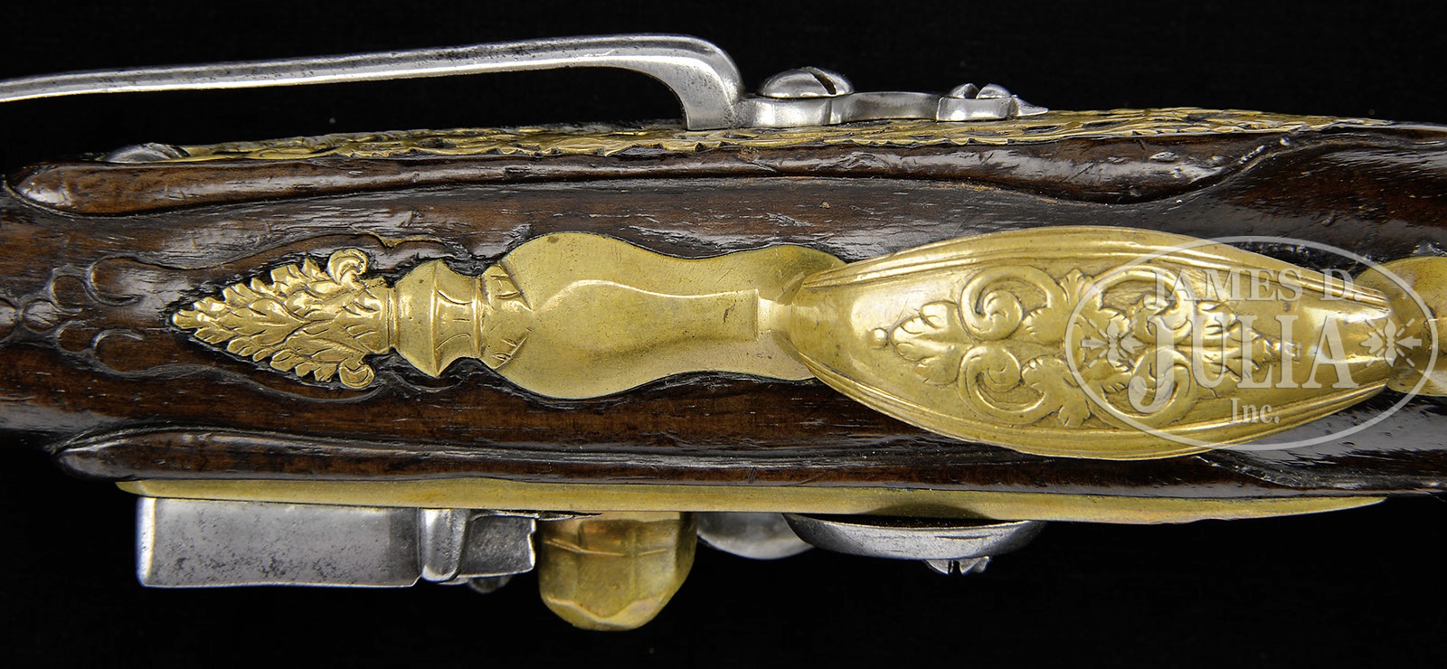 GOOD PAIR OF DUTCH FLINTLOCK HOLSTER PISTOLS WITH UTRECHT MARKS AT BREECH, CIRCA 1700.SN NSN. The plain flat brass lockplates of banana form, gooseneck cock of steel, sculpted frizzen, bronze bbls finely cast and chased with moldings and grotesque mask at breech. Pierced openwork sideplate with Phaeton in chariot. Massive bulbous brass buttcaps with grotesque masks. Molded walnut full stocks with acanthus leaf behind breech and teardrop behind sideplate. A classic pair of late 17th or early 18th century Dutch flintlock pistols in the manner of Penterman. PROVENANCE: A Los Angeles attorney. Collection of Dr. Douglas Sirkin. CONDITION: Overall very good with only minor wear to brass mounts and all small lock parts being original. Stocks are crisp, retaining much original finish. Few if any losses. Long belt hooks are present. Actions are crisp. Ramrods appear to be original. 4-49858 (6,000-12,000) – Lot 2459