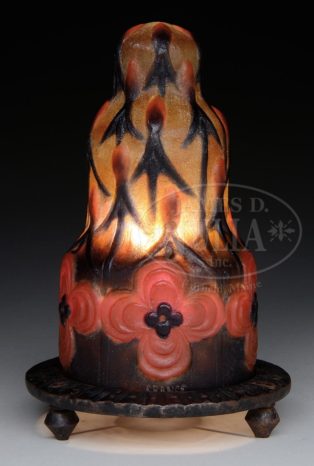 G. ARGY ROUSSEAU NIGHT LIGHT.G. Argy Rousseau night light in the Flowers & Buds pattern features red stylized flowers and buds against a brown shading to amber background, resting on its original base of forged iron with three forged iron feet and rewired with contemporary plastic cord and socket. Similar example pictured in the book G. Argy-Rousseau Glassware As Art by J. Bloch-Dermant, p 211, fig 27.09. Shade is signed on the side “G. Argy Rousseau” and “France”. Base is unsigned. SIZE: 7-1/2″ t. CONDITION: Shade is very good to excellent. Base is very good with some minor wear to patina. 50380-18 (7,000-10,000) – Lot 2460