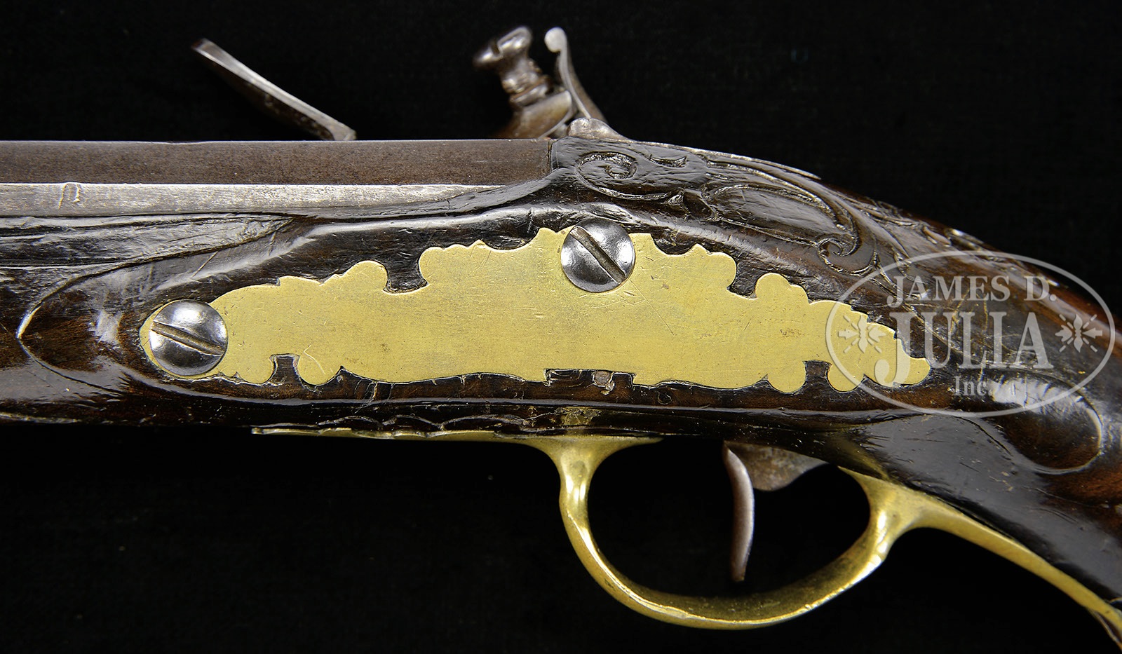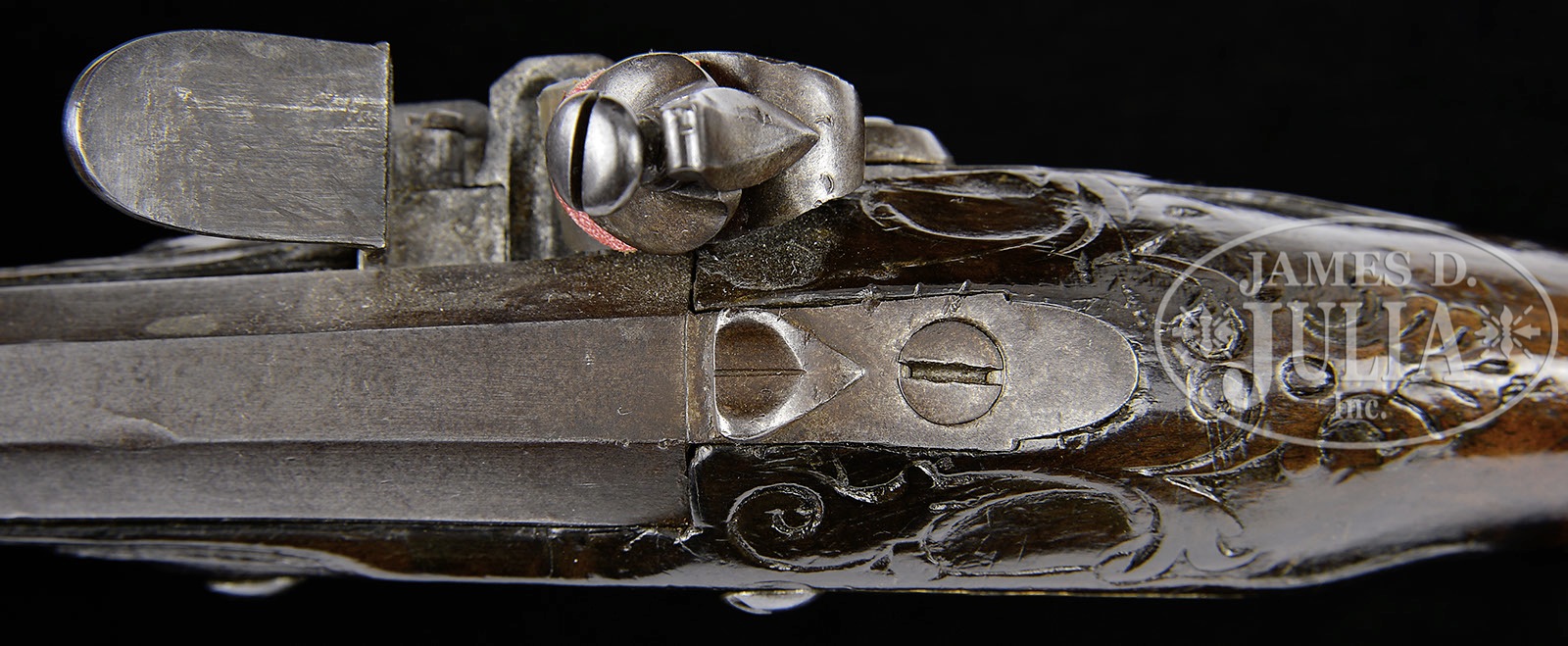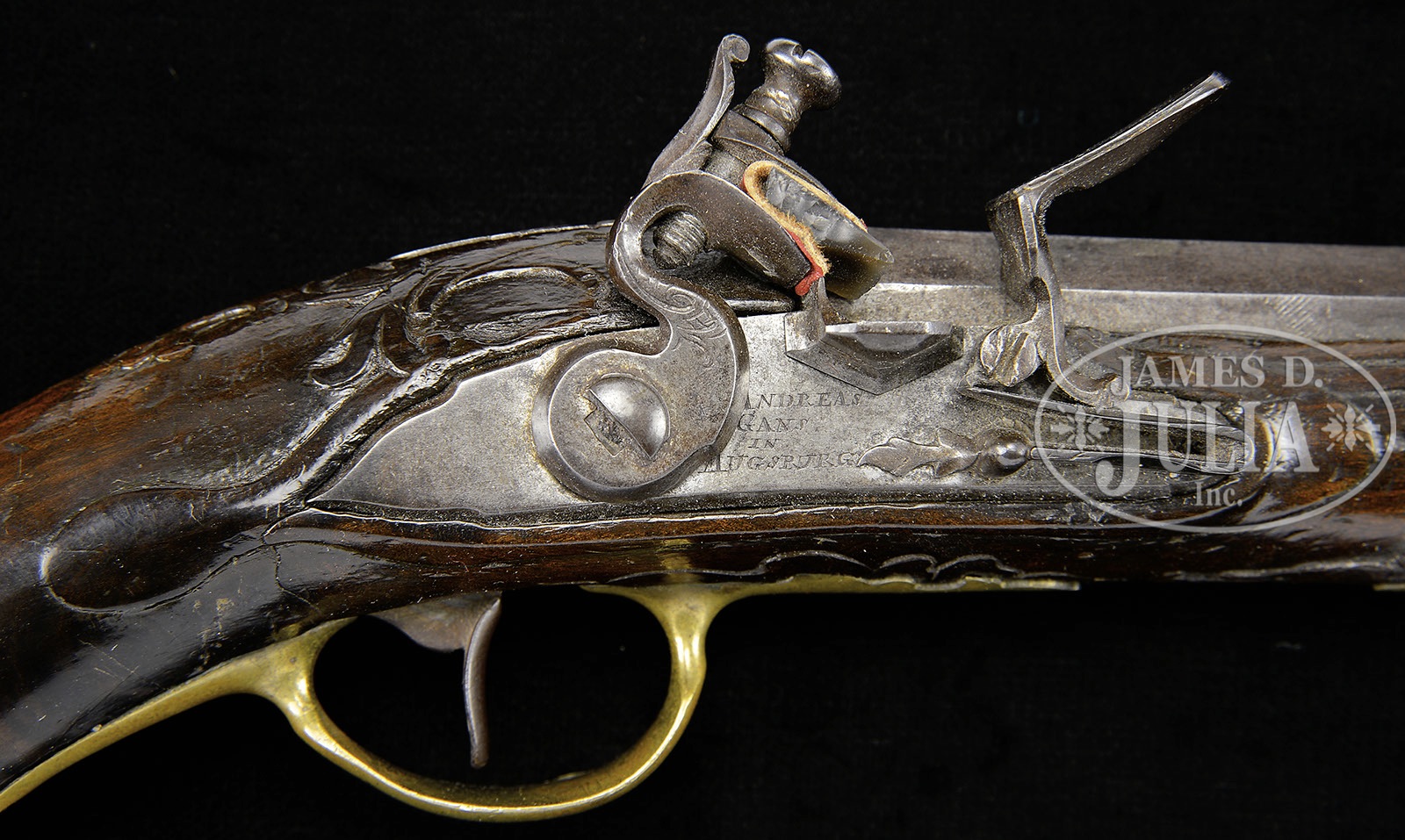 PAIR OF GERMAN RIFLED FLINTLOCK PISTOLS BY ANDREAS GANS, AUGSBURG, CIRCA 1735.SN NSN. Of typical German form with plain unadorned locks, fully signed “Andreas Gans in Augspurg” (sic). Hammer sparsely engraved. Octagonal to rnd bbls deeply rifled. Walnut full stocks with Germanic carving behind breech. Plain brass furniture comprising sideplate, trigger guard, buttcap, and ramrod pipes. Good pair of mid-18th century German flintlock rifled pistols. PROVENANCE: Collection of Dr. Douglas Sirkin. CONDITION: Locks retain all original small parts. Both frizzens reshod. Bbls are crisp and browned, possibly period. Ramrods are original. Stocks good with later varnish. Brass mounts patinated. 4-50113 (2,000-3,000) – Lot 2462
