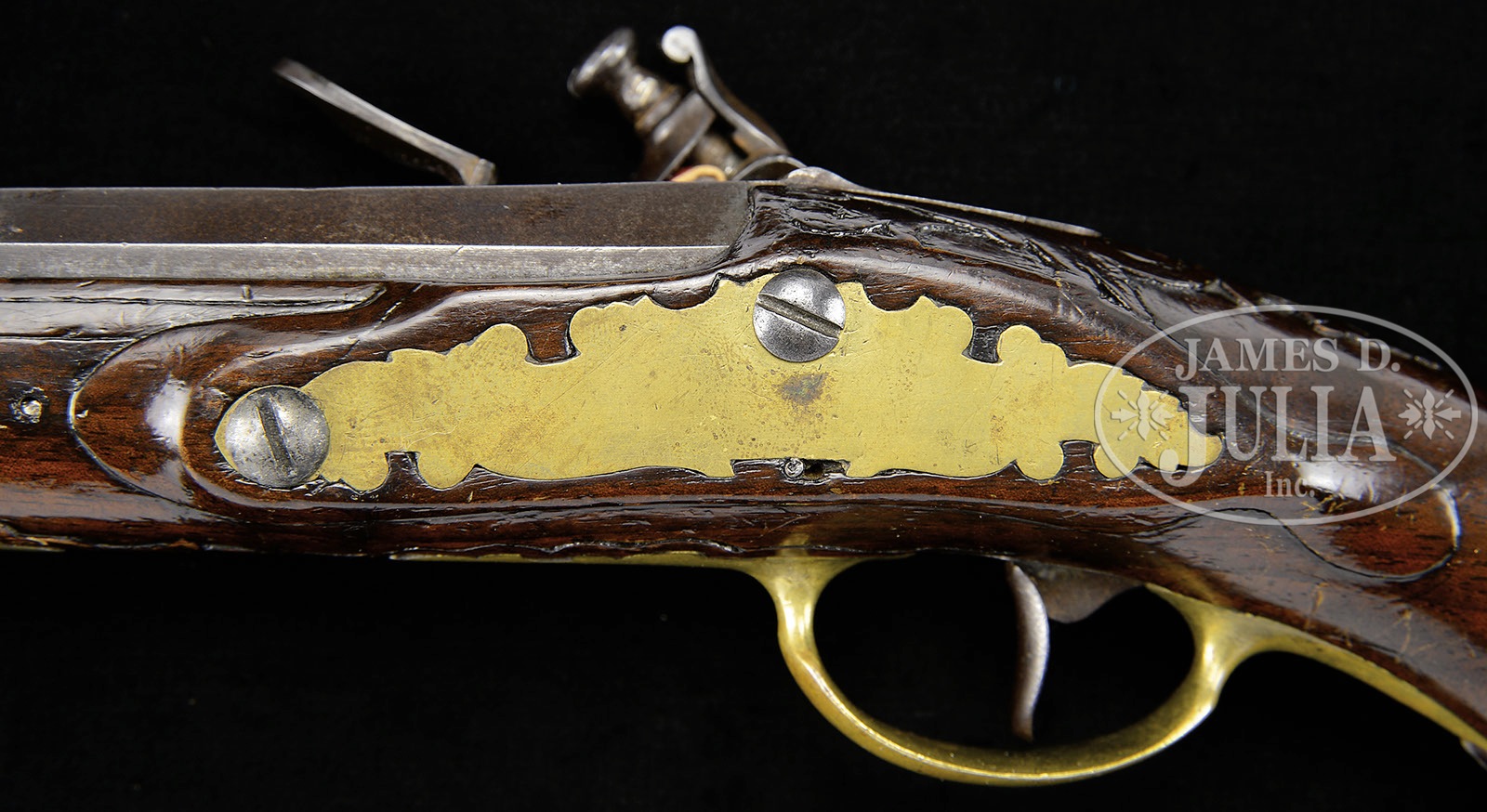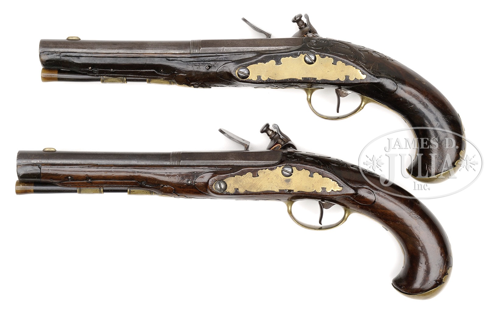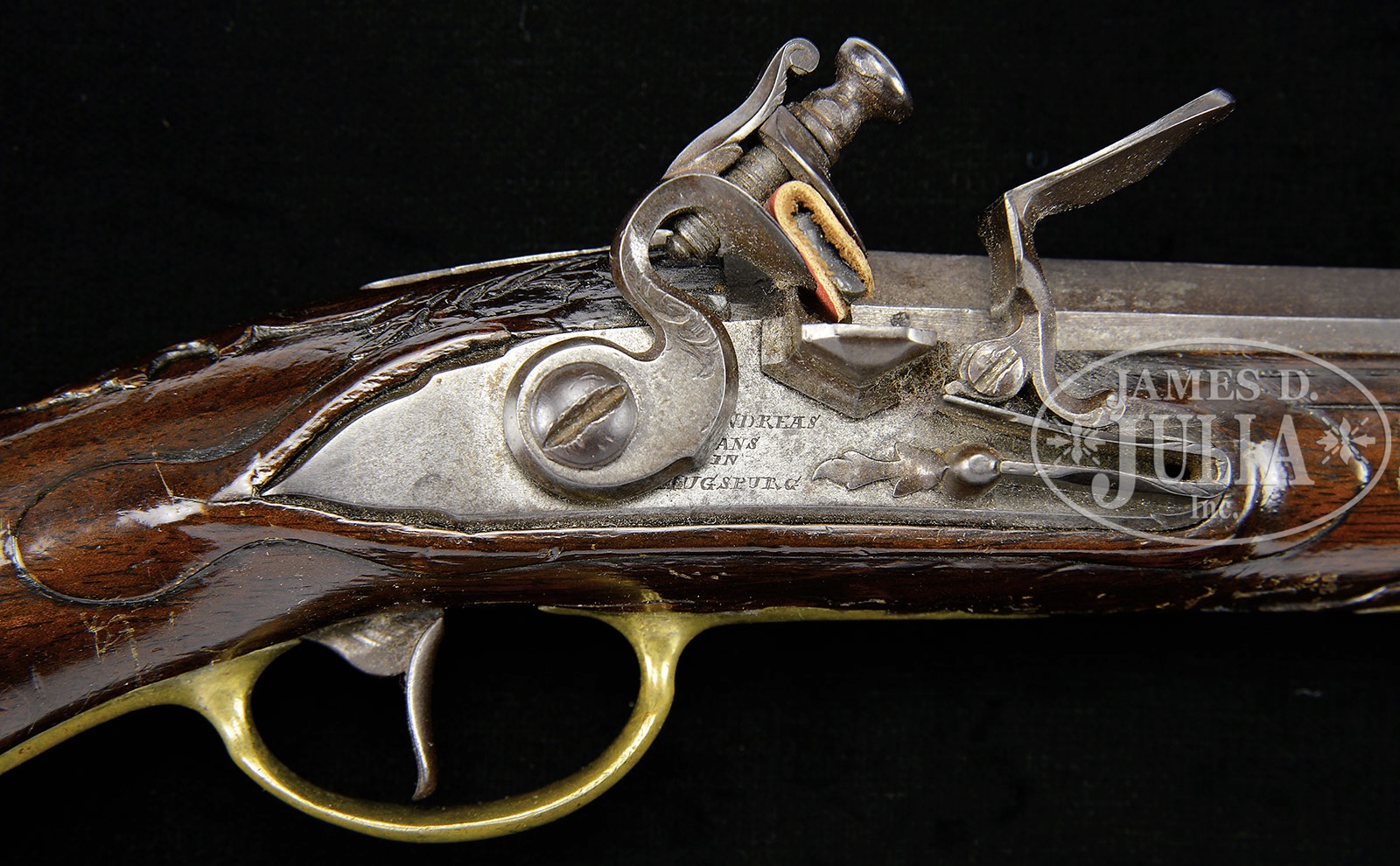 PAIR OF GERMAN RIFLED FLINTLOCK PISTOLS BY ANDREAS GANS, AUGSBURG, CIRCA 1735.SN NSN. Of typical German form with plain unadorned locks, fully signed “Andreas Gans in Augspurg” (sic). Hammer sparsely engraved. Octagonal to rnd bbls deeply rifled. Walnut full stocks with Germanic carving behind breech. Plain brass furniture comprising sideplate, trigger guard, buttcap, and ramrod pipes. Good pair of mid-18th century German flintlock rifled pistols. PROVENANCE: Collection of Dr. Douglas Sirkin. CONDITION: Locks retain all original small parts. Both frizzens reshod. Bbls are crisp and browned, possibly period. Ramrods are original. Stocks good with later varnish. Brass mounts patinated. 4-50113 (2,000-3,000) – Lot 2462