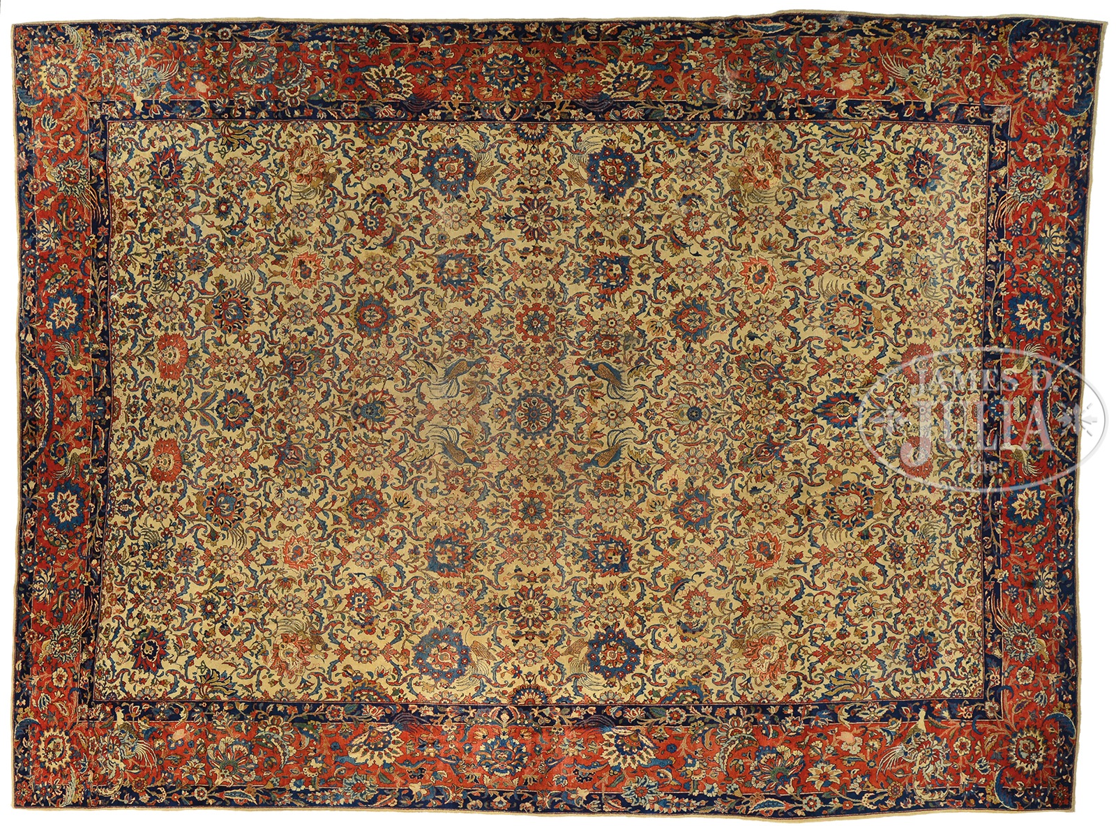 PERSIAN ORIENTAL RUG.First third 20th century. The field of large polychrome lotus and chrysanthemum blossoms amongst foliage on an ivory ground within a rose red main border depicting birds, flowers and foliage. SIZE: 10′ 5″ x 14″ CONDITION: Even wear overall, with soft pallet, good condition. 9-93587 (800-1,200) – Lot 2462