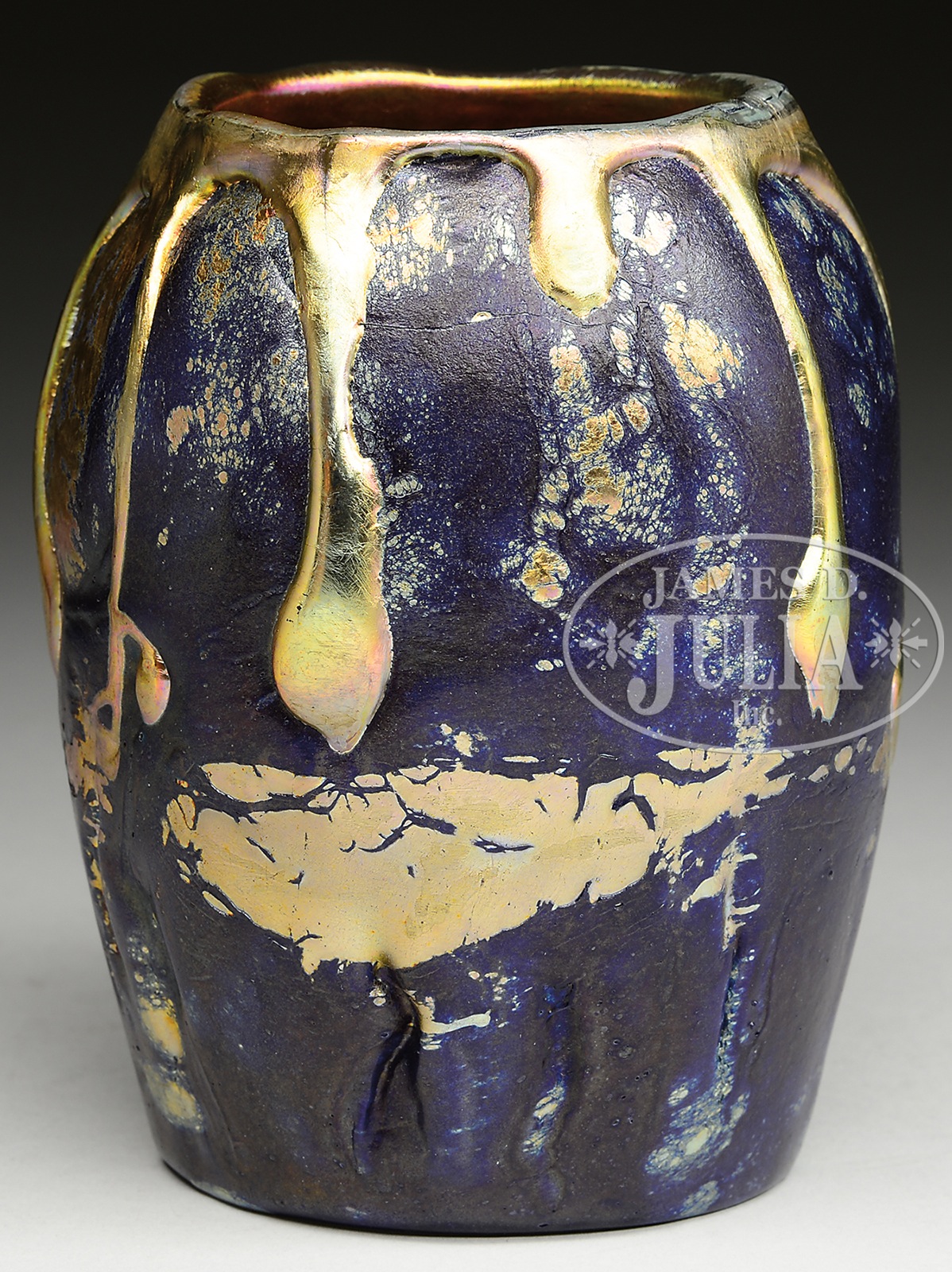 TIFFANY LAVA GLASS VASE.Tiffany vase has dark blue body with gold iridescent lava drippings descending from the lip. The freeform body is further decorated with random areas of gold iridescence. Signed on the underside “L.C. Tiffany-Favrile Alaska-Yukon-X” and numbered “5333C”. SIZE: 5″ t. CONDITION: Vase has a tight hairline crack running down the side which is only noticeable when backlit and does not appear to extend into the exterior of the vase. 5-69011 (8,000-12,000) – Lot 2462
