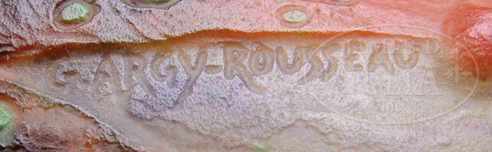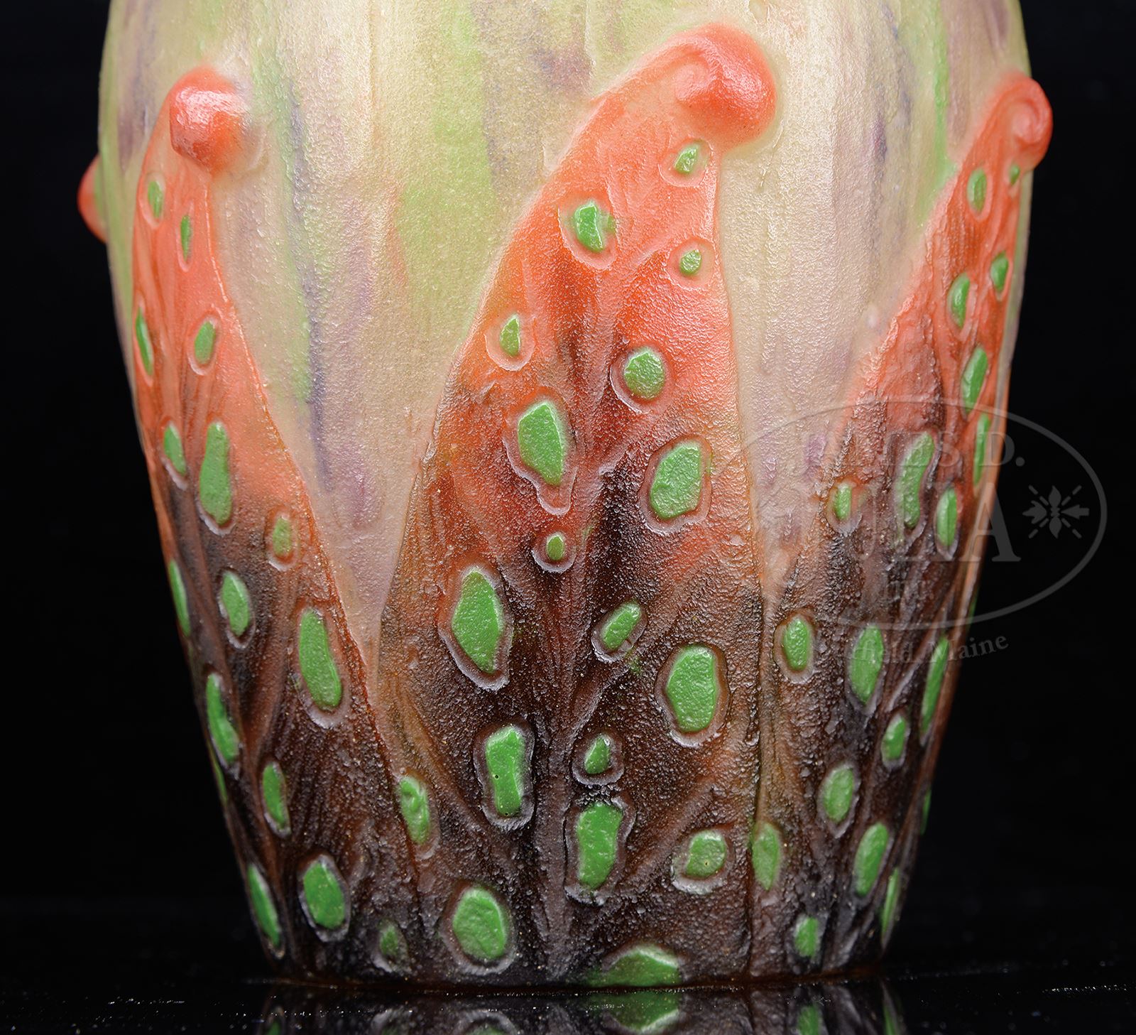 Wonderfully decorated ARgy-Rousseau pate de verre vase has richly colored purple and orange leaves with bright green speckles rising from the bottom of the vase ending in curled tips, all set against a light frosted background with purple and green mottling. When illuminated, the leaves change to deep green and orange earth tones. Similar vase is pictured in G. Argy Rousseau Glassware As Art by J. Bloch-Dermant, p197, fig 24.06. Vase has molded “G. Argy-Rousseau” signature on side and molded “11244” on underside. SIZE: 6-1/2″ t. CONDITION: Very good to excellent. 50501-124 (10,000-12,000) – Lot 2462