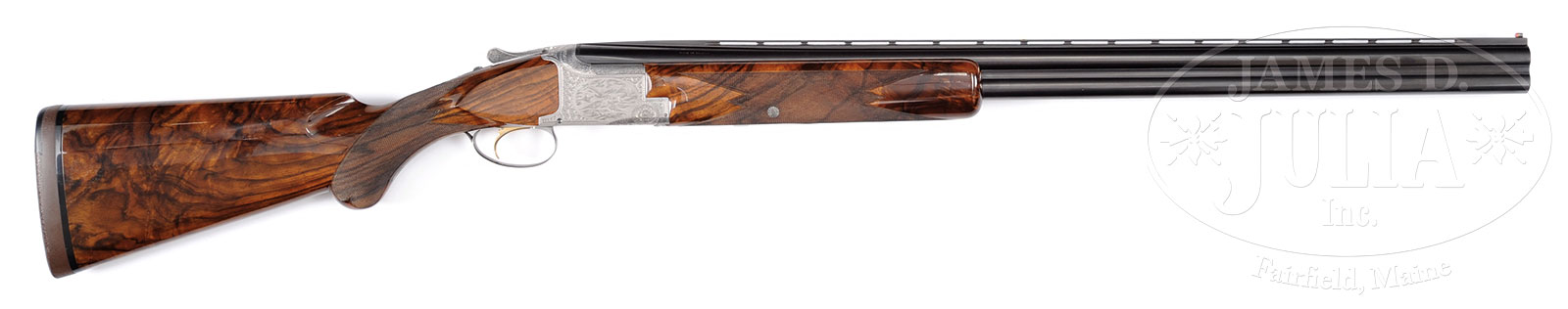 *SCARCE BROWNING SUPERPOSED GRADE 3 SHOTGUN.SN 63699. Cal. 12 ga. 30″ Special steel bbls. 3″ Magnum chambers. Briley choke tubes currently installed. Full length low profile matted ventilated top rib with ivory mid bead and red front bead. Gold plated sgl selective trigger, auto ejectors, non-auto safety. Custom stock is RKLT configuration checkered in three-point pattern with 14-1/4″ LOP over Decelerator pad. Custom round nose forearm checkered in five-point pattern. Receiver is nicely engraved in standard Grade 3 pattern. Accompanied by a set of five Briley choke tubes in plastic case. Weight: 8 lbs. 7 oz. Special Note: This item(s) contains plant or animal properties that may be covered by the Endangered Species Act (ESA). We have taken care to ensure that this item(s) meets the standard for sale under the ESA. However, certain states and other countries have laws that are more restrictive than the ESA. It is the bidder’s responsibility to ensure that it is lawful to purchase or transport this item(s) into their state, and to obtain the necessary import and export approvals. Delay or failure to obtain any such permit or approval does not relieve the buyer of paying for the item(s) and consummating the purchase. CONDITION: Exceptionally fine as restored and restocked, retaining nearly all custom finish to both wood and metal with only minor handling marks and a few light scratches. Mechanics are crisp. Bores are bright and shiny. 51500-5 JSL (2,000-3,000) C&R; ESA – Lot 2462