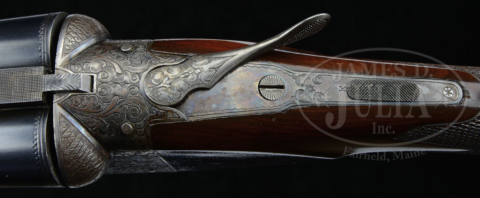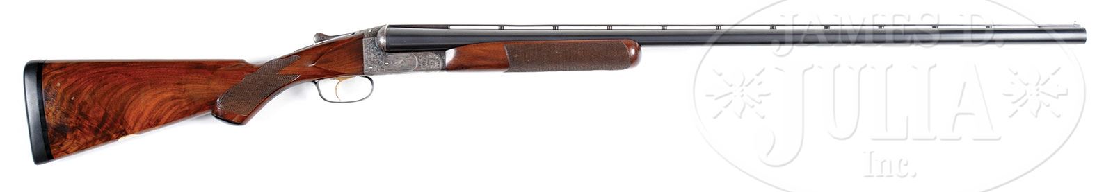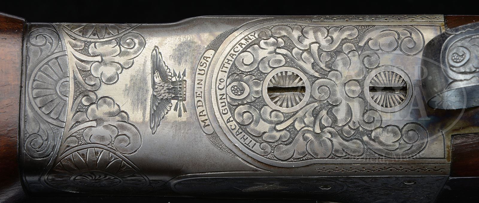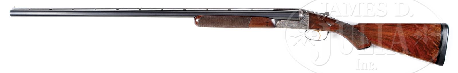 *ITHACA NID GRADE 5E DOUBLE TRAP GUN.SN 450090. Cal. 12 ga. 2-5/8″ Chambers. 32″ Ventilated rib bbls are stamped with SN and grade on engine turned bbl flats. Case hardened action features non-automatic safety, early pin type cocking indicators, and gold-plated, selective single trigger. Action is engraved in typical “5E” style with large shaded acanthus scroll covering over 50% of the action, outlining vignettes of game birds inlaid in silver; a pheasant on left, and snipe on right. Bottom of action is engraved with heraldic eagle with cluster of arrows in talons over “MADE IN USA” over Ithaca name and address on trigger plate. Matching blued trigger guard has SN at grip. Nicely flame figured American walnut capped pistol grip buttstock measures 14-1/4″ over black Old English pad. Point pattern checkering with wavy border is at grip, and a vacant gold oval is on toe line. Short beavertail forend does not have reinforcing bolt, and is milled out to reduce weight. Bore diameter: left-.734, right -.733. Bore restrictions: left -.009 (IC), right -.015 (Mod). Minimum wall thickness: left -.026, right -.026. Drop at heel: 1-5/8″, drop at comb: 1-9/16″. Weight: 8 lbs. 3 oz. LOP: 14-1/4″. CONDITION: Excellent, retaining an inordinate amount of orig finishes on wood and metal, bbls over 95%, action over 80%, thinning and silvering on bottom, and stocks over 80%, loss from hand wear on forend and slightly at butt from installation of new pad. Bores are excellent. Action is tight. Single trigger works. 4-53539 MGM126 (4,500-7,500) – Lot 2463