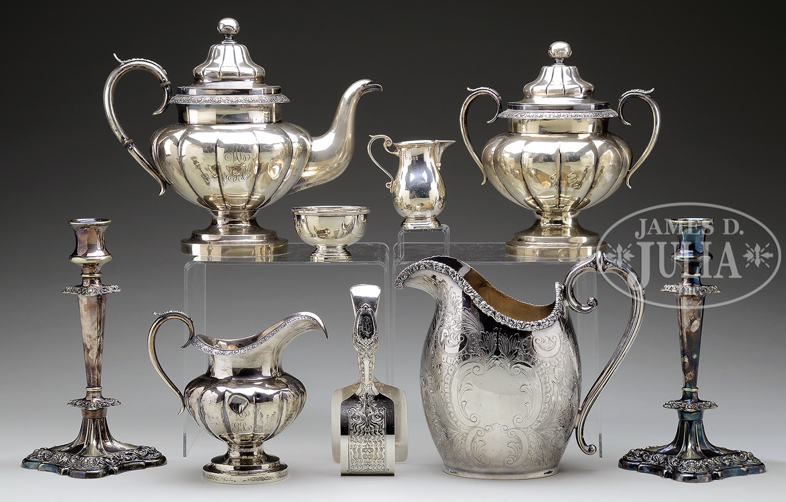 THREE PIECE AMERICAN COIN SILVER TEA SET BY JONES, LOWS & BALL, ALONG WITH TIFFANY STERLING TONGS, STERLING SUGAR AND CREAM, SILVER PLATED PITCHER AND PAIR OF CANDLESTICKS.Lot including: 1) Three piece coin silver tea set marked on bottom “Pure Silver Coin Boston Jones, Lows & Ball” (Boston, c. 1839). Set consists of 9-1/2″ high footed teapot, 8-1/2″ high footed covered sugar, 6-1/2″ high footed creamer. Each piece having double monogram, flower and leaf decorated rim and melon-type ribbing to the tapered bodies. 2) 7-1/2″ long tongs (probably asparagus) by Tiffany & Co in the “Broom Corn” pattern. Tongs have Tiffany mark with “T” (1891-1902), monogrammed. 3) 4″ creamer with matching 2″ sugar bowl, marked “Made in England Sterling” also hallmarked “Birmingham”. 4) 10″ pair silverplated candlesticks marked “Plated by Gorham Mfg. Co. 20702”. 5) 8-1/2″ high silverplated English fancy pitcher. SIZE: Sizes as noted above. COIN SILVER WEIGHT: 66 tr. oz. STERLING SILVER WEIGHT: 12 tr. oz. TOTAL WEIGHT: 78 tr. oz. CONDITION: 1) Body dents, otherwise good. 2) Very good. 3) Very good. 4) Tarnished, very good. 5) Very good. 50276-6 (500-700) – Lot 2466