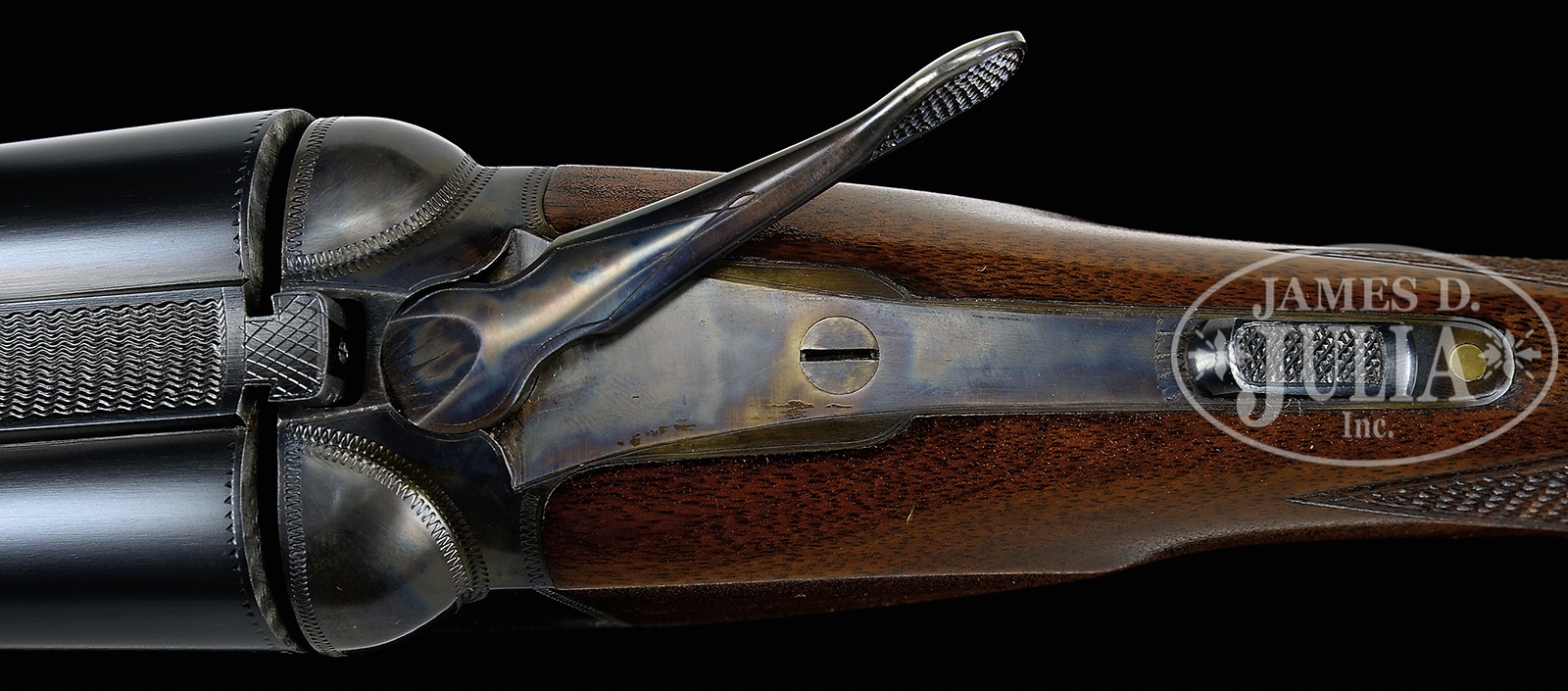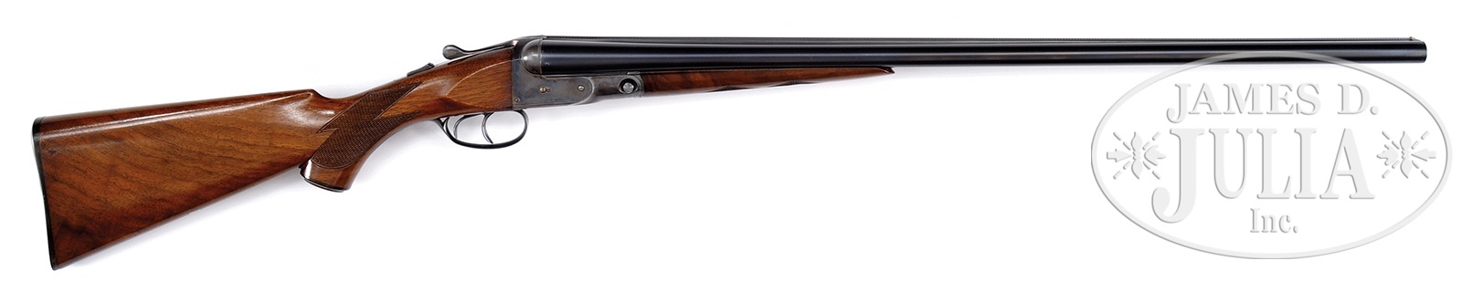 *EXCEPTIONAL HIGH ORIGINAL CONDITION REMINGTON/ PARKER 16 GAUGE VHE.SN 241747. (1940) Cal. 16 ga. 2-5/8″ Chambers. 1 Frame. 28″ Bbls are unmarked on matted top rib. Bbl flats and lumps have all correct markings including Parker overload proofs, chokes, and Remington date code “AJ” (March 1940). Grade, gauge and chamber markings are on left side of lump. Splinter is of “one piece” type. Case hardened action features automatic safety and dbl triggers. Action is engraved with typical wiggle borders. “PARKER” is on bottom of action. Water table is stamped “MADE IN USA ILION, N.Y.” SN is on trigger guard tang. Lightly figured American walnut Parker capped pistol grip buttstock measures 14″ over Parker dogs head buttplate without spur (or “BROTHERS”). Typical point pattern checkering is at grip. Vacant German silver shield is on toe line. Matching splinter ejector forend has typical latch, and does not have patent date on iron. Bore diameter: left – .674, right -.674. Bore restrictions: left -.033 (full), right -.014 (Mod). Wall thickness: left -.028, right -.028. Drop at heel: 2-5/8″, drop at comb: 1-11/16″. Weight: 7 lbs. 2 oz. LOP: 14″. This gun is too late for listing in the PARKER GUN IDENTIFICATION & SERIALIZATION ledger. CONDITION: Exceptionally fine, near new, appears essentially unfired since proof, and retains essentially all of its orig factory finishes on wood and metal, with only a few slight marks and scratches, most notably a group of scratches at breech end of right bbl. Varnish of stocks has considerable “attic burn” and crazing. Mechanically crisp. An excellent benchmark gun by which to judge the originality of others. 49708-8 MGM12 (5,000-8,000) – Lot 2467