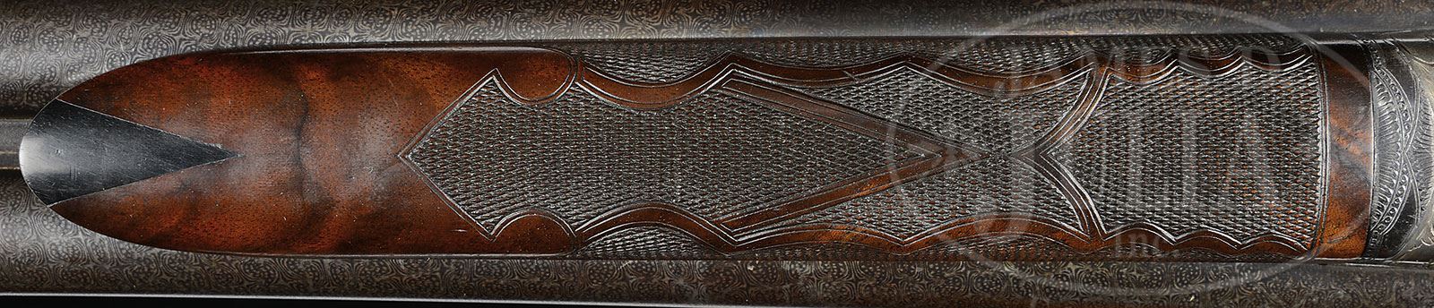*LOVELY ORIGINAL CONDITION 10 BORE ITHACA GRADE 4 MINIER MODEL.SN 157531. (1908) Cal. 10 ga. 3-1/4″ Chambers. 30″ Beautiful, intricately patterned, Damascus bbls with concave, matted rib, are marked with SN on water table, and grade on rear lump. Typical Minier case hardened action (only in production for two years) with large fences to accommodate extra heavy breeches of 10 ga. bbls, is stamped with SN, grade, and gauge on water table. Action is fitted with non-automatic safety and gold-plated double triggers. Action is engraved with 30% coverage very well cut various sized scroll, surrounding nicely detailed dogs on sides of action; a pointing pointer on left, and pointing setter on right, both surmounted by “Ithaca Gun Co”. Bottom of action, with more scroll, portrays a quacking duck flying over marsh. Top lever and trigger guard are blued, and trigger guard is engraved with interesting line and foliate border surrounding lozenge shaped vignette of feeding pheasant. SN is at grip. Lightly flame figured American walnut round knob pistol grip buttstock measures 14-1/8″ over Ithaca composition buttplate. Fleur-di-lis checkering with fleur-di-lis through pattern are at grip, and a vacant gold shield is on toe line. Matching splinter forend has inset dark wood tip and J-spring release. Bore diameter: left-.764, right -.758. Bore restrictions: left -.026 (Mod), right -.024 (Mod). Minimum wall thickness: left -.045, right -.038. Drop at heel: 2-3/4″, drop at comb: 1-3/4″. Weight: 9 lbs. 3 oz. LOP: 14-1/8″. PROVENANCE: William Hammond Collection. CONDITION: Excellent. Bbls retain over 90% of their orig black and white finish, thinning somewhat at muzzles, and around forend. Action retains 60 – 70% orig case hardening color, pleasingly silvered around bottom and around fences. Top lever and trigger guard show some slight silvering. Stocks retain most of what appears to be their orig finish, with some added oil on butt over a number of light marks, scratches, and bumps. There are incipient cracks on tops of both side panels, running 1″ back from action. Bores are excellent, with two small patches of slight frosting on right bbl breech end. Action is tight. A scarce high grade Ithaca. 4-50475 MGM234 (3,500-5,500) – Lot 2468