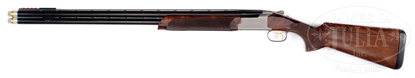 *BROWNING MODEL 725 SPORTING GUN WITH CASE AND FULL SET OF BRILEY SUB-GAUGE INSERTS.SN 09656ZX. Cal. 12 ga. 30″ bbl. 3″ chambers. Four 12 ga choke tubes. Full length matted top rib with white plastic center bead and custom red plastic front sight. Gold-plated checkered sgl selective trigger, auto ejectors, non-auto safety. Stock is full pistol grip checkered through wrist with adjustable comb. 14-3/4″ LOP over soft black “Inflex Technology” pad. Schnabel forearm checkered on sides with Deeley release. Polished receiver with oval pattern on sides and marked “Browning/725/Sporting” on bottom. Browning gold emblem on sides and trigger guard. This gun is housed in a steel Americase with blue velvet liner. Top side with Briley inserts, bottom with compartments for wrenches and other “goodies” enclosed. Weights with 28 ga inserts: 8 lbs. 13 oz. CONDITION: Excellent overall, showing light competitive sporting clays use retaining nearly all orig finish to both wood and metal with very light scattered handling marks. Case is excellent with minor handling marks and rubs. These are very high quality competition guns. 51393-9 JSL (1,800-2,750) – Lot 2468