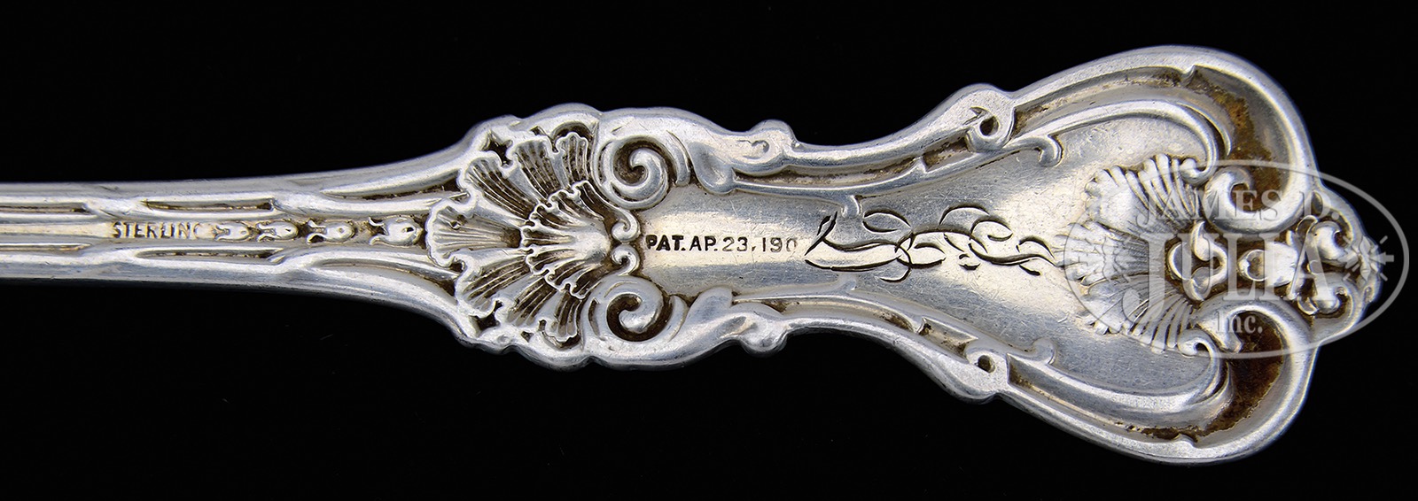 84-PIECE STERLING SILVER FLATWARE SET BY WHITING IN THE “KING EDWARD” PATTERN.Lot consists of: Six 8″ forks; Three 7″ forks; Eleven 6-1/4″ salad forks; Four 8-1/2″ tablespoons; Eleven 7″ soup spoons; Seven 6″ teaspoons; Twelve 5″ bullion spoons; Three 7″ spoons; Eight 5-1/2″ grapefruit spoons; Four 4″ demitasse spoons; Six 5-3/4″ solid handled butter knives; 8″ ladle; 6″ ladle; 5″ sugar tongs; Five 6″ hollow handled butter knives; & 11″ carving fork. TOTAL WEIGHT: 95 tr. oz. (without hollow handle butter knives & carving fork). Housed in a lift lid wood box with some scarring. PROVENANCE: Maralyn Young estate, Arundel/Falmouth Maine, being sold unreserved. CONDITION: Good, some bends to handles, monogrammed. 51412-79 (1,000-1,500) – Lot 2468
