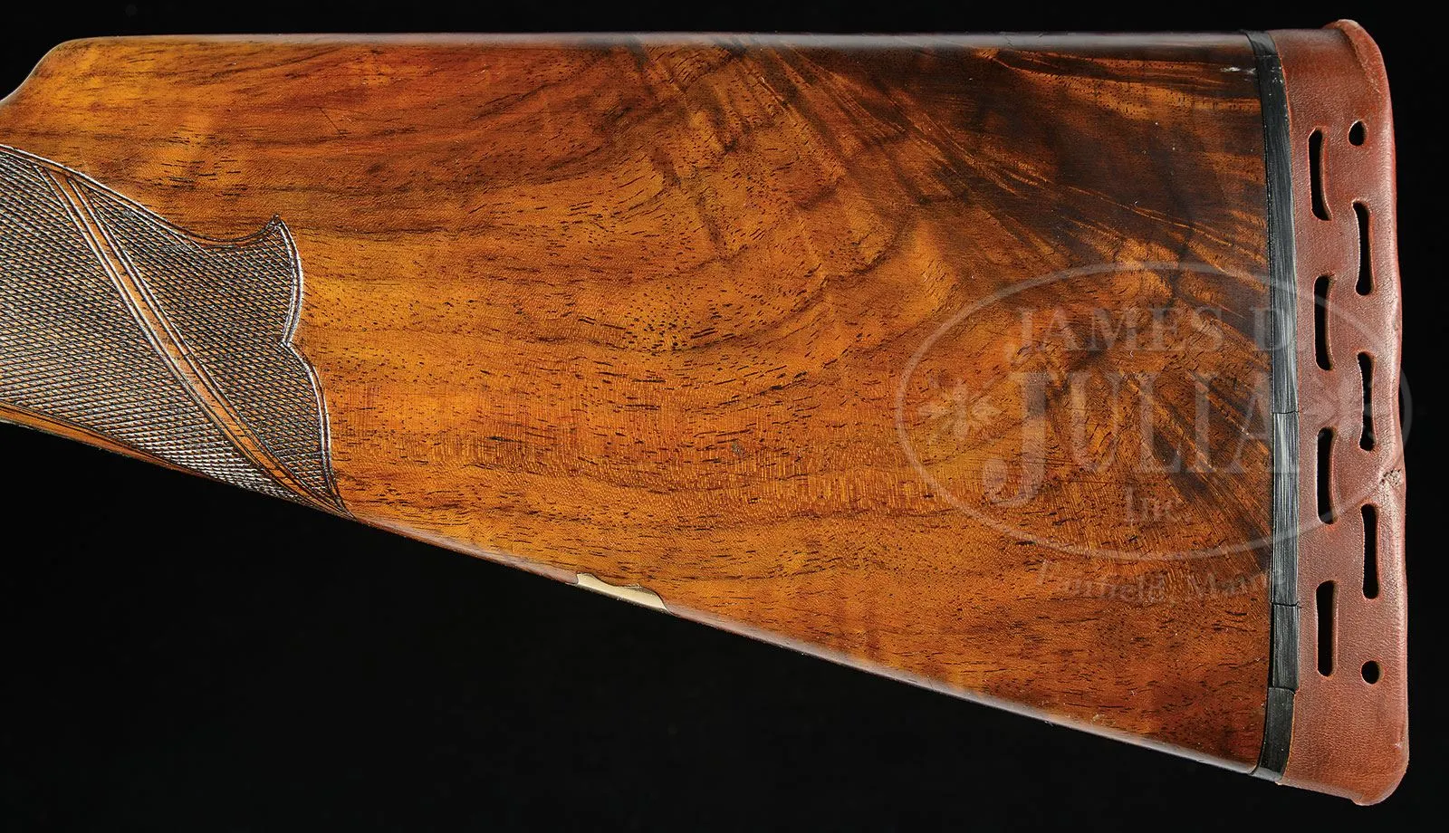SN 278008-T. Cal. 12 ga. 2-3/4″ Chambers. 30″ Mono-bloc bbl with raised, ventilated, matted rib has sides of mono-bloc engraved “Ithaca Gun Co” and “Ithaca, N.Y.” on each side surrounded by full coverage of interesting scrolled fig leaves and figs. Bbl flat is stamped with SN and “A”. Case hardened special Flues single trap action (in use between 1914 and 1922), is highly embellished with full coverage of scrolled fig leaves and figs with stippled background, continuing theme from bbls, surrounded by geometric borders. This unusual treatment outlines two-colored gold inlays of game birds on sides of action; a pair of ducks flying over a marsh are on left side, one duck in red gold, the other yellow. Cattails in distance are in yellow gold. A pair of pheasants, one red, one gold, are feeding in field on right side of action. Red gold heraldic eagle is on trigger plate surmounted by “MADE IN USA” in scrolled riband. Portrait of a mule deer graces trigger guard bow. Nicely crotch figured American walnut straight grip buttstock measures 14-1/8″ over open sided Jostam pad. Side panels are checkered with fleur-di-lis intrusions. Grip is checkered in fancy pattern with fleur-di-lis at drop points and ribbons through pattern. A vacant gold shield is on toe line. Large matching reverse tapered ejector forend has reinforcing bolt and push-button release. Bore diameter: .728. Bore restrictions: .033 (full). Minimum wall thickness: .040. Drop at heel: 2-1/8″, drop at comb: 1-9/16″. Weight: 7 lbs. 14 oz. LOP: 14-1/8″. CONDITION: Fine, as partially refinished. Bbl retains nearly all of a glossy re-black, slightly silvered, engraving slightly softened. Action retains a considerable amount of its orig case hardening color, actual percentage difficult to ascertain because of extensive engraving, but probably exceeds 50%. Stocks retain most of an old oil refinish with open grain. Later pad has cracked plate, and does not fit well. Forend shows repairs with inlet lighter wood triangles at rear, corresponding to mounting screws in iron, with matching triangle replacing normal dark wood at tip. Bore is excellent, lightly frosted. Action is tight. Ejector is strong. A very rare gun. Although records are not available for its entire production, only 9 were produced in this grade in 1921 and 1922. 4-53618 MGM221 (6,000-10,000) – Lot 2470