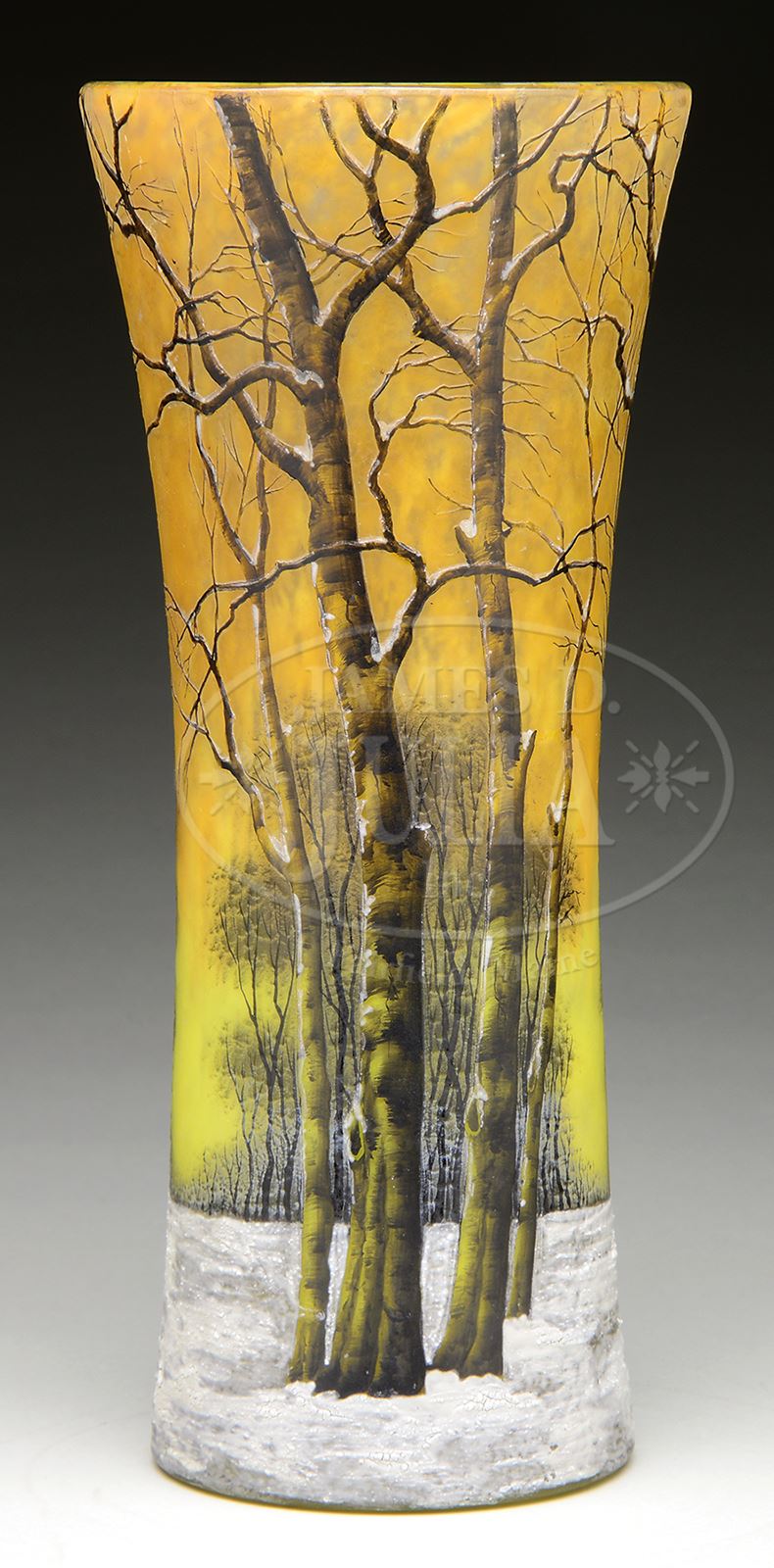 DAUM WINTER SCENE VASE.Large Daum winter scene vase has cameo barren trees rising from white enameled snow covered ground. Trees are beautifully enameled in shades of brown depicting tree bark and also decorated with white patches of snow clinging to trees. Vase is further decorated with black enameled tree outlines in distance. All against mottled yellow and orange background. Signed on underside in black enamel “Daum Nancy” with cross of Lorraine. SIZE: 11-3/4″ t. CONDITION: One tiny flea bite on top of lip, otherwise very good to excellent. 50501-32 (7,000-9,000) – Lot 2470