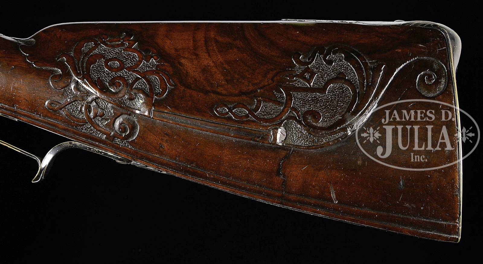 ATTRACTIVE ITALIAN FOWLING PIECE, CIRCA 1750.SN NSN. The plain lock with gooseneck cock and unbridled frizzen. Bbl of octagonal to rnd “Spanish form” with Pistoia mark. Thumb piece featuring the Italian eagle with a rabbit in its talons. Silvered mounts with acanthus leaf finials. Open work sideplate with monster. Figured full stock carved with strap work on a pebbled ground. An attractive Neopolitan fowling piece. PROVENANCE: Collection of Dr. Douglas Sirkin. CONDITION: Lockplate gray with evidence of old pitting. Frizzen reshod. Bbl cleaned metal with evidence of old pitting. Pistoia marks still retain their original brass. Silvered mounts retain much original silver, now black with tarnish. Stock carving good. Forend replaced from rear ramrod pipe forward. 4-49908 (2,000-4,000) – Lot 2472