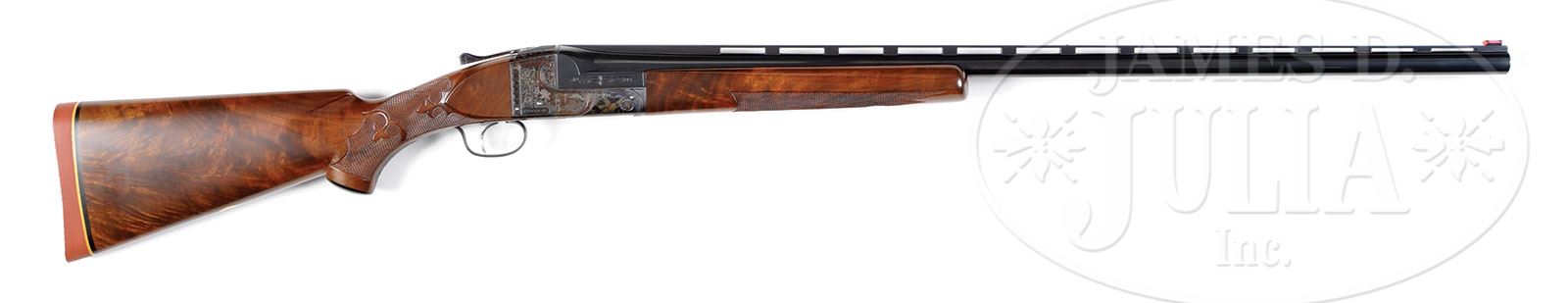 *POSSIBLY UNFIRED, SCARCE, LATE PRODUCTION, ITHACA GRADE 4 KNICK MODEL SINGLE BARREL TRAP GUN.SN 240405485. (1969) Cal. 12 ga. 2-3/4″ Chamber. 32″ bbl with raised, ventilated, matted rib has sides engraved with classic Ithaca shaded acanthus. Engine turned bbl flat is stamped with SN, chamber, and steel mark. Lump is stamped with grade and “K4577”. Case hardened action is stamped with SN, grade, caliber, and “Pat’d” on water table. Action is engraved with 40% coverage of shaded acanthus with geometric and wiggle borders outlining engravings of shooters on each side of action; an Indian draws bow on right, while a trap shooter takes aim on left. “Ithaca Gun Co” is on left, and “Ithaca NY” is on right. An engravers signature “ALPEN” is at rear of trap shooter. Trigger guard is also acanthus engraved. SN is at grip. Very fine crotch figured American walnut capped pistol grip buttstock measures 14-1/2″ over basket weave white line Pachmayr pad. Grip is checkered in fleur-di-lis pattern with fleur-di-lis and ribbons through checkering. A vacant gold oval is on toe line. Large matching reverse tapered ejector forend is point pattern checkered, has reinforcing bolt and Deeley type release. Bore diameter: .728. Bore restriction: .038 (full). Drop at heel: 2″, drop at comb: 1-1/2″. Weight: 8 lbs. 12 oz. LOP: 14-1/2″. PROVENANCE: William Hammond Collection. CONDITION: Flat flicking new.with only one or two of the faintest handling and assembly marks. One of the first of the 240 series single bbl traps. 4-53642 MGM242 (4,000-6,000) – Lot 2472