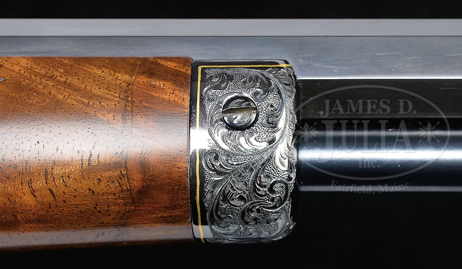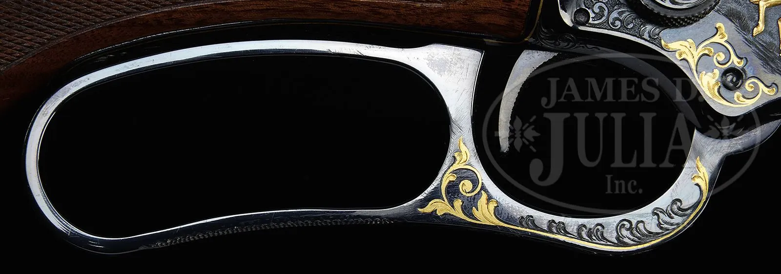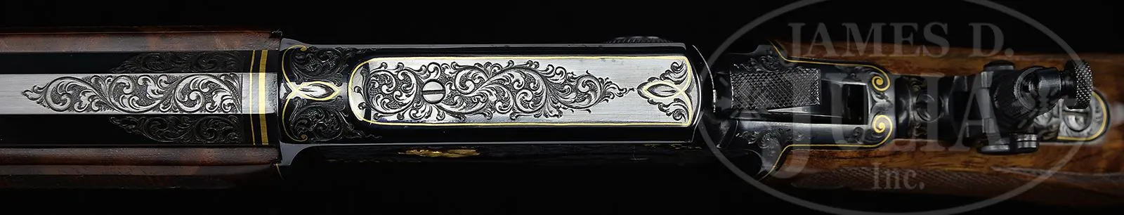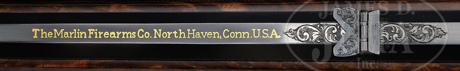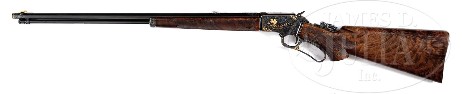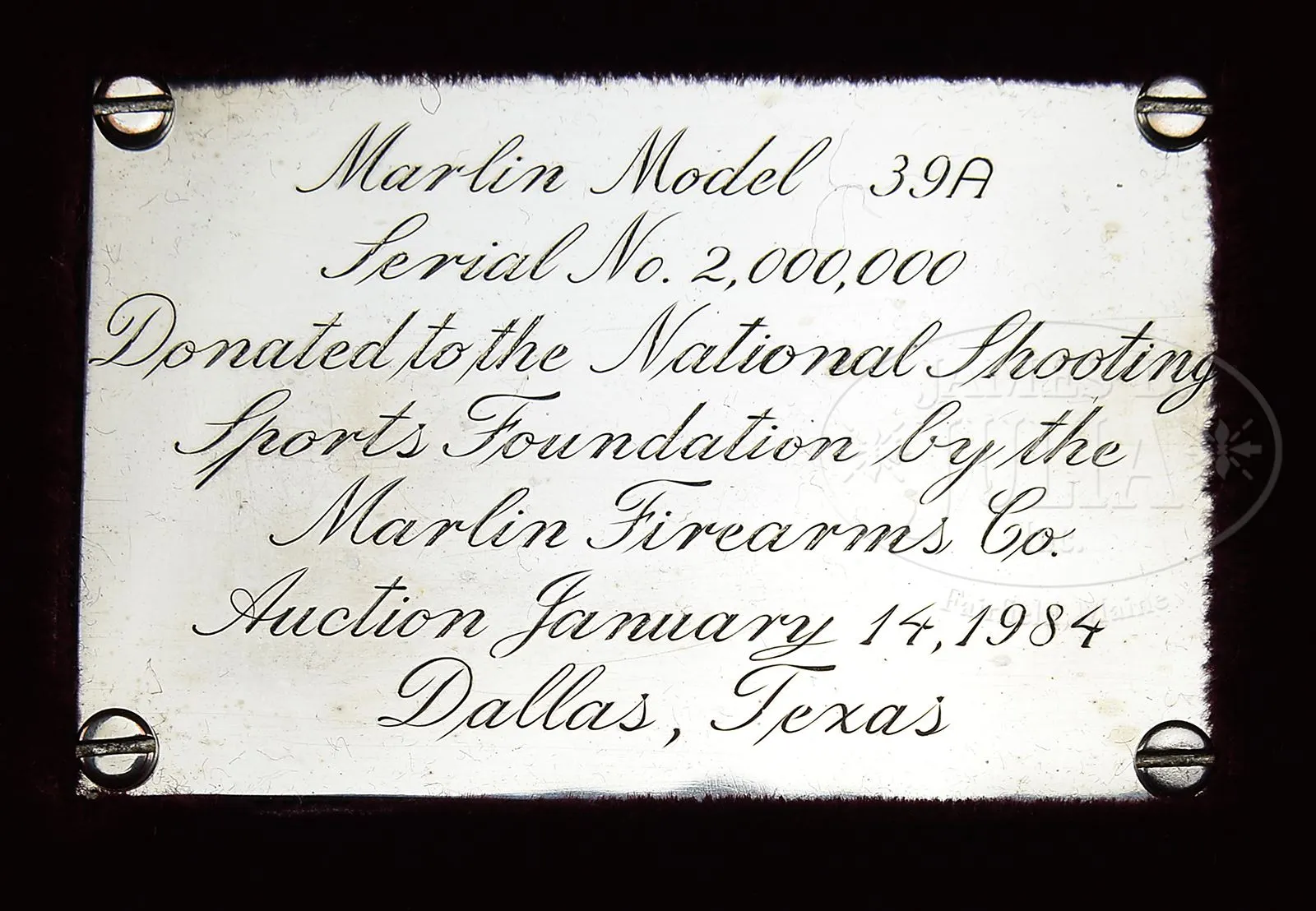 *EXTRAORDINARILY RARE, ONE OF A KIND ENGRAVED AND GOLD INLAID MARLIN MODEL 39A SERIAL NUMBER 2,000,000 DONATED TO THE NATIONAL SHOOTING SPORTS FOUNDATION.SN 2,000,000. Cal. 22. Spectacular little Marlin with 24″ tapered oct bbl, full magazine, gold washed Rocky Mountain front sight, Lyman 6A, 2-leaf folding rear sight and a locking Lyman tang sight. Mounted with spectacular, center crotch, flame grain American walnut with C-style checkered forearm and capped pistol grip buttstock that has full checkered Niedner steel buttplate. Checkering on the buttplate is about 34-lines per inch. Rifle is engraved and gold inlaid by renowned master engraver Alvin A. White. Receiver has full coverage, foliate arabesque patterns with a deep relief, raised gold squirrel on the left side along with “MARLIN GOLDEN 39A / No. 2,000,000” in gold in a ribbon below. The lever boss on the left side has a hidden screw which is engraved with the vignette of a running cottontail. The bottom left side and upper right side have inlaid gold foliate arabesque patterns and is half outlined in gold wire. Right side of receiver is inlaid with the incredible raised gold Marlin cowboy logo/trademark. Upper left of the right side is inlaid in gold “No. 2,000,000”. Bottom center and front right are also inlaid with gold foliate arabesque patterns. Outside face of the bolt is inlaid in gold leaf and vine patterns. Matching foliate arabesque patterns cover the remainder of the right side which extend over the top of the receiver, top and bottom tangs and about 2″ on top 3 flats of the bbl over the chamber area, around the rear sight, around the muzzle, forend cap and magazine band. The tall leaf on the rear sight is also engraved to match and the bbl address is inlaid in gold. Muzzle and breech ends of the bbl each have one wide and one narrow gold band inlay. Screws are all engraved as are the ends of the tang sight base. Both sides and face of the lever are engraved to match with inlaid gold leaf and vine patterns. Outer face of the finger loop, hammer spur and trigger are beautifully checkered. Tip of the finger loop is engraved in matching foliate arabesque patterns. Buttstock has a skeleton grip cap that is also engraved with gold wire inlay and has the incredibly detailed bust of John Mahlon Marlin (1836-1901). This is one of, if not the, most spectacular engraved Marlin rifles to ever come to market. This rifle appeared on the cover of the January 1984 issue of AMERICAN RIFLEMAN magazine. It was pictured, right side, along with a photograph of the grip cap and titled “Marlin’s Model 39 / Hits Two Million”. The right side of this rifle was also pictured on the cover of the Marlin Firearms Company catalog of 1984. Accompanied by reprints of two articles regarding Master Engraver Alvin White. Accompanied by its orig burgundy velvet lined walnut casing, donated at the same time as the rifle. Case is 44-1/4″ l x 12-1/8″ w x 3-1/2″ d with a full center brown leather inlay in the top, gold embossed with the Marlin name and Marlin rider logo/trademark. Interior is recessed for the rifle and has a covered compartment in the front which contains an integral velvet covered display stand. Front center of the interior has a silver plaque engraved “Marlin Model 39A / Serial No. 2,000,000 / Donated to the National Shooting / Sports Foundation by the / Marlin Firearms Co. / Auction January 14, 1984 / Dallas, Texas”. Right front of the case has another small plaque engraved “Engraving and gold inlay / by Alvin A. White / stock by the / Reinhart / Fajen / Co. / Warsaw, MO / Presentation Case by / Rosborg, Inc. / Newtown / CT”. Also accompanied by the orig green canvas zippered cover for the case and a functioning key. CONDITION: Extremely fine plus, new and unfired. Retains all of its crisp, orig, special, high luster finish on the metal and fine oil finish on the wood. Display case is equally new. 49505-3 JR (45,000-65,000) – Lot 2473 | Click here to view provenance