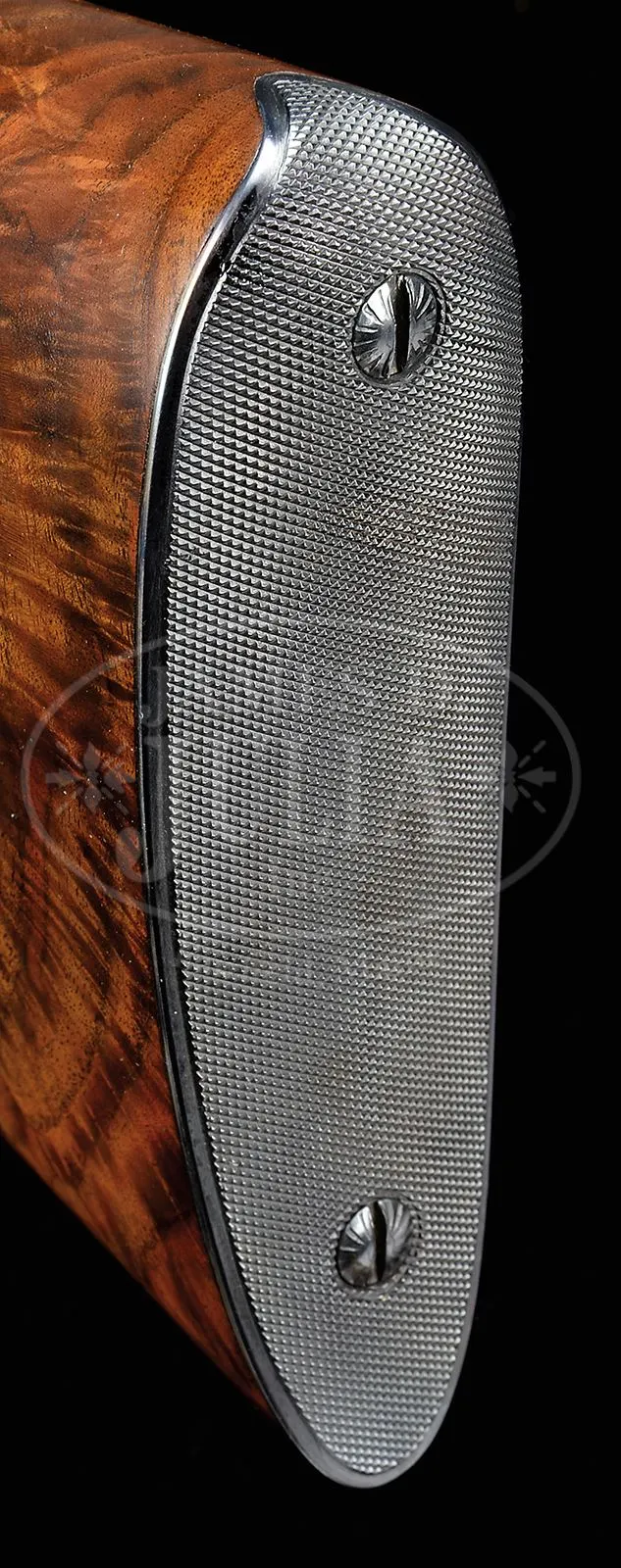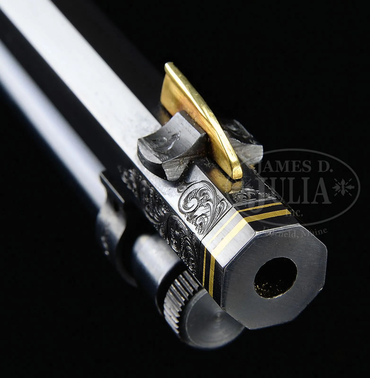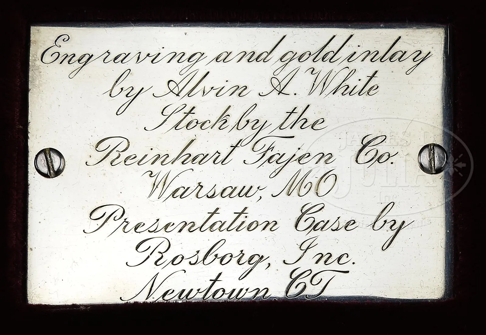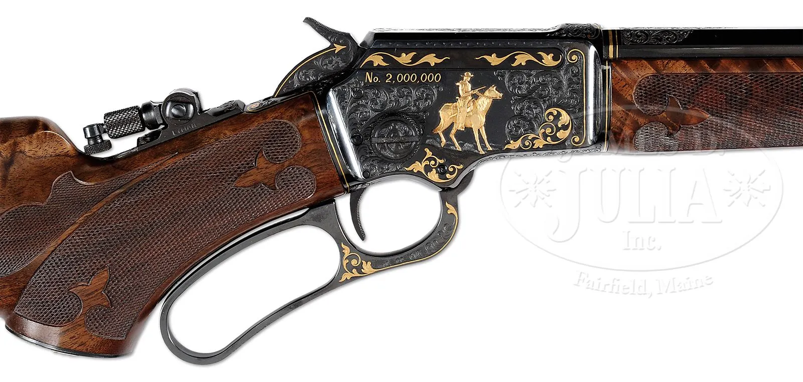 *EXTRAORDINARILY RARE, ONE OF A KIND ENGRAVED AND GOLD INLAID MARLIN MODEL 39A SERIAL NUMBER 2,000,000 DONATED TO THE NATIONAL SHOOTING SPORTS FOUNDATION.SN 2,000,000. Cal. 22. Spectacular little Marlin with 24″ tapered oct bbl, full magazine, gold washed Rocky Mountain front sight, Lyman 6A, 2-leaf folding rear sight and a locking Lyman tang sight. Mounted with spectacular, center crotch, flame grain American walnut with C-style checkered forearm and capped pistol grip buttstock that has full checkered Niedner steel buttplate. Checkering on the buttplate is about 34-lines per inch. Rifle is engraved and gold inlaid by renowned master engraver Alvin A. White. Receiver has full coverage, foliate arabesque patterns with a deep relief, raised gold squirrel on the left side along with “MARLIN GOLDEN 39A / No. 2,000,000” in gold in a ribbon below. The lever boss on the left side has a hidden screw which is engraved with the vignette of a running cottontail. The bottom left side and upper right side have inlaid gold foliate arabesque patterns and is half outlined in gold wire. Right side of receiver is inlaid with the incredible raised gold Marlin cowboy logo/trademark. Upper left of the right side is inlaid in gold “No. 2,000,000”. Bottom center and front right are also inlaid with gold foliate arabesque patterns. Outside face of the bolt is inlaid in gold leaf and vine patterns. Matching foliate arabesque patterns cover the remainder of the right side which extend over the top of the receiver, top and bottom tangs and about 2″ on top 3 flats of the bbl over the chamber area, around the rear sight, around the muzzle, forend cap and magazine band. The tall leaf on the rear sight is also engraved to match and the bbl address is inlaid in gold. Muzzle and breech ends of the bbl each have one wide and one narrow gold band inlay. Screws are all engraved as are the ends of the tang sight base. Both sides and face of the lever are engraved to match with inlaid gold leaf and vine patterns. Outer face of the finger loop, hammer spur and trigger are beautifully checkered. Tip of the finger loop is engraved in matching foliate arabesque patterns. Buttstock has a skeleton grip cap that is also engraved with gold wire inlay and has the incredibly detailed bust of John Mahlon Marlin (1836-1901). This is one of, if not the, most spectacular engraved Marlin rifles to ever come to market. This rifle appeared on the cover of the January 1984 issue of AMERICAN RIFLEMAN magazine. It was pictured, right side, along with a photograph of the grip cap and titled “Marlin’s Model 39 / Hits Two Million”. The right side of this rifle was also pictured on the cover of the Marlin Firearms Company catalog of 1984. Accompanied by reprints of two articles regarding Master Engraver Alvin White. Accompanied by its orig burgundy velvet lined walnut casing, donated at the same time as the rifle. Case is 44-1/4″ l x 12-1/8″ w x 3-1/2″ d with a full center brown leather inlay in the top, gold embossed with the Marlin name and Marlin rider logo/trademark. Interior is recessed for the rifle and has a covered compartment in the front which contains an integral velvet covered display stand. Front center of the interior has a silver plaque engraved “Marlin Model 39A / Serial No. 2,000,000 / Donated to the National Shooting / Sports Foundation by the / Marlin Firearms Co. / Auction January 14, 1984 / Dallas, Texas”. Right front of the case has another small plaque engraved “Engraving and gold inlay / by Alvin A. White / stock by the / Reinhart / Fajen / Co. / Warsaw, MO / Presentation Case by / Rosborg, Inc. / Newtown / CT”. Also accompanied by the orig green canvas zippered cover for the case and a functioning key. CONDITION: Extremely fine plus, new and unfired. Retains all of its crisp, orig, special, high luster finish on the metal and fine oil finish on the wood. Display case is equally new. 49505-3 JR (45,000-65,000) – Lot 2473 | Click here to view provenance